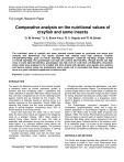 African Journal of Food Science and Technology (ISSN: 2141-5455) Vol. 4(1) pp. 9-12, January, 2013 Available Online http://www.interesjournals.org/AJFST Copyright©2013 International Research Journals Full Length Research Paper Comparative analysis on the nutritional values of crayfish and some insects 1 S. M. Ahmad, *1U. A. Birnin-Yauri, 1B. U. Bagudo and 2D. M Sahabi 1 Department of Chemistry, Usmanu Danfodiyo University, Sokoto. Department of Biochemistry, Usmanu Danfodiyo University, Sokoto. 2 Accepted January 16, 2013 The nutritional value of crayfish and some selected insects based on proximate and amino acid contents was determined. The results showed that crayfish have high moisture. Crayfish (10.33±0.29mg/100g), grub (6.17±0.58 mg/100g) grasshopper (1.83±0.29 mg/100g) winged termite (1.17±0.29 mg/100g). The grasshopper has high ash content (28.17±0.29%). Winged termite has high value of crude lipid (52.0±0.50%). grasshopper has high level of crude fibre (10.40±0.29%). Seventeen amino acids were analysed in the crayfish and three insects with glutamic acid, aspatic acid, arginine and leucine protein, being the predominant amino acids. Iett is concluded that these insects could serve as a good nutritional supplement of balanced diet. Keywords: Crayfish, nutritional and amino acids. INTRODUCTION The search for alternative source of food nutrient remains a perpetual event as human population growth is dynamic and ever increasing under – exploitation and under-utilisation of abundant alternative natural resources has now been recognised as one of the militating factors against nutrient glut as intended by the ‘creator’. The consumption of selected insects in diverse forms is a positive response to this imperative. Yoloye (1988) has reported that insects are the most successful prolific group in animal kingdom, constituting about 76% of known species of surviving animals. Insect and meat play the same role in the human body. As food, some insects are regular in the village but meat as a stranger (Muyay, 1981). Most people in tropical Africa collect insects for food. The habit is especially well developed among the cultivators of the forest region. It is uncertain whether these insects are eaten because of their nutritional qualities. The aversion to insects as human food among Europeans is nothing more than custom and prejudices (Owen, 1973). Crayfish sometime called craw fish are fresh water crustacean resembling small lobsters (procambarus clarkia). *Corresponding Author Email: uabyauri@yahoo.com. Winged termites, macrotermes bellicossus, are eaten in several parts of western Nigeria. The winged adults are usually caught while on their nuptial flight or collected the ground after they have shed their wings and then roasted for eating. Macrotermes bellicosis simply called “Termite” in most Nigerian communities is a gregarious insect, which in Nigeria, is commonest during the rainy season (Owen, 1973). The Grasshopper, zonocerus variegatus (Linn.) (Orthoptera: pyrgomorphidae), which has a large dry season population in south-western Nigeria is reported eaten in the Akoko area of Ondo State (Fosoranti and Ajiboye, 1993). The Grubs, Rhynchophorus phoenicis are fried and eaten in several parts of western Nigeria and in Delta and Edo State, where active marketing of the fried grubs takes place. Imbrasia belina is the emperor moth. In its caterpillar stage, it is known as the mopane worm and is a popular part of diets in Botswana, Northern South Africa, Zimbabwe and Namibia (Saun ders, 1994). MATERIALS AND METHODS The Grubs and winged termites were obtained from the cow market at Yelwa in Yauri Local Government Area, Kebbi State, Nigeria. While the grasshopper and Crayfish were obtained from the central market of Sokoto town, 10 Afr. J. Food Sci. Technol. Sokoto State, Nigeria. All the samples were identified by Zoologists at the Zoology Unit of the Department of Biological Sciences, Usmanu Danfodiyo University Sokoto, Nigeria. fibre by acid and alkaline digestion methods with 20% H2 SO4 and NaOH solution. Amino acid analysis Sample treatment The grub samples were washed with water and removed the head and manure from the body and then subjected to sun dry for a week. The dried body was ground into powdered with pestle and mortar and kept in polythene container ready for proximate and amino acid analysis. Winged termite were also subjected to sun for drying for at least a week. The wings was removed from the body after drying and then ground in to powder with pestle and mortar and kept in a container for the analysis. Grasshopper was bought in dried form from the market and wings was removed then ground in to powdered and kept in a container for analysis. Crayfish was also bought in dried form from the market and ground in to powdered and kept in a container for analysis. Proximate analysis Proximate analysis of the samples (Moisture content ash content, crude lipid content and crude fibre content) was carried out according to the standard methods as recommended by the Association of Official Analytical Chemists (AOAC, 1990). Moisture content 2g of each sample were put into the crucible, dried in an 0 oven (Leniscope, England) at 105 c overnight. The dried samples were cooled in a dessicator for 30 minute and weighed. The percentage loss in weight was expressed as percentage moisture content (AOAC, 1999). Amino acid determination carried out using amino acid analyser, TSM (Technicon Instruments Corporation, Dublin, Ireland) as reported in Adeyeye and Afolabi (2004). 2g of each sample defatted with petroleum ether using soxhlet extractor. The defatted sample was re-dried and milled into fine powder using porcelain pestle and mortar. 30mg sample were weighed in to a glass 3 ampoules to which 5cm of 6mHcl and 5µmoles norcleucine were added. The ampoule were evacuated by passing nitrogen gas (to remove oxygen so as to avoid possible oxidation of some amino acids during hydrol