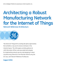 GE's Intelligent Platforms business & CISCO Systems Inc. Architecting a Robust Manufacturing Network for the Internet of Things Network Reference Architecture The Internet of Things (IoT) is creating disruptive opportunities that will define a new set of winners and losers in the industrial space. This white paper provides guidance to chief information officers and associated technologists for implementing network security and designing a robust manufacturing network for the Industrial Internet using the GE-Cisco Joint Network Reference Architecture. August 2015 Contents 03Abstract 03 03 03 04 The forces of change Pace of change Opportunity for competitive agility The IoT and II 05 The GE-Cisco Joint Network Reference Architecture 05 05 06 06 07 09 11 11 12 12 13 13 13 Why GE and Cisco are providing this capability Enterprise-class networks with industrial-class form factors Performance, scale and manageability Network segmentation Firewall, IPS, and data diodes Identity networking Encryption IP address reuse Wireless services Location services RF integrity Wireless security Rich media services, compute and cloud 14Conclusion 15Glossary 17 Further Reading 17Contacts Table of Figures 05 07 08 09 10 11 12 2 Figure 1: Overall Plant Network Architecture Figure 2: Plant Network Segmentation Figure 3: Plant Network Security Logical Architecture Figure 4: Plant Network Security Virtualization Figure 5: Plant Network Dynamic Port Provisioning Figure 6: Plant Network Physical Architecture Figure 7: Plant Network Wireless Architecture Architecting a Robust Manufacturing Network for the Internet of Things Abstract The Internet of Things (IoT) is creating disruptive opportunities that will define a new set of winners and losers in the industrial space. This white paper provides guidance to chief information officers and associated technologists for implementing network security and designing a robust manufacturing network for the Industrial Internet using the GE-Cisco Joint Network Reference Architecture. This white paper proposes an approach to networks in manufacturing environments, introduces recommended architectures, describes the components of a sound industrial network and highlights areas for special attention, as well as illustrates ancillary benefits when deploying such architectures. Opportunity for competitive agility Consider the opportunity for competitive agility as: • Previously unconnected devices become connected to each other in machineto-machine (M2M) networks and to enterprise reporting and predictive analytics, providing unprecedented realtime feedback on product performance, service and maintenance; • IT hardware needs are reduced as virtualization removes the need to deploy physically separate networks while still achieving a highperformance and secure environment for manufacturing mission-critical plant floor applications; • IT maintenance overheads are reduced as manufacturing applications move to private and public cloud; The forces of change The maturing of the Industrial Internet and the rapid connectivity of devices to internal networks and the Internet are creating fundamental change and significant opportunities for manufacturers. These changes are resulting in the increased need for improved connectivity, network security and management capabilities. Pace of change Change is happening at orders of magnitude faster than it did 10 years ago. Startups can develop a product on the back of a credit card and go viral overnight. Traditional industries have been turned upside down, creating a new set of winners and losers. Consider the following examples: • Retail—Amazon threatens brick-andmortar establishments. • Advertising—Google alters Madison Avenue with targeted web advertising. 3 • Hospitality—Airbnb exercises underutilized assets to turn homes into hotels. • Transportation—Uber circumvents a regulated cab industry. Similar forces are impacting manufacturing. Take, for example, the flattening of networks. Social networks provide instantaneous insight into customer sentiment, allowing manufacturers to get a jump on product changes. Natural disasters and geopolitical unrest can shift logistics networks overnight, forcing rapid reactions in manufacturing planning. Similarly, the networks that move data within your manufacturing environment are flattening as Internet Protocol is brought to the control interface and embedded in “smart instruments.” The flattening of the manufacturing network creates opportunities for a more inclusive and responsive plant. Architecting a Robust Manufacturing Network for the Internet of Things • These new insights are now shared across the enterprise to enable more than just control, but also can help boost yield, performance, quality and reduce waste; • And business decisions can be made quickly by analyzing vast data farms, making actionable data available to the user’s device of choice. For manufacturers, these insights enable a cycle of continuous plant improvements for: • Shortening warranty investigation time • Cutting work-in-process inventory • Reducing manufacturing costs • Improving product cycle times • Decreasing rework and scrap • Reducing uncertainty in the supply chain Leading manufacturers have already realized the benefits of real-time, shop-floor-to-business systems connectivity through • Common skill sets across information technology (IT) and operations technology (OT) technicians • Secure data flow between the plant floor and the cloud • Real-time plant floor visibility to enterprise planning tools • Reduced downtime with proactive and preemptive maintenance planning • Manufacturing agility that makes a “lot size of 1” achievable • Insight and control over energy and utilities in real time • Visibility and control of remote facilities and resources The IoT and II The Internet of Things (IoT) is a concept in which everyday objects have network connectivity, all