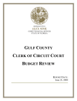 REPRESENTING ALEX SINK CHIEF FINANCIAL OFFICER STATE OF FLORIDA GULF COUNTY CLERK OF CIRCUIT COURT BUDGET REVIEW REPORT DATE: June 23, 2008 TABLE OF CONTENTS INTRODUCTION 1 SUMMARY 1 SCOPE, OBJECTIVES AND METHODOLOGY 2 Scope Objectives and Methodology 2 2 FINDINGS AND RECOMMENDATIONS 5 REVIEW TEAM 5 APPENDIX Budget Review Engagement Letter Clerk’s Response A B ALEX SINK CHIEF FINANCIAL OFFICER INTRODUCTION The Department of Financial Services (DFS) has completed a review of the budget certifications made by the Gulf County Clerk of Circuit Court’s Office to the Clerks of Court Operations Corporation (CCOC), pursuant to Section 28.35(3)(b), Florida Statutes (F.S.). The scope of our review focused on validating the processes and methodologies utilized in the development of the Clerk’s budgets for fiscal years 2005-2006 (FY 05-06), 2006-2007 (FY 06-07) and 2007-2008 (FY 07-08). The Chief Financial Officer (CFO) has contracted with CCOC to establish a process for review and certification of court-related budgets submitted by the Clerks of Circuit Courts. The CCOC is responsible for calculating the maximum authorized annual budget, identifying budgets exceeding the maximum expenditure amounts for a standard list of court-related functions and identifying budgets that have insufficient revenues to cover court-related expenditures, pursuant to Section 28.36, F.S. SUMMARY • The FY 05-06, FY 06-07 and FY 07-08 approved budgets were $421,290, $432,944 and $471,914 respectively. • Gulf County has a population of 16,730 and had 8.41, 8.77, and 8.96 Full Time Employees (FTEs) budgeted to support court-related activities for FY 05-06, FY 06-07 and FY 07-08 respectively. • Budgeted revenues and expenditures for FY 05-06 were $346,558 and $421,290 respectively, resulting in a budgeted deficit of $74,732. Actual revenues and expenditures as reported by the Clerk for FY 05-06 detailed a surplus of $50,657. The Clerk remitted the FY 05-06 surplus to the Department of Revenue (DOR) on December 19, 2006 for deposit in the General Revenue Fund, pursuant to the provisions of Section 28.37(4), F.S. • Budgeted revenues and expenditures for FY 06-07 were $354,451 and $432,944 respectively, resulting in a budgeted deficit of $78,493. Actual revenues and expenditures as reported by the Clerk for FY 06-07 detailed a surplus of $42,573. The Clerk remitted the FY 06-07 surplus to DOR on December 21, 2007 for deposit in the General Revenue Fund, pursuant to the provisions of Section 28.37(4), F.S. 1 • Budgeted revenues and expenditures for FY 07-08 are $389,642 and $471,914 respectively, resulting in an $82,272 budgeted deficit. Monthly payments from the Clerks of the Court Trust Fund are scheduled to fund the Clerk’s projected deficit pursuant to CCOC directive. • The Clerk has an internal system and reporting procedures for measuring and reporting on all required performance standards. SCOPE, OBJECTIVES AND METHODOLOGY Scope The Scope of our review included an analysis of the development of the Clerk’s FY 05-06, FY 06-07 and FY 07-08 budgets. Our review was conducted on April 9 - 11, 2008 at the Gulf County Clerk of Circuit Court’s Office. Objectives and Methodology The budget review was conducted with the following objectives: • Each Clerk shall develop a budget funded from fees, services charges, court costs and fines, pursuant to Sections 28.35, 28.36 and 28.37, F.S. Clerks must provide detailed information on expenditures necessary for the performance of court-related functions using the court-related codes in the Uniform Accounting System Manual (UASM). The budget shall be submitted annually to CCOC for review and approval. The CCOC budget approval process focuses on the following key components: o Overhead Cost Allocation – The Gulf County Clerk’s Office applied a 46.72 and 46.17 percent cost allocation rate to the FY 05-06 and FY 06-07 certified annual budgets. A 47.18 percent cost allocation rate is being utilized for the FY 07-08 budget. o Our review of supporting documentation disclosed that the methodologies used to calculate and distribute overhead costs were reasonable. o Distribution of Court-Related FTEs – The Gulf County Clerk’s Office budgeted 8.41 of 18.00, 8.77 of 19.00 and 8.96 of 19.00 FTEs for FY 05-06, FY 06-07 and FY 07-08 respectively, to support court-related functions. o General Fund Expenditures – The final approved budget for FY 05-06 was $421,290 which included a budget reserve of $17,756. Major expenditure categories were: Personal Services ($321,000), Operating Expenses ($63,187) and Capital ($19,347). The final approved budget for FY 06-07 was $432,944. Major expenditure categories were: Personal Services ($403,642) and Operating Expenses ($29,302). The final approved budget for FY 07-08 was $471,914. Major expenditure categories are: Personal Services ($415,069) and Operating Expenses ($56,845). 2 o Revenue Forecasting – Budgeted revenues of $346,558, $354,451 and $389,642 were calculated for FY 05-06, FY 06-07 and FY 07-08 respectively, based on prior period data and management’s assessment of future operational activities. o Our review determined that the Clerk’s FY 05-06, FY 06-07 and FY 07-08 budgets were prepared pursuant to CCOC instructions and submitted in accordance with the provisions of Section 28.36, F.S. • Expenditures during the review period were limited to court-related functions as specified in Section 28.35(4)(a), F.S. • Revenues for fees, services charges, court costs and funding for court-related functions for FY 05-06 and FY 06-07 were assessed pursuant to the provisions of Chapter 28, F.S. The Clerk’s budget for FY 07-08 was based on projected revenues from the same sources, pursuant to Section 28.36, F.S. • Clerks are required to maintain a partial fee payment system, pursuant to Section 28.246, F.S. The Gulf County Clerk’s Office is currently utilizing an internal database system to account for partial fee pa