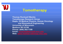 Tomotherapy Thomas Rockwell Mackie Tomotherapy Research Group Depts. Of Medical Physics, Human Oncology and Biomedical Engineering University of Wisconsin Madison WI 53706 Phone: (608) 262-7358 Email: trmackie@facstaff.wisc.edu Web: www.madrad.radiology.wisc.edu Contributors to this Talk • • • • • • • • • • Gustavo Olivera Paul Reckwerdt Jeff Kapatoes Ken Ruchala John Balog Richard Schmidt Ed Fitchard Dave Pearson Eric Schloesser Ray MacDonald • • • • • • • • • • Robert Jeraj Minesh Mehta Mark Ritter Jack Fowler Harry Keller Weiguo Lu Jeni Smilowitz Wolfgang Tomé Rufus Scrimger Lisa Forrest Financial Disclosure In addition to a University of Wisconsin Professor, I am a co-founder of TomoTherapy Inc. (Middleton WI) which is participating in the commercial development of helical tomotherapy. TomoTherapy’s 1,400 m2 Middleton facility. www.tomotherapy.com Outline • • • • • • • • Optimization ® IMRT ® Conformal Dose Distributions Sequential (or Serial) Tomotherapy (NOMOS Peacock™) Clinical Helical Tomotherapy Unit Dosimetry of Helical Tomotherapy Examples of Tomotherapy Dose Distributions Megavoltage Computed Tomography (MVCT) Adaptive Radiotherapy Clinical Implications Optimization ® IMRT ® Conformal Dose Distributions Anders Brahme first showed that intensity modulated fields of radiation would lead to more conformal dose distributions that would spare normal tissue. IMRT Using Conventional MLC’s Siemens Varian Elekta Sequential Tomotherapy The First Form of IMRT NOMOS Peacock System X-Ray Beam Binary MLC Leaves Binary Multileaf Collimator Courtesy: NOMOS Corporation Simulated Annealing Optimization MIMiC Multileaf Intensity Modulating Collimator From Bruce Curran, NOMOS Individual leaf controls opening 68 Gy 60 Gy 50 Gy 30 Gy Bi-Lateral 3D-CRT From Bruce Curran, NOMOS 85Gy 70Gy 60Gy 50Gy 30Gy 7-Field IMRT (Planned with Corvus) Sequential Tomotherapy (Nomos Peacock) From Bruce Curran, NOMOS GTV Dose Volume Histogram 120 100 Volume (%) 80 GTV_Corvus GTV_Peacock 60 GTV_3DCRT GTV_Bilateral 40 20 0 0 20 40 60 80 100 Dose (Gy) From Bruce Curran, NOMOS Chiasm Dose Volume Histogram 120 Chiasm_Corvus 100 Chiasm_Peacock Chiasm_3DCRT Volume (%) 80 Chiasm_Bilateral 60 40 20 0 0 20 40 60 80 100 120 Dose (Gy) From Bruce Curran, NOMOS Brain stem Dose Volume Histogram 120 Stem_Corvus Stem_Peacock 100 Stem_3DCRT Stem_Bilateral Volume (%) 80 60 40 20 0 0 20 40 60 80 100 Dose (Gy) From Bruce Curran, NOMOS Parotid Dose Volume Histogram 120 Parotid_Corvus Parotid_Peacock 100 Parotid _3DCRT Parotid_Bilateral Volume (%) 80 60 40 20 0 0 20 40 60 80 100 Dose (Gy) From Bruce Curran, NOMOS Role of Beam Configuration All results for 7 beam directions except where otherwise noted. Detailed dependency upon the number of beam directions is shown in the next table. Dependency Upon Number of Beam Directions Mean Dose Total Integral to the Dose Region at Risk 0.124 Minimum Dose Covering 90% of the Target (1.0=max) 0.747 0.488 2733 0.318 0.090 0.814 0.215 2564 7 0.242 0.064 0.867 0.206 2597 9 0.222 0.064 0.855 0.192 2599 11 0.202 0.058 0.879 0.186 2570 15 0.187 0.053 0.908 0.180 2542 21 0.176 0.049 0.912 0.171 2545 33 0.151 0.038 0.933 0.155 2544 Number of Beam Directions Objective Function Value Standard Deviation in the Target Dose 3 0.665 5 Nasopharyngeal Example In this case the primary goal was to avoid the parotid and spinal cord. With the same amount of avoidance, the 45 angle delivery (tomotherapy) provided a more homogeneous delivery. Re-Engineering Radiotherapy • • • • • • • • • Equipment and processes re-engineered for IMRT Integration of planning, delivery and verification Better leaf resolution Simple MLC’s More beam directions Single energy photon beam Better primary shielding Tomographic verification Helical tomotherapy was the result Helical (Spiral) Tomotherapy Ring Gantry Linac CT Detector CT Couch Helical Fan Beam Helical Scanning Animation of Helical Delivery 64 Leaf Binary MLC Close-Up Movie Clips of the MLC Being Tested Close-Up UW Clinical Helical Tomotherapy Unit Siemens Linac GE CT Detector Siemens RF System GE Gantry May 2000 at UW Physical Sciences Laboratory, Stoughton WI Siemens 6 MV Linac System Linac and Gun Control RF System Clinical Installation Finished January 16, 2001 at UW Radiotherapy Clinic Major Specifications • • • • • • • • • • • 6 MV Siemens linac Up to 8 Gy/min @ axis 85 cm diameter gantry bore 64 leaves with 6.25 mm resolution @ axis 4 cm x 40 cm maximum field @ axis Slice field width from 5 mm to 40 mm @ axis Minimum beamlet size 5 mm x 6.25 mm @ axis Xenon CT detectors with per pulse acquisition 0.25 mm precision CT couch Leaves 10 cm thick, 95% tungsten alloy Primary collimator 22 cm thick 95% tungsten alloy Fan Beam Characteristics • The fan field width along the longitudinal direction is continuous from 5 mm to 50 mm. • There is no field flattening filter in the beam and so the beam has a higher intensity along the center as compared to either end. • The beam without filtration is like the output from a CT “Bowtie Filter”. 1 cm Image Digitized from Kodak XV Film 40 cm Profile Along Length of a 1 cm Wide Fan Beam Transverse Profile 120 100 Dose (%) 80 60 40 20 0 -240 -180 -120 -60 0 60 Distance (m m ) 120 180 240 Monte Carlo Model of the Treatment Head Target Electron Stopper Electron Beam from the Accelerator Beam Hardener Monitor Chamber Primary Collimator and Jaws Photon Spectrum 1.0 Tomotherapy (6MV) 2100 Clinac (6MV, Stanford) Spectrum [%] 0.8 0.6 0.4 0.2 0.0 0 1 2 3 4 Energy [MeV] 5 6 Clinac 2100 Monte Carlo data courtesy of Dr. Charlie Ma For the same incident energy, tomotherapy has a harder spectrum due to its beam hardener and absence of a field flattening filter. Off-Axis Energy Dependence 0.040 0.035 0-5 cm 5-10 cm 10-15 cm 15-20 cm 0.025 0.01 Photon spectrum Photon spectrum 0.030 0-5 cm 5-10 cm 10-15 cm 15-20 cm 0.020 0.015 0.010 1E-3 0.005 0.000