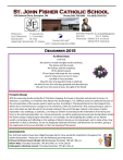 December 2015 An Advent Prayer Lord God, We seek You in both the light and the darkness, The silence and the sounds, The fullness and the emptiness of this Advent season. Fill our hearts with hope for Your coming, Love for those who are most in need, and faith in Your promises. May this time of preparation help us celebrate the birth of Your Son with deep gratitude and abundant joy. We ask this in the name of Jesus, the Light of the World. Principal’s Message With the upcoming hustle and bustle of Christmas shopping, the house to decorate and presents to wrap, it is important, as Catholics, to remember that Advent has already begun. It is a difficult season to celebrate because of the commercialism of the secular world in which we live. According to The General Norms for the Liturgical Year, Advent has a two-fold nature: It prepares us for Christmas, when we recall Christ’s first coming among us, and it is also a time when we look forward to His second coming at the end of the ages. Advent is the season of joyful expectation. Our challenge, as Catholics, is to help our children to look beyond the materialism of Christmas and focus on the spiritual preparation. As a school community, we will be exploring many avenues during Advent amidst the frantic energy of preparing for December 25. For example, we will be lighting the candles on our Advent wreath, and praying and reflecting on the readings of Advent during our morning prayers, just to name a few. How wonderful it is that as Christians, we do not liturgically celebrate Christmas until December 25 and after, giving us the opportunity to focus our attention on the true meaning of the season! Upcoming Events Our staff and students have been diligently preparing for many wonderful celebrations throughout the month of December. Please join us for the following upcoming events: Primary Christmas Concert (Grade 1-3):Wednesday December 16th @ 7:00 p.m. Advent Mass: Thursday December 17th @ 10:00 a.m. in the Church Kindergarten Christmas Concert: Thursday December 17th @ 1:30 p.m. Ways of Christmas Giving at St. John Fisher As Christmas approaches, we ask that you remember families less fortunate than yourself in your holiday plans. While preparing for festive Christmas celebrations with your friends and family, it’s important to stop and reflect on the joy and blessings in your own life while also being aware that not everyone is so fortunate. Please help the St. John Fisher community by participating in one or more of the following activities: Mitten Tree: Starting December 1st, please help us keep our students’ hands warm by donating mittens to the Mitten tree in the front foyer. Candy Canes: Candy canes will be on sale for 50¢ each during the week of December 7th– 11th. All money collected will go towards providing families in need in our community with gifts for Christmas. Fun Fair: On December 9h, our gym will be transformed into a fair where students can play fun games for only 25¢ each game. Loot bags will sell for $2.00 and entry into candy slide raffle is $1.00. Good Deed Angels: Students can do good deeds at home to earn money. Students then donate the money they earned to purchase items for Christmas baskets for families in need in our community. A separate letter will be going home to further explain/participate in this. Primary Christmas Concert: On Wednesday December 16th, the primary students will be performing a Christmas concert. In lieu of tickets, we ask that each person in attendance bring a non-perishable food item to donate to our local food bank. Food Drive: From December 1st to 16th, students are encouraged to bring in non-perishable food items which will be donated to our local food bank. Christmas Holidays Christmas break is from Monday December 21st to Friday January 1st . The last day of school is Friday December 18th. The first day of school in the new year will be Monday, January 4th, 2016. Full Day Kindergarten Registration Please see below for upcoming dates for Full Day Kindergarten Registration for students starting in the fall of 2016. Monday, January 25th, 2016 from 7:00 p.m.- 9:00 p.m. Snow date: Tuesday January 26th, from 7:00 p.m.-9:00 p.m.) Wednesday January 27th, 2016 from 9:00 a.m.—3:00 p.m. Thursday January 28th, 2016 from 9:00 a.m.—3:00 p.m. Friday January 29th, 2016 from 9:00 a.m.—3:00 p.m. Eco School: Electronic Communication We are pleased to share that we currently have approximately 120 families signed up for electronic newsletters and communication. However, we still have more than 250 families who still receive paper-based communication from the school. Please help us to meet our eco-goal of reduced paper consumption by signing the form (Canada’s AntiSpam Legislation Consent Form) on the last page of this newsletter. We thank you for your support in making SJF a eco-friendly school!! No Outside Food Brought Into School Parents, please be advised that we do not allow any outside food brought into the school for birthday parties or other student celebrations. There are pupils and staff in attendance who suffer from severe and life threatening allergies to certain foods, such as peanut and nut products. Exposure to even the smallest quantities can cause severe life threatening reactions. Please make sure that all of your children’s caregivers are aware of the food restrictions. Please avoid sending food for birthdays or special occasions. There are many alternatives such as stickers and pencils. Visitors & Volunteers For the safety of staff and students, all visitors to our school (including parents) are required to enter the building through the front doors, report immediately to the office and sign in. Please note that pets are not permitted on school property at any time. As you are aware, any individual who works as an employee of the Board or volunteers to assist with our programs MUST have a: Criminal Reference Check (CRC) completed by the Peel Police. ALL volunteers M