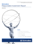 For Financial Intermediary, Institutional and Consultant Use Only. Not for redistribution under any circumstances. Schroders Responsible Investment Report Q3 2015 Inside... Climate change: An economist’s perspective Nutrition: Could Big Food be the next Big Tobacco? El Niño’s economic impacts What now for Volkswagen? ESG engagement highlights: GSK and Samsung C&T RESpONSIBlE INvESTmENT REpORT | Q3 2015 Responsible investment at Schroders “We think Schroders’ credentials as one of the largest global managers integrating ESG into investment processes are demonstrated by our engagement activities and thematic research; some of which is highlighted in this report. portfolio companies increasingly take notice of what we say. As long-term stewards of our clients’ capital, we aim to engage constructively with companies on ESG issues, helping them manage their risks and, in turn, strive for better outcome for our clients.” Jessica Ground Global Head of Stewardship RESpONSIBlE INvESTmENT REpORT | Q3 2015 3 Engagement Highlights from the quarter A+ ranking from UN Principles for Responsible Investment Schroders is delighted to have achieved the highest possible ESG score of A+ this year (up from A which was the highest possible score in 2014) for our overarching ESG practices. The UN pRI annual assessment rates and ranks investment managers of a similar size and comprehensively assesses their practices across asset classes. We believe this top score reflects the great strides we have taken to improve transparency and strengthen the profile of our ESG activities, particularly in the areas of ESG integration in our fixed income process, and our company engagement – both areas where we have also achieved A+ scores. We are happy to provide copies of the full assessment to clients. Portfolio carbon footprinting – what it tells you and what it doesn’t CO2 portfolio carbon footprinting is emerging as a major tool in identifying a portfolio’s exposure to climate change risks, or its contribution to climate change (and its solutions). Our recent paper explores some of the challenges in collating the data behind a portfolio’s carbon footprint and how this topic may evolve in the future. Is climate change a threat to insurance-linked securities? Climate change is not just relevant to equities. Schroders collaborated with Dr. Christophe Etienne, a specialist in natural catastrophes, to assess whether climate change would have a negative impact on insurance-linked securities (IlS), a type of bond whose returns are linked to certain types of insurance. While the answer is not straightforward, our study found that climate change is only one of many elements that will shape the IlS market over the longer term, and will therefore have only marginal effects. This is partly because climate change is a gradual and long-term phenomenon, whereas IlS are typically short-term instruments. Schroders collaborates with CDP on deforestation As a member of CDp, we welcomed the opportunity to work collaboratively to produce a white paper exploring the issue of deforestation and soy. While we are encouraged that increasing numbers of companies are working towards reducing deforestation linked to palm oil in Indonesia, our report highlights that deforestation risk associated with soy has been overlooked by most companies. It is a material business risk, with soy widely present in global supply chains, either as feed for livestock or as a food ingredient. This paper allows investors to better understand the potential risks around regulation, increasing deforestation, and broader climate change risks associated with soy. Full reports available at www.schroderstalkingpoint.com/us RESpONSIBlE INvESTmENT REpORT | Q3 2015 Special topic Climate change and the global economy Against a backdrop of rising shareholder interest, our economists Keith Wade and marcus Jennings examine the effect of climate change on the global economy. The four papers are part of our wider efforts to rigorously assess the economic and financial effects of ESG analysis on investment decision making. “Rightly, there is a growing focus on the effects that economic activity will have on the environment. However, there is much less attention paid to the effects that the changing environment will have on economic activity. These papers are a first stab at quantifying some of those impacts” Judging the impact of climate change is an extremely complex exercise, given the uncertainty about the degree of future global warming and its subsequent impact on global activity. There are clearly benefits and costs as the planet warms. There is also the unknown of how technological progress will respond and alter the path of global warming. Any assessment also involves taking a very long-run view, well beyond that normally used by financial market participants. The academic community is leading the way in an attempt to encourage investors, advisers and governments to change their collective behaviour to mitigate the costs of global warming. Keith and team draw on this work in their papers: Climate change and the global economy: growth and inflation We expect that the damage to capital stock and disruptions to labour supply will reduce productivity and economic activity. Inflation is therefore likely to increase as production is curtailed, particularly in agriculture, further weakening real incomes and spending. Climate change and the global economy: quantifying the impacts Keith Wade Global Economist valuing the future loss in economic output attributable to climate change produces a range of estimates which vary according to views about when the tipping point into irreversible change is reached. This is anywhere between 2°C and 4°C of warming. In a worst case scenario, global warming could be seen to reduce GDp growth by over 1% a year between now and 2080. Climate change and the global economy: regional effects Developing countries are set to abso