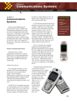 Wireless Communication Systems Chapter 3: Communications Systems There are many different types of communications systems available today. Communicating information has become one of the most important functions of the 21st century. In this chapter, we will explore 4 different types of systems: wireless communication systems, computer systems, networking and video systems. Most people use each one of these every single day so knowing how various types of systems work is a necessity. Wireless Communication Systems In the past century, wireless communication systems have evolved to include some very interesting applications. Three of the most significant systems are cellular phones, satellite television and satellite radio. Computer and Networking System be made on a modern handset in 1973. Dr Martin Cooper of Motorola made the first call, to his rival at Bell Labs. In 1978, Bell Labs started the first trial of cell phones in Chicago with a group of 2000 customers. While the US was still testing the idea, the first commercial system began operating in Tokyo in 1979. The FCC however, waited until 1982 to approve a cellular system for the United States. In 1983, the first commercial system began operating in Chicago. Full deployment of the cell phone began in 1984 in the US and 1985 in Canada. By 1987, there were over 1 million cellular customers in the US. Video Systems Production Notes ! Introduction ! Wireless Communication Systems ! Cellular Phone History ! First Modern Handset ! Cell Phone Trials ! PCS system The next evolution in the cell phone industry was the introduction of PCS (Personal Communication Service) phones. PCS was a digital service that allowed more subscribers to be added to the network. It used the 1.9 GHz radio spectrum band instead of the older analog 800 MHz band. In 1994, the FCC approved this system for use in the US. Canada followed suit in 1995. By 1997, 4 million wireless devices were in use in Canada and over 50 million in the US. Cellular Phone History The concept for cell phones was first devised in 1947, but the technology and infrastructure was not quite advanced enough. The FCC (Federal Communications Commission) in the United States permitted AT&T to conduct research at that time but limited the number of conversations that could be had within a cell to 23. In 1968, the FCC decided the technology was worth pursuing so new towers started to go up that could service an area within a few miles of the tower. This spurred on more research resulting in the first phone call to In the past decade, cell phones have evolved into an essential communications device. Phones now have colour screens, builtin cameras and MP3 players. Services include e-mail, text messaging, voice mail, caller ID and much more. There are over 17 million wireless devices used in Canada each day with over 47% of all phone calls now made from a cell 23 Wireless Communication Systems phone. In the US, there are 210 million wireless subscribers with an estimate of 250 million by 2010. In 2005, Americans spent over 675 billion minutes on cell phones with the average bill being $49.52. *Source: http://www.ctia.org/research_statistics/index.cfm/AID/10030 Computer and Networking System CB Radio Video Systems Production Notes ! Wireless Subscriber Stats ! How Cell Phones Work ! Comparison With CB Radio How Cell Phones Work Let's compare cell phones and CB radio which is commonly used in police cars and transport trucks. Cell phones are full-duplex communications devices. That means that each person in a 2-way conversation uses a different frequency, allowing each to talk at the same time. This differs from CB radio which is half-duplex, where only one person can talk at a time. Cell phones have thousands of channels available to be used versus the 40 for CB radio. Finally, cell phones have a world wide range, whereas CB radio only extends for 5 miles or 8 km. Cell phones have quickly become one of the most popular forms of wireless communication in the world. The basic concept of how these phones work is quite simple. “Cells” are made up of a series of towers that service a particular geographic area. When the user travels, the call is transferred to the closest tower. Each cell is approximately 10 square miles or 26 square kilometres. The cell phone carrier divides up the area into various hexagons in order to make sure every section is covered completely. Within each cell is a tower and a base station that transmits the low power signal. The base station has all of the equipment contained in it to power all of the frequencies being used The cell phones themselves have low power transmitters in them as well. This is what connects with the closest tower. Since 24 ! Cells ! Diagram of CB Radio vs. Cellular Two way half-duplex communication where only one person can talk at a time ! Diagram of Cells and Towers Cellular Communication Two way full-duplex communication where two people can talk at once Wireless Communication Systems the phone has a low power consumption, batteries can be smaller making cellular phone very small and mobile. When you turn on your phone, it send codes out over the control channel which is a frequency used for the base station and cell phone to talk to each other. The codes it sends contains the following information: the System Identification Number (who the cell phone provider is), the identity of the phone and who owns the phone. The System Identification Number is checked with the one programmed into the phone. If that provider is located in the area, then a call can be made. If not, the user will get a message saying there is no service. When a call is made to your phone, it goes to a central office in the area called the Mobile Telephone Switching Office. This office can connect you with the other phone that could either be another cell phone or a land line phone. The MTSO finds you by the constant registration request that your phone is sending it. It is like a 