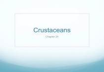 Crustaceans Chapter 20 Subphylum Crustacea Crustaceans, subphylum Crustacea typically have biramous, branched, appendages that are extensively specialized for feeding and locomotion. Subphylum Crustacea Crustacea is divided into 5 classes. Current molecular phylogenies do not support the monophyly of all classes. Subphylum Crustacea - External Features Secreted cuticle is made of chitin, protein, and calcareous material. Heavy plates have more calcareous deposits joints are soft and thin, allowing flexibility. Dorsal tergum and ventral sternum are plates on each somite lacking a carapace. Anterior end is a nonsegmented rostrum and the posterior end is the unsegmented telson. Subphylum Crustacea Crustaceans are the only arthropods that have two pairs of antennae. They also have a pair of mandibles (jaw-like appendages) and two pairs of maxillae on the head. Each body segment usually has one pair of appendages. Ancestrally biramous except for the first antennae. Subphylum Crustacea - Appendages Members of Malacostraca and Remipedia have appendages on each somite. Other classes may not bear appendages on abdominal somites. Subphylum Crustacea - Appendages Appendages have become specialized by evolving into a wide variety of walking legs, mouthparts, swimmerets, etc. from modification of the basic biramous appendage. Subphylum Crustacea The ancestral condition in arthropods is to have many body segments. Fewer segments and increased tagmatization is the derived condition. Subphylum Crustacea - Internal Features Muscular and nervous systems and segmentation exhibit metamerism of annelid-like ancestors. Hemocoel - persistent blastocoel that becomes filled with blood. Subphylum Crustacea - Muscular System Striated muscles make up a major portion of crustacean body. Most muscles arranged as antagonistic groups. Flexors draw a limb toward the body and extensors straighten a limb out. Subphylum Crustacea - Muscular System Abdominal flexors of a crayfish allow it to swim backward. Strong muscles located on each side of stomach control the mandibles. Subphylum Crustacea - Respiratory System Smaller crustaceans may exchange gases across thinner areas of cuticle. Larger crustaceans use featherlike gills for gas exchange. “Bailer” of 2nd maxilla draws water over gill filaments. Subphylum Crustacea - Circulatory Open circulatory system Dorsal heart - singlechambered sac of striated muscle. Valves in the arteries prevent backflow of hemolymph. Hemolymph conducted to gills, if present, for oxygen and carbon dioxide exchange. Hemolymph may be colorless, reddish, or bluish. Hemocyanin (blue) and/or hemoglobin (red) are respiratory pigments. Subphylum Crustacea - Excretory System Antennal or maxillary glands are called green glands in decapods. Labyrinth connects by an excretory tubule to dorsal bladder that opens to exterior pore. Resorption of salts and amino acids occurs as the filtrate passes the excretory tubule and bladder. Mainly regulates the ionic and osmotic composition of body fluids. Subphylum Crustacea - Excretory System Nitrogenous wastes are excreted across thin areas of cuticle in the gills. Freshwater crustaceans constantly threatened by overdilution with water. Gills must actively absorb Na+ and Cl-. Marine crustaceans have urine that is isosmotic with blood. Subphylum Crustacea - Nervous System Pair of supra-esophageal ganglia connects to eyes and two pairs of antennae. The subesophageal ganglion supplies nerves to mouth, appendages, esophagus, and antennal glands. Double ventral nerve cord has a pair of ganglia for each somite to control appendages. Subphylum Crustacea - Sensory System Eyes and statocysts are the largest sensory organs. Tactile hairs occur on the body, especially on chelae, mouthparts and telson. Chemical sensing of taste and smell occurs in hairs on antennae and mouth. Statocyst opens at base of first antenna in crayfish. Statocyst lined with sensory hairs that detect position of grains of sand. Subphylum Crustacea - Sensory System Compound eyes are made of many units called ommatidia. Cornea focuses light down the columnar ommatidium. Each ommatidium detects a restricted area of objects, a mosaic, in bright light. In dim light, the distal and proximal pigments separate and produce a continuous image. Subphylum Crustacea - Diversity of Reproduction Barnacles are monoecious but generally crossfertilize. In some ostracods, males are scarce and reproduction is by parthenogenesis. Subphylum Crustacea - Diversity of Reproduction Most crustaceans brood eggs in brood chambers, in brood sacs attached to the abdomen, or attached to abdominal appendages. Crayfishes develop directly without a larval form. Subphylum Crustacea - Diversity of Reproduction Most crustaceans have a larva unlike the adult in form, and undergo metamorphosis. Gulf shrimp Subphylum Crustacea - Diversity of Reproduction The nauplius is a common larval form with uniramous first antennae, and biramous second antennae and mandibles that all aid in swimming. Appendages and somites are added in a series of molts. Metamorphosis of a barnacle proceeds from a free-swimming nauplius to a cypris larva with a bivalve carapace and finally to a sessile adult with plates. Subphylum Crustacea Ecdysis Ecdysis is necessary for a crustacean to increase in size – the exoskeleton does not grow. Physiology of molting affects reproduction, behavior, and many metabolic processes. Underlying epidermis secretes cuticle. Subphylum Crustacea Ecdysis Molting animals grow in the intermolt phases, or instars. Soft tissue increases in size until there is no space within the cuticle. Molting occurs often in young animals and may cease in adults. Subphylum Crustacea Ecdysis Hormonal Control of Ecdysis: Temperature, day length, or other stimuli trigger central nervous system to begin ecdysis. Subphylum Crustacea - Endocrine Functions Removing eyestalks accelerates molting and prevents color changes to match background. Hormones from neu