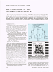 HARRY K. CHARLES, JR., and G. DONALD WAGNER MICROELECTRONICS AT APL: THE FIRST QUARTER CENTURY* In the ongoing integrated electronics revolution, with millions of transistors now being placed on a single square centimeter of silicon, the need to harness these powerful chips and combine them with other devices to form workable electronic systems is paramount. APL's Microelectronics Group is providing many of the designs, assembly methods, testing tools, and services necessary to weld the new technology into electronic systems for space science, avionics, biomedicine, and ocean science. INTRODUCTION (a) The Microelectronics Group was organized in 1960 to allow APL to participate actively in the rapidly advancing field of electronics miniaturization that was destined to play such an important role in the future of electronics. A report to the Director! recommended that APL establish a program in the field of microelectronics that should include All resistors to ±20 percent tolerance Temperature coefficient of resistance ~ 250 parts per million ° ,° 0,,° ,° ,° 2 5 = 2N2907A 3 4 6 = 2N2222A 1K 1. A microelectronics laboratory capable of fabricating functional circuit blocks and systems; 2. Research and development in materials, circuits, mechanical design, interconnections, and solid state applications; 3. System design involving the applications of microelectronics, considering such related areas as thermal problems, radiation damage, power supplies, and transducers; 4. Liaison and subcontracting. Early tasks for the group included research on thin films and the fabrication and technology of electronic packaging and integrated circuits. 2 Later, as the capabilities of the group developed and the need to incorporate microelectronics into all electronic activities became paramount, efforts were focused on designing and producing circuits directly for a variety of APL programs. Initially, hybrid microcircuits were developed to satisfy the needs of growing and expanding space programs at APL. It was necessary to create high-density electronics to conserve precious payload volume and weight, as well as to provide reliable performance with minimum power consumption. Selective miniaturization was the goal of the group, with certain repeated circuit entities targeted for initial hybridization. The first major circuit developed (1966) was the source-sink driver, which was designed to supply switching currents for the ferrite core memory of early Transit satellites. A schematic diagram and a photograph of this early hybrid circuit are shown in Fig. 1. -The technical terms in this article are included in the Microelectronics Glossary that appears after the references. 130 2N2222A _ 2N2907A . ._ _. T.V.pL., ic_al.....1••• m.il. W . i.re. b.o.n.dS_ _. ._ Figure 1- The source-sink driver hybrid was the first developed at APL for microcircuit space applications. Over 500 have been used on Transit satellites. (a) Circuit schematic; (b) photograph of an early hybrid prior to lid sealing. The circuit consisted of thin-film chromium resistors on a glass substrate, with discrete bipolar transistor chips soldered to gold pads. Conductors on the substrate were photolithographically etched from a Johns Hopkins APL Technical Digest, Volume 6, Number 2 deposited aluminum thin film. Interconnection wiring to both the transistors and substrate conductors was accomplished with thermocompression-bonded 25.4 micrometer (1-mil) diameter gold wire. The entire device was sealed with solder in a 10-lead 9.5 by 9.5 millimeter flat package in a nitrogen atmosphere. Fiftytwo circuits were used on each Transit satellite; over 500 have now been launched into orbit with no known failures. The simple building-block hybrid has continued to evolve over the years, finding its way into many nonspace applications such as avionics, biomedicine, and oceanography. Figure 2 shows a more recent hybrid circuit (1981). It was designed as a preamplifier to an accelerometer and was used in an underwater experiment. Here the package is much larger, 38 . 1 by 50.8 millimeters, and contains four analog integrated circuits (ICs), nine precision trimmable resistors, and two ceramic capacitors. While the resistors of the sourcesink driver were built to ± 20 percent tolerances and had temperature coefficients of resistance CTCRs) of ± 250 parts per million per degree Celsius, the resistors in this modern circuit have tolerances of ± 1 percent and a TCR of less than 25 parts per million per degree Celsius. To enable this unit to survive the undersea pressure environment, the accelerometer was hermetically sealed after being filled with a fluorocarbon liquid instead of the usual dry nitrogen gas. It can withstand pressures as great as 20 atmospheres. As hybrid technology advanced, more complex circuit building blocks were designed with hybrid circuits; they were constructed with methods and components selected to withstand such harsh environmental factors as space radiation. Figure 3 shows a hybrid device, fabricated in 1980, that uses radiation-hardened, custom ICs, designed in cooperation with the Sandia National Laboratories. The four complex large-scale ICs are intraconnected on a ceramic substrate patterned with thin-film gold conductors. Prior to this hybrid design, the approximately 32 discrete ICs needed to perform the function occupied a 15.2 by 15.2 centimeter circuit board. The detailed schematic is quite complex: essentially the circuit serves as four 24-bit accumulators, multiplexed to an 8-bit, tri-state bus for transfer of 96 bits of experimental data to a microprocessor in twelve 8-bit bytes. Several of these devices were flown in the AMPTE program,3 with dozens more scheduled to accompany the Galileo and Solar Polar missions. As the packaging for space applications maturedwith the need for high density, low power, and high reliability-it became evident that the same technologies could be used in the biomedical field for im