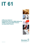 IT 61 A Revenue Guide to Professional Services Withholding Tax (PSWT) for Accountable Persons and Specified Persons RPC005119_EN_WB_L_1 Summary of Guide Part 1 - Outline of PSWT 1.1 What is PSWT? 1.2 Who must operate PSWT? 1.3 Rate at which PSWT is deducted 1.4 From which payments should PSWT be deducted? 1.5 Excluded payments 1.6 Amount from which PSWT is deducted 1.6.1 Treatment of expenses 1.6.2 Treatment of late payment interest 1.6.3 Treatment of VAT, Stamp Duty and certain other fees Part 2 - Accountable Persons 2.1 Who is an Accountable Person? 2.2 Registration of Accountable Persons 2.3 Mandatory e-filing 2.4 Obligation on accountable persons to deduct PSWT 2.5 Obligation to remit PSWT to Revenue 2.6 Payments by Accountable Persons to non-residents 2.7 Payments made between Accountable Persons 2.8 Payments by Accountable Persons to charities 2.9 Payments made by a foreign-based branch or agency of an accountable person 2.10 Inter group payments Part 3 - Specified Persons 3.1 Who is a Specified Person? 3.2 How does a Specified Person get proof of PSWT deducted? 3.3 Credit/refund of PSWT to Specified Person 3.4 Preliminary Tax 3.5 Interim Refunds 3.6 What to do where form F45 is lost, destroyed or incorrect 3.7 Where to claim credit/refund of PSWT Part 4 - Professional Services 4.1 Services covered by PSWT 4.2 Services which are not regarded as professional services for the purposes of PSWT 4.3 Services of employee Part 5 - Administration of PSWT 5.1 PSWT forms 5.2 Form F45 (a)General (b)Partnerships (c) Security numbers (d) Continuous/laser stationery forms F45 for completion using a computerised system (e) Forms F45 for manual completion (f) Completion of form F45 by Accountable Person 5.3 Form F43 5.4 Form F30 (monthly return) 5.5 Form F35 (annual return) (a)General (b) Details to be returned on form F35 (c) Schedule to accompany form F35 5.6 Requests for forms and security numbers 5.7 Irish version of PSWT forms 5.8 Rectifying errors (a) PSWT deducted in error (b) Excess PSWT deducted (c) Insufficient PSWT deducted (d) Payment made twice (e) Payment made to the wrong person (f) Error made in one tax year and rectified in a subsequent tax year Appendix 1 - Revenue Opinions regarding Professional Services 2 3 4 4 4 4 4 5 5 5 5 5 6 6 6 6 6 6 7 7 7 7 8 9 9 9 9 10 11 12 12 13 13 13 14 15 15 15 15 15 16 16 17 17 17 18 18 18 18 19 19 19 19 19 20 20 20 20 21 22 Summary of Guide Part 1 Contains an outline of the PSWT scheme. It gives an overview of the circumstances in which PSWT applies, summarises how it operates and how credits and refunds can be claimed. Part 2 Contains information relevant to those who are required to deduct PSWT, known as accountable persons. It advises of the types of bodies that are accountable persons and how they should register with Revenue. It also outlines the obligation on accountable persons to deduct PSWT from payments for professional services and sets out limited circumstances in which that obligation does not apply. Part 3 Contains information that is relevant to persons from whom PSWT has been deducted, known as specified persons, including how they can get credit for, or refunds of, PSWT. Part 4 Provides information on the services to which PSWT applies. A summary of Revenue opinions relating to the applicability of PSWT to payments for various types of services is also included in Appendix 1. Part 5 Gives details of the administrative procedures in place for the PSWT scheme. It includes information on the use and completion of various PSWT forms by accountable persons. Contacting Revenue Contact details for all Revenue offices can be obtained using the Contact Locator on the Revenue website, www.revenue.ie Forms and leaflet service All forms and information leaflets referred to in this guide are available from the Revenue website, www.revenue.ie or from the Revenue Forms and Leaflets Service at LoCall 1890 306 706 (ROI only) or + 353 1 702 3050 (from outside Ireland). 3 Part 1 - Outline of PSWT 1.1 What is PSWT? Chapter 1, Part 18 of the Taxes Consolidation Act 1997 provides for a withholding tax to be deducted from payments made by certain bodies in respect of professional services. The tax is known as Professional Services Withholding Tax (PSWT). Accountable Persons are required to deduct PSWT from Relevant Payments made by them to Specified Persons in respect of Professional Services and to remit the amounts deducted to Revenue. PSWT deducted is, in general, available for offset against the specified person’s final income tax/ corporation tax liability for the period within which the relevant payment is charged to tax. Pending offset against a specified person’s final tax liability, a claim for an interim refund of PSWT may, in certain circumstances, be made during the year in which it is deducted (see Part 3 for further details). 1.2 Who must operate PSWT? PSWT must be operated by each of the bodies listed as ‘accountable persons’ in Schedule 13 to the Taxes Consolidation Act 1997. In general terms, these are State and Semi-State bodies (see Part 2 for further details). Authorised health insurers are accountable persons and payments made by them to registered medical or dental practitioners or their employers under contracts of insurance are relevant payments for PSWT purposes. 1.3 Rate at which PSWT is deducted The rate at which PSWT is deducted is the standard rate of income tax in force at the date on which the relevant payment is made. The standard rate of income tax is currently 20%. 1.4 From which payments should PSWT be deducted? Subject to certain exclusions (see section 1.5), PSWT should be deducted from all “relevant payments”. “Relevant payments” are payments made by accountable persons in respect of professional services. A relevant payment need not necessarily be in respect of services provided directly to the accountable person. PSWT applies where an accountable person makes a payment in respect of a professional s
