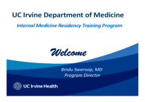 UC Irvine Department of Medicine Internal Medicine Residency Training Program Welcome Bindu Swaroop, MD Program Director Internal Medicine Residency Training Program University of California, Irvine We are very pleased that you are considering our Internal Medicine residency, and we look forward to meeting you. In this presentation, we have highlighted the most salient information about our Program. More extensive information is available on our website: www.medicine.uci.edu/intmed. Please also feel free to e‐mail me with questions at bswaroop@uci.edu Bindu Swaroop, MD, Program Director 2 UCI Internal Medicine Residency Core Philosophy & Goals Our Mission To provide outstanding training that is comprehensive, innovative and prepares residents to be exceptional providers and life‐long learners. To foster a love of knowledge, altruism and the highest respect for intellectual integrity and curiosity. Our Vision To continue as a premier Internal Medicine training program, enhance our pledge to academic training and foster the highest commitment to individual patients and our community 3 Department of Internal Medicine| 2013‐2014 UCI Internal Medicine Core Philosophies & Goals By the end of training our residents will be: •Clinically astute •Academically rigorous •Committed to the highest professional standards •Able to access the broadest range of career options 4 Defining Program Characteristics Diversity of Training Experiences • Our residents train in diverse environments and with unique patient populations. • Our hospitals include the primary teaching hospital of the University of California, Irvine; the Long Beach Veterans Health System Hospital; and Long Beach Memorial Medical Center • Our outpatient clinics range from indigent care sites to faculty private practice to our NCI‐comprehensive Chao Cancer Center 5 Broad experiences at three hospitals • UC Irvine Medical Center – 45% (diverse population) • Long Beach VA Medical Center – 45% (“bread & butter”) • Long Beach Memorial Medical Center – 10% (ICU) 6 Internal Medicine Residency | 2013 ‐ 2014 UCI Medical Center (UCIMC) University hospital with 400 active beds 100 total IM Beds • General medicine • Hospitalist and consult team experience • ICU/CCU • Oncology As the faculty’s and community’s hospital we attract a wide range of ethnicity, disease and social status Uniquely a student and resident hospital: No “private patients” 7 Long Beach VA Healthcare System • Recently updated and refurbished • Great depth of common Internal Medicine illnesses • Exceptional academic faculty, full members of the Department of Medicine • Outstanding clinical and basic science research • Resident & student oriented health system • Important resource in geriatrics training 8 Long Beach Memorial Medical Center • Outstanding facility with an IM Associate Program Director • Long‐standing commitment to teaching with programs including IM, Surgery, Pediatrics, Ob/Gyn, EM, PM&R, cardiology, pulmonary medicine and radiology • Cardiology, Neurology, and ICU Teaching Services with dedicated, supervising teaching faculty • Excellent practice‐based ambulatory and subspecialty experiences in areas such as women’s health, cardiology, allergy, oncology, & emergency medicine • One of the top centers in the country for cardiac care 9 Community‐based Sites • UCIMC Continuity Clinic with a unique practice model • VA Continuity Clinics with a novel team based approach to care (Patient Aligned Care Team‐ PACT) • UCIMC Faculty Practice Sites • Continuity clinic protected without back‐up responsibilities • Dedicated ambulatory curriculum on clinic rotations 10 Defining Program Characteristics Diversity of Patient Populations • We serve an extraordinarily diverse patient population including long established and recently immigrated communities. • We serve patients across the economic spectrum. More than 50% of our patients are economically disadvantaged. • Neighborhoods in our area include persons from China, the Middle East, Southeast Asia, Latin America, Persia and many others. • We care for patients with conditions like leprosy, TB, rheumatic heart disease and HIV as well as the breadth of diseases seen in the general US population. 11 Defining Program Characteristics • We present unique, longitudinal curricula in clinical skills, EBM, Quality, and Palliative Care. • Each house officer has at least 9 months of elective time for clinical, research, externship, or international experiences, with 2 elective blocks (6 weeks) in the first year. • We are committed to our mission of education and measure service in the context of educational value. 12 Defining Program Characteristics • Our flexible curriculum allows residents to tailor their experience to their career track. • We encourage couples matching. • We offer coordinated acceptance for IM & Occupational Medicine. • We offer career pathways in research, hospitalist medicine and primary care. 13 Curriculum Development: Recent Innovations • Doctoring Skills Rotation • Resident‐Driven Process Improvement Programs • Fellowship & Career Mentoring from the first day of orientation • A Curriculum in Life‐Long Learning Skills to enhance commitment to knowledge and • The Science of Decision Making skills after graduation Conference • Business of Medicine and Career • Resident Morale Project to continuously identify ways to Development improve the well‐being of our residents • A longitudinal curriculum in Teaching Skills for all residents • Academy of Internal Medicine • An experience in Palliative Care • Hospitalist and Consult Service Curriculum 14 Doctoring Skills Rotation Patient‐Centered, Learner‐Driven Focused on: • History taking and communications skills • Physical diagnosis • Real patients and patient simulation technology • Decision‐making skills • Life‐lon
