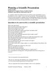 Planning a Scientific Presentation October 8, 2002 Department of Computer Science, Graduate Seminar Facilitator: Jason Harrison <harrison@cs.ubc.ca> As a graduate student in Computer Science you will have many opportunities to give a presentation on your, or others, work to your peers and faculty. Your presentation may be given in your research lab, a graduate course, an undergraduate tutorial or lab session, a conference presentation or a poster presentation. The goal of this seminar is to provide you with some tools to help you design and deliver your presentation. Questions to be answered by a scientific presentation What is this paper about?1 What is the thesis (main point) of this paper? What are the weaknesses of this work? What are the strengths of this work? How does this work relate to other research that I am familiar with? What are the contributions of this work? How could this work be applied? What was the main experimental question(s) that the authors asked? 2 Why did they ask this question? Were there any particularly important previous studies that prompted this work? What method(s) did the authors use to address their question(s)? What results did they obtain? Can you explain/describe each and every figure in the paper? What do these results mean? How do these results add to, change, update, etc. our understanding of the problem or the solutions? What are the strengths and weaknesses of the work? What new questions are revealed? What questions remain unanswered? If it's a new idea, has it been sufficiently proven or "battle-tested"?3 If it's a presentation of existing ideas, is this presentation better than existing texts or literature? 1 This set of questions from Joanna McGrenere. 2 This next set of questions from Barbara Lom’s reading guidelines at www.bio.davidson.edu/Biology/balom/362/362jclub.html 3 Next set of questions from Journal of Graphics Tools reviewer guidelines. Scientific Presentation Planning October 8, 2002 1 Purposes of presentations At the same time you consider the specific purpose of your presentation, you may want to pick a generic presentation purpose to help you guide the design of your presentation. These are the main presentation purposes. 1. Informative An informative presentation is brief and to the point. Present the facts and avoid complicated information. Present the information using either a logical, temporal, geographical or cause and effect structure. 2. Instructional An instructional presentation leaves the participants with a new skill. You may have to cover the topic thoroughly and design activities for the participants to attempt to use their new knowledge and new skills. 3. Arousing An arousing presentation makes people think about a problem or situation. You may be trying to get their active support or just their understanding. Arousing presentations use vivid language and visuals, they are often emotional and a bit manipulative. But never cold hearted 4. Persuasive A persuasive presentation attempts to convince the audience to accept your proposal or solution to a controversy, dispute, or problem. You must convince the audience that you have fully examined the problem and all solutions, and have selected or produced the best solution possible. You may need to directly address alternative solutions. You may need to use logic, evidence and emotion. 5. Decision-making As with persuasive presentations, in a decision-making presentation you have a suggested action that you want your audience to take. However, they could decide to do nothing. You must convince them to carry out your requests, and how to do so. You should also tell them the consequences of doing nothing. While scientific presentations tend to be either informative or instructional, they often include elements of the arousing, persuasive and decision-making presentation purposes. For example, why is the problem (and solution) you are presenting interesting? Why should your audience accept your solution? Given two alternatives, which should they choose to solve problem X? Scientific Presentation Planning October 8, 2002 2 Planning your presentation When planning your presentation, there are several things that should be considered: Where will your presentation occur? What are the advantages and disadvantages of the venue? What does your audience already know about your topic? Does your audience have a certain opinion about your topic? Why is your audience attending your presentation? What is their purpose for listening to you? The answers to these questions can provide considerable assistance to you when planning an effective presentation. Especially if you get the answers right. However, many scientific presenters answer the questions in the following way, do you know why the answers are wrong?4 Where will your presentation occur? Room 3, I think it's that big room with the windows... or maybe it's that really small one with the moveable chairs and tables - who cares - I'll see when I get there.... What are the advantages and disadvantages of the room? Advantage: technical support if anything goes wrong. Disadvantage: room is a bit chilly. What does your audience already know about your topic? Doesn’t matter, because I define all of my terms. There are things I need to say and I've got it all scripted out... I can't change it now... Does your audience have a certain opinion about your topic? Yes, but I don’t know which one, perhaps I shouldn’t express an opinion. Why is your audience attending your presentation? Because they are getting seats for the following blockbuster presenter., Suppose I'll be lucky if anyone shows up...In any case the paper is in the proceedings. (And in my CV, and that is what really matters.) What is their purpose for listening to you? Nothing better to do. 4 Thanks to Desiree Mou for some of these. Scientific Presentation Planning October 8, 2002 3 The presentation basics model One model that can be used to plan an effective presentati