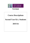 German Course Descriptions Second Year B.A. Students 2015/16 Year coordinators: N.N. (semester 1) Dr. Tina Pusse, MA., Room AM 346. Telephone: 495874; email: tina.pusse@nuigalway.ie Entry requirements: First Arts Students having attained a total mark of 40% or more will be admitted to Second Arts German courses. Compulsory Modules: Students are obliged to take all six modules on offer. All modules have the value of 5 ECTS. For further details, please check our Departmental website: www.nuigalway.ie/german Important Dates First Semester Start of teaching Monday, 7th September, 2015 End of teaching Saturday, 28th November, 2015 Study Week Monday, 30th November – Saturday, 5th December, 2015 Examinations –Semester 1 Monday, 7th – Friday, 18th December, 2015 Christmas Vacation Saturday, 19th December, 2015 – Sunday, 10th January, 2016 Second Semester Start of Teaching period 1 Monday, 11th January, 2016 End of Teaching period 1 Saturday, 19th March, 2016 Easter Holidays Thursday, 24th – Tuesday,29th March, 2016. Start of Teaching period 2 Monday, 4th April, 2016 End of Teaching period 2 Saturday, 16th April, 2016 Study Week Monday, 18th – Saturday, 23th April, 2016 Examinations – Semester 2 Monday, 25th April - Wednesday, 11th May, 2016 Autumn Examinations Tuesday,2nd – Friday, 12th August, 2016 2 Semester 1 All modules are compulsory. All modules have the value of 5 ECTS. Module Components GR236 German Language I GR239 History of German Literature and Culture I Students have to choose one of the two optional components. Family Fiction (core) Märchen (optional) Childhood under Nazi control (optional) 60% 40% 40% GR238 German Studies I Students have to choose one of the two optional components. Research Skills (core) Old and New Media: From Consuming to Producing Information (optional) Write, Act, Podcast: Producing and presenting German Texts (optional) 50% 50% 50% Semester 2 All modules are compulsory. All modules have the value of 5 ECTS. Module Components GR237 German Language II GR235 History of German Literature and Culture II Students have to choose one of the three optional components. Wiener Moderne (core) Kafka, Der Prozess (optional) Heinrich Heine (optional) Introduction to Linguistics (optional) 60% 40% 40% 40% GR240 German Studies II Both components are compulsory. Landeskunde Intercultural Communications 50% 50% 3 Semester I GR236 German Language I (4 hrs. per week) Lecturer: Tina Pusse. Course description: This course (level B1+) will reinforce and build on your language skills acquired in first year. It will help you to become more comfortable and articulate in your practical use of German while deepening your understanding of grammar, vocabulary and structure. Prerequisites: 40% or more in First Arts German, or the equivalent. Teaching and learning methods: The course is based on language exercises and text production, including aural, oral and written language work, conversation and oral presentations, listening comprehension. Attendance is vital. As students are required to participate fully in all elements of the course, 50% of all marks are given for continuous assessment. Former beginners will be given additional support. Methods of assessment: Two-hour written examination and oral examination 50%; continuous assessment (written assignments, grammar exercises, in-class tests) 50%. Core texts: Michaela Perlmann-Balme & Susanne Schwalb, Sicher! B1+ in two volumes: Sicher! B1+ Kursbuch, (Hueber) ISBN 978-3-19-001206-0) and Sicher! B1+ Arbeitsbuch mit Audio-CD (Hueber) ISBN 978-3-19-011206-7; Dreyer, Hilke & Schmitt, Richard, A Practice Grammar of German (Hueber) ISBN 978-3-19-327255-3 GR239 History of German Literature and Culture I Components: Family Fiction (core) 60% Märchen (optional) 40% Childhood under Nazi control (optional) 40% Family Fiction (2 hrs. per week) Lecturer: Tina Pusse Course description: The struggles and the dynamics in families have always been a major topic of literary exploration. Although it is not inevitable that at the end of a drama an entire family lays slaughtered on the stage, like in Hamlet, families, at least 4 in literature, are seen as social units where conflicts, sometimes devastating, arise. Very often family conflicts reflect general problems related to gender issues and to concepts of masculinity and femininity. The course will analyse family conflicts in their historical contexts in novellas and short stories from Romanticism to contemporary German literature. Methods of assessment: 20% attendance with active participation including a short presentation, 80% take home essay (the essay assignment will be broken down into four steps, each of them will build 20% of your essay grade). Core texts: Franz Kafka: Die Verwandlung. Stuttgart: Reclam 2006 (ISBN: 978-3-15009900-1); Ludwig Tieck: Der blonde Eckbert. Der Runenberg. Stuttgart: Reclam 2006 (ISBN: 978-3-15-007732-0); E.T.A. Hoffmann: Der Sandmann. Stuttgart: Reclam (ISBN 3-15-000230-3): Elfriede Jelinek: Die Klavierspielerin (Excerpt will be provided). Märchen (1 hr. per week) Lecturer: Hans-Walter Schmidt-Hannisa Course description: The course will start with a brief introduction to the fairy tale as a literary genre. It will then focus on Jacob and Wilhelm Grimm’ collection of Kinderund Haus-Märchen, published between 1812 and 1858 in six editions and one of the most well-known German books of all times. We will read and discuss the Vorrede of the collection which points out the Grimm’s understanding of the genre as a national treasure and explains what had motivated the brothers to collect and preserve tales originally emerging from an oral tradition of storytelling. The myth launched by the Grimms that the texts in their collection are manifestations of an original and pristine German “Volksgeist” will be dismantled and their true political and moral intentions will be reconstructed. We will then analyse a selection of popular and lesser known fairy 