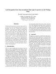Gait Recognition from Time-normalized Joint-angle Trajectories in the Walking Plane Rawesak Tanawongsuwan and Aaron Bobick College of Computing, GVU Center, Georgia Institute of Technology Atlanta, GA 30332-0280 USA tee|afb @cc.gatech.edu Abstract This paper demonstrates gait recognition using only the trajectories of lower body joint angles projected into the walking plane. For this work, we begin with the position of 3D markers as projected into the sagittal or walking plane. We show a simple method for estimating the planar offsets between the markers and the underlying skeleton and joints; given these offsets we compute the joint angle trajectories. To compensate for systematic temporal variations from one instance to the next — predominantly distance and speed of walk — we fix the number of footsteps and timenormalize the trajectories by a variance compensated time warping. We perform recognition on two walking databases of 18 people (over 150 walk instances) using simple nearest neighbor algorithm with Euclidean distance as a measurement criteria. We also use the expected confusion metric as a means to estimate how well joint-angle signals will perform in a larger population. 1. Introduction There are numerous applications for computer vision that require a system to automatically identify people or at least verify their claimed identity. Gait is one of human characteristics that researchers are investigating and hope to use as a signature to recognize people. A walking pattern biometric is appealing from a surveillance standpoint because the data can be measured unobtrusively and from a distance. Walking is a complex dynamic activity that involves many segments of the body moving and interacting with one another and with the environment. There is evidence from the psychology literature that when humans view degraded displays of gait, they are still able to extract some identity information. For example, experiments in [6, 10] show that people can indicate some identity from the subjects’ movement even when viewing only a moving point-light display. There are many properties of gait that might serve as recognition features. We can categorize them as static fea- tures and dynamic features that evolve in time. Static features reflect instantaneous, geometry-based measurements such as stride length [e.g. [9]]. Dynamic measurements, in contrast, are sensitive to the temporal structure of the activity. In this work, we analyze only dynamic features, namely lower-body (hip and knee) joint-angle trajectories. Our goal is to determine the extent of identity information present in this type of data. 1.1. Approach The approach we take here is to look at joint-angle trajectories derived from motion capture data. Our reason for considering motion capture data is that we are primarily interested in determining feasible methods for extracting identity information from the joint angle data. Because we are evaluating the efficacy of such an approach, we consider the ideal case where the joint angle data can be known as well as possible. This will enable the evaluation of particular methods of determining identity independent of the ability to recover such information. Having said this, we note that in the approach we present we consider only the joint angles projected into the sagittal or walking plane. Our reasons for doing so are two fold. First, as will describe, such joint angles are more robust to derive from marker data than complete, full degree of freedom joint angle specifications. Second, the walking plane joint angles are likely to be the most easily determined joint angles for visual methods. Previous work on gait recognition that employ frontal parallel views are also motivated by such an assumption. In the remainder of this paper, we first consider some previous work on the recovery of identity from gait. Next we describe the sagittal joint-angle estimation method we apply to the motion capture data. Given these joint-angle trajectories we devise a temporal normalization that will allow comparisons across subjects. Using a database of 18 people we evaluate the efficacy of attempting recognition from joint-angle data; we report not only percent correct but also the ability of the data to filter the population for verification. 1.2. Previous work In vision research, there is a growing number of efforts investigating whether machines can recognize people from gait. Example work includes appearance based approaches where the actual appearance of the motion is characterized [9, 5, 11, 8]. Alternatively, there is work that attempts to model the physical structure of a person, recover that structure, and then recognize the identity. For example, in [13], they detect gait patterns in a video sequence, fit a 2D skeleton of human body to the imagery, estimate lower-body joint angles from the model, and then perform recognition. They employ a small walking database and report reasonable results. There is also relevant work in the computer animation field, including that of recovering underlying human skeletons from motion capture data [14, 16] and analyzing and adjusting characteristics of joint angle signals [4, 3, 2, 17]. 2. Recovering normalized joint angle trajectories Here we describe the basic motion capture mechanism, the conversion to sagittal-plane projected joint angles, and the temporal normalization that results in comparable joint angle trajectories. 2.1. Motion capture Our data are collected using an Ascension electro-magnetic motion capture system. The user wears 16 sensors, each measuring the six degrees of freedom (DOFs) of position and orientation. We place one sensor on each of the ankles, lower legs, upper legs, hands, lower arms, upper arms, one on the head, one of the pelvis and 2 on the torso. Figure 1 is an example of a typical setup in our experiment and figure 2 shows the sensors configuration of the lower part of the body projected into the sagittal or walking p