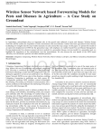International Journal of Advancements in Research & Technology, Volume 3, Issue 1, January-2014 ISSN 2278-7763 74 Wireless Sensor Network based Forewarning Models for Pests and Diseases in Agriculture – A Case Study on Groundnut Santosh Sam Koshy1, Yesho Nagaraju1, Sowjanya Palli1, Y. G. Prasad2, Naveen Pola2 1 Team Embedded, Centre for Development of Advanced Computing, Hyderabad, India; 2Department of Entomology, Central Research Institute for Dryland Agriculture, Hyderabad, India. Email: santoshk@cdac.in, ynagaraju@cdac.in, sowjanyap@cdac.in, ygprasad@crida.ernet.in, naveen_pola@yahoo.co.in ABSTRACT In Agriculture, microclimate plays an important role in the growth and outbreak of pests and diseases. Wireless Sensor Networks (WSN) enables the acquisition of both microclimate and macroclimate weather data from agricultural farms thereby facilitating new insights into the crop-weather dynamics in and around the crop canopy. In this paper, we present the results of an open farm deployment of WSN for the groundnut crop, with emphasis on weather based Pest and Disease Management. Having implemented two decision support advisory models for a groundnut disease, and one model for a groundnut pest, we highlight the importance of the microclimate over the macroclimate. We also discuss the cost benefit of the WSN based Advisory over the farmer's practice and other standard practices. Keywords : Ubiquitous Computing, Wireless Sensor Networks, Micro Climate, Leaf Spot, Leaf Miner, Groundnut, Randomized Block Designs 1 INTRODUCTION IJOART Ubiquitous Computing (UbiComp), the third wave of computing, follows the eras of mainframe and personal computing [13]. Ubicomp is considered as the age of Calm Technology [14] where technology recedes into the background while rendering its supportive services in an unobtrusive way. Wireless Sensor Network (WSN) is one step in this direction, enabling Ubiquitous Computing to proliferate our daily spaces [1]. Conceptually speaking, WSN combines various technologies like Sensing, Processing and Wireless Communication into a system architecture that facilitates the interfacing of the physical world with Cyberspace [9]. Agricultural practices need to address problems like climate change, land infertility, diminishing yields, and rampant pest outbreaks [17]. The knowledge of weather helps in addressing a few of these problem areas satisfactorily. Automatic Weather Stations (AWS) measuring parameters like Temperature, Relative Humidity, Rainfall, Solar Radiation and Wind Speed & Direction, provide macroclimate information [4]. Agricultural research also emphasizes the need for understanding microclimate within the crop canopy by measuring parameters like Leaf Wetness, Soil Moisture & Temperature and Canopy Temperature & Humidity [21]. Groundnut in India, is cultivated in low to moderate rainfall zones [6]. The crop age typically varies between 90-130 days. It is grown in two seasons Kharif and Rabi during a calendar year. The Kharif season (June-September) is characterized by rain fed agriculture and during the Rabi season (November- February), fields are irrigated. Investigations reveal Copyright © 2014 SciResPub. that Leaf Miner is considered to be one of the major pests, of the groundnut crop. Temperature plays an important role in the pest’s growth, as the pest requires the accumulation of fixed amounts of heat units, to pass from one stage to the next of its life cycle [12]. The conditions favorable for leaf miner growth are, long dry spells resulting in high Temperature and low humidity [6]. Groundnut is also prone to attack by numerous diseases. Among fungal foliar diseases, only a few are economically important in India such as Leaf Spot (early and late) and Rust. These are widely distributed and can cause yield losses in susceptible genotypes to the extent of 70% [19]. Weather conditions congenial for occurrence of early and late Leaf Spot are rainfall, moisture causing leaf wetness and temperature [6]. WSN facilitates the aggregation of microclimate information from agricultural fields by installing sensors within the crop canopy at various locations in the field. This microclimate information supports the analysis of various factors that influence crop and pest growth thereby aiding the development of decision support advisory models. The decision support advisories help farmers to make better decisions in crop management. WSN’s sphere of influence in agriculture, encompass areas like irrigation, pest & disease management, drought analysis & early warning, precision farming etc. The paper is divided into six sections. Section 1 briefly reviews some agricultural experiments using WSN. Section 3 describes the Ubiquitous Agriculture System Architecture and IJOART International Journal of Advancements in Research & Technology, Volume 3, Issue 1, January-2014 ISSN 2278-7763 the Decision Support Advisory Models developed as part of the research. The Observations and Results are analyzed in Section 4, while the Conclusions are summarized in Section 5, followed by the Future Work, listed in Section 6 75 one-shot sensor information. In normal mode of operation, the parameters are sensed once in every hour according to the domain requirements, but can also be configured to sense at intervals as low as 10 seconds. 2 RELATED WORK An experiment in field crop production, Lofar Agro, deals with fighting phytophthora in a potato field. To monitor Relative Humidity, Temperature and Leaf Wetness, which are important indicators to the development of the disease, the potato field was instrumented with wireless sensors [16]. In another experiment Automated Agriculture System (A2S), a WSN was deployed in greenhouses with melon and cabbage in Dongbu Handong Seed Research Center. A2S was used to monitor the growing process, and control the illumination within the greenhouses [1]. A prototype, consisting of a wireless network of ground-sensors periodically records soil moistu