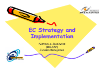EC Strategy and Implementation Sistem e-Business (MG-652) Jurusan Manajemen Agenda • • • • • • • Learning Objectives Strategic Planning for EC Electronic Commerce Strategy in Action Competitive Intelligence on the Internet Implementation steps and plans Web Assessment Managerial Issues 05 September 2002 Chandra Wibowo W. 2 Industry and Competitive Analysis Strategy Formulation Value Analysis Approach Return on Investment and Risk Analysis Strategic Planning for eBusiness Internet and Competitive Intelligence Competitive Intelligence on the Internet Push Technology and Competitive Intelligence eBusiness Scenarios Competitive Strategies Cooperative Strategies Strategic Planning Framework Project Strategy Assessment What Questions a Strategic Plan Should Answer Conduct necessary education and training Collecting Information Finalization Considering the Strategic Value of eBusiness Understand what customers and partners expect from the web Give a new role to Human Resources Department Measuring Results eBusiness Strategy and Implementation Review current distribution and supply chain models Reevaluate the nature of product and services Need for Assessment Steps to successfull eBusiness Programs Implementing eBusiness Strategy Managerial Issues Pilot Projects Pilot Project eBusiness Leadership Track new competitors and market share Participate in the creation and development of virtual marketplaces Considering the Risks Integration Extend current systems to outside Develop a web-centric marketting strategy Conducting Strategic Planning eBusiness Opprtunities and Applications Implementation Creating Web Team Evaluating Outsourcing Web Content Design Instill eBusiness management style Security and Control 05 September 2002 Chandra Wibowo W. 3 Learning Objectives • Describe the strategy planning process for EC. • Understand the process of formulating EC strategies. • Describe the role of CSF and justification of EC. • Explain competitive intelligence on the Internet and in EC. • Explain the steps and issues involved in EC implementation. • Understand how to reassess EC projects. 05 September 2002 Chandra Wibowo W. 4 Strategic Planning for EC • • Why does a company need strategic planning for EC and what are the available options? A company may decide: 1. Not to go for EC. 2. To do only passive advertising. 3. To open online stores in addition to existing stores, typically called e-tailing. 4. To establish a separate online division within the company. 5. To dissolve regular business and go for cyber-business only. The choice depends not only on the nature of the business company conducts but also on the environment the company is operating in and on the internal resources available. Its strategic plan includes a detailed analysis that supports a choice of one of the five alternatives just mentioned. 05 September 2002 Chandra Wibowo W. 5 For example: • IBM created an independent EC division. • It introduced EC as a corporate culture. • IBM leveraged its existing strengths. • IBM tied EC with the reengineering of its process. • The company started seven different EC initiatives. • IBM decided to be an EC leader. • It used return on investment (ROI) as a criteria for selecting EC projects. 05 September 2002 Chandra Wibowo W. 6 Industry and Competitive Analysis Strategy Formulation Implementation Performance Assessment, Strategy Reassessment 05 September 2002 The Strategic Planning Cycle Chandra Wibowo W. 7 INDUSTRY AND COMPETITIVE ANALYSIS • Industry and competitive analysis for EC entails monitoring, evaluating, and disseminating information from the external and internal environments with respect to launching an EC project. • The goal is to identify the critical success factors that will determine the success of the EC project. Æ SWOT analysis. • SWOT: strengths, weaknesses, opportunities, and threats. • The external environment consists of opportunities and threats that are outside the organization and are not typically within the short-run control of top management. 05 September 2002 Chandra Wibowo W. 8 The elements of SWOT are the following: • Opportunities (O) : the external current and future opportunities available for the company are examined. • Threats (T) : the external threats facing the company now and in the future are analyzed. • Strengths (S) : the specific areas of current and future strengths for the company are described. • Weaknesses (W) : the specific areas of current and future weaknesses for the company are stated. 05 September 2002 Chandra Wibowo W. 9 Strengths (S) Weaknesses (W) Opportunities (O) SO Strategies Generate strategies here that use strengths to take advantage of opportunities WO Strategies Generate strategies here that take advantage of opportunities by overcoming weaknesses Threats (T) ST Strategies Generate strategies here that use strengths to avoid threats WT Strategies Generate strategies here that minimize weaknesses and avoid threats Internal Factors External Factors 05 September 2002 Chandra Wibowo W. 10 STRATEGY FORMULATION • • • • • • Based upon the results of the SWOT analysis, an EC strategy then needs to be developed. Strategy Formulation is the development of the long-range and strategic plans for the effective management of environmental opportunities and threats, in light of corporate strengths and weaknesses. It includes examining or redefining the corporate or project mission by specifying achievable objectives, developing strategies, and setting implementation guidelines for EC. It should be noted that “going EC” can be done in many ways. An EC initiative may include such EC projects as creating a storefront, extranet, or an e-mall. Strategic formulation is relevant both for EC initiative in general and for individual EC projects. 05 September 2002 Chandra Wibowo W. 11 • • • • • • An organization’s mission states the purpose for the organization’s exis
