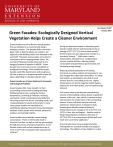 Green Facades: Ecologically Designed Vertical Vegetation Helps Create a Cleaner Environment Green facades are self-sufficient vertical gardens that are attached to a structure built along a building’s exterior. The facades differ from other green walls in that the plants are rooted in soil adjacent to the building rather than fastened to the wall itself. The plants receive water and nutrients from ground soil or hanging planter boxes. The concept of the green facade dates back to the Hanging Gardens of Babylon in 600 BC. Green facades have many uses and are considered an ecological technology. Once established, green facades need little maintenance and can grow as tall and as wide as its supporting trellis system will allow, depending on the plant species used. Green Facades are a Smart Solution for Economic and Ecological Problems Green facades offer many benefits to their surrounding environment including buffering building temperatures, cooling the local air temperature, providing air filtration, reducing stormwater runoff, ameliorating noise pollution, removing carbon from the air, providing shade, and creating habitats for plants and animals. In many cases, green facades are intended to be aesthetically pleasing. Research shows this biophylic aesthetic makes people more relaxed, productive, studious and mentally healthy. Green facades can potentially reduce energy consumption. Plants on the facade shade a structure’s surface, as well as cool the surroundings through the process of evapotranspiration. Green facades reduce wall surface temperatures by as much as 25°F (14°C) compared with exposed wall surfaces.6 Fact Sheet, FS-987 January 2014 During an experiment based in Maryland, green facades cooled exterior wall temperatures by an average of 13°F (7.1°C) in the summer months.6 Green facades can also reduce heat transfer to a structures’ interior. 6 With cooler interior temperatures, demand for air conditioning in warmer months declines, reducing energy consumption and greenhouse gas emissions and increasing energy savings. Reducing surface temperatures of existing structures, as well as ambient air temperature, can also mitigate the urban heat island effect. An urban heat island is a metropolitan area that is much warmer than its surrounding rural area. Higher temperatures can lead to negative health impacts, reduced air and water quality, and increased energy demand. One reason urban areas become comparatively warmer is that building surfaces absorb a significant amount of the sun’s rays, which is released as heat and increases the temperature of the surrounding climate. Green walls lower exterior wall and ambient air temperatures. A Maryland study showed green facades cooled ambient air temperatures by an average of 2.5 to 3.2°F (1.4 to 1.8°C) in June, July and August. Another study in Hong Kong predicted a maximum decrease of 15.1°F (8.4°C) in an urban canyon if both walls and roofs were covered by vegetation.3 Green facades have many ecological benefits, making them an excellent example of ecological technology. The addition of new habitats in urban For more information on this and other topics visit the University of Maryland Extension website at www.extension.umd.edu 1 environments, for example, can benefit species affected by habitat destruction and fragmentation. In particular, birds and insects may benefit from the façade plants. Green facades also benefit the environment by improving water and air quality. Façade plants use and slow stormwater flow before it joins urban runoff, Air quality is improved when façade plants capture particulate matter and take up air pollutants such as CO2, NOx, and SO2.5 Green facades create an appealing natural façade, adding aesthetic value to a building and positively affect the mental and physical wellbeing of those around it. Studies show that green structures and landscapes are associated with faster patient recovery time, reduced stress, and improved mood.4,7,8 Vegetation Grows on a Frame in Green Facades The height of green facades is only limited by how high plants can grow since trellis systems can span significant heights. There are two types of green facades: Modular trellis systems are installed vertically and can be placed directly onto an existing structure’s wall, or constructed as a freestanding structure. Cable systems are potentially more complicated since they must be assembled on-site (figure 1). attached. This provides the permanent framework for the remaining system of cables to attach. Figure 1. Rod and cable trellis systems are installed vertically Scott Tjaden Care should be taken in both the planning and installation of a green façade cable system, as proper anchoring and cable spacing are vital to sustained welfare of the trellis. Figure 2. Cables systems use connectors at each intersection between vertical cables and horizontal rods Cable Systems Must be Attached Directly to the Wall, and Can Cover Large Areas Installation of green facades requires skilled carpentry or masonry. Some installations necessitate construction and maintenance of planter boxes. Green façade cable systems most often are attached to the outside of a building and require cables held in tension with a series of connectors at each intersection between vertical cables and horizontal rods (figure 2). These cables are usually made of stainless steel, which ensures durability. Anchors are bolted into the building façade, onto which cables are Casey Price For more information on this and other topics visit the University of Maryland Extension website at www.extension.umd.edu 2 Figure 4: Grapes are an example of a vine with tendrils What Types of Plants Can be Used? 1. Native vines are best suited for Maryland’s climate (water needs, sensitivity to drought, temperature tolerance, soil type, solar exposure, and wind tolerance), will require little maintenance, and promote local biodiversity. 2. Twining vines, such as cora
