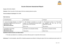 Course Outcome Assessment Report Course: Elementary Algebra Outcome: Given two points, find the slope of the line containing these two points. Terms Included in this Report: Fall, 2009 Data Summary: Criteria/Standards Not Proficient Proficient 1. Use of the slope formula, or 2. Graph both points to determine the rise and run. (Benchmark: 70%) Benchmark Achieved 1. The formula is incorrect or no work shown, or 2. the points are incorrect and/or the rise and run are incorrect. — 98 (21.7%) 1. The formula is correct, or 2. The points are graphed and rise and run are determined correctly. — 353 (78.3%) Computation of the slope. (Benchmark: 70%) Benchmark Achieved The slope is not computed correctly. — 102 (22.6%) The slope is computed correctly. — 349 (77.4%) Qualitative Data/Comments and Observations 1. This data was obtained via a mandatory, yet extra credit quiz given in conjunction with an exam. Inferences: For both standards, about 80% of students assessed are proficient in finding the slope of the line containing two given points. For Page 1 of 60 the first objective, students failed to remember the slope formula. For the second objective, students had made errors on signs and additions. Action Plan: We are happy with the result. We will use this method to assess this SLO next semester. Local Resource Needs: Students can use the tutoring services at the MSC and LRC. Also more tutors, computers and softwares are needed to help student improve their learning. Resource Requests: None Additional Comments: We are happy with the result. We may use points with fractions as coordinates. Page 2 of 60 Course Outcome Assessment Report Course: Survey of Humanities Outcome: Name 4 artists central to the period of the Renaissance and identify their art works that characterized their contribution. Terms Included in this Report: Spring, 2010 Data Summary: Criteria/Standards Not Proficient Proficient Name 4 artists central to the periods of the Renaissance and identify the art works that characterized their contributions. (Benchmark: 90%) Benchmark Not Achieved Students were only able to identify 3,2,1 or 0 artists and their works — 45 (17%) Students were able to identify 4 or more artists, and name their masterpieces. — 220 (83%) Qualitative Data/Comments and Observations No additional information was submitted Inferences: Provide students with visual handouts via faculty website to practice identifying artists and their works. Action Plan: Design website for Humanities course that will incorporate slide identification practice Local Resource Needs: Page 3 of 60 Resource Requests: None Additional Comments: Persons who analyzed this data were: Martha Carreon, Domingo Rodriguez and Hector Gonzalez Page 4 of 60 Course Outcome Assessment Report Course: Introductory Psychology Outcome: Given research findings and theories in psychology, describe and/or evaluate the role that both genetics and environment play in different behaviors. Terms Included in this Report: Fall, 2009, Spring, 2010 Data Summary: Criteria/Standards Not Proficient Proficient the Using 3 questions, student is unable to correctly identify the definition for genetics and environment within a particular behavioral context. — 478 (38.4%) Using 3 questions, student correctly identifies the definition for genetics and environment within a particular behavioral context. — 768 (61.6%) Standard 2: Students understands and recognizes an example of the concepts of genetics and environment (Benchmark: 66%) Benchmark Not Achieved Using 3 questions with an example, student is unable to correctly identify the concepts of genetics and environment within a particular behavioral context. — 592 (47.5%) Using 3 questions with an example, student correctly identifies the concepts of genetics and environment within a particular behavioral context. — 654 (52.5%) Standard 1: Student understands concepts of genetics and environment (Benchmark: 66%) Benchmark Not Achieved Qualitative Data/Comments and Observations Page 5 of 60 1. 2. 3. 4. 5. 6. Same data for sections 8097 and 8147 as they are a combined online course. Same data for sections 8097 and 8147 as they are a combined online course. Same data for sections 30131and 30129 as they are a combined online course. Here are Debra's data as reported to me (VP): Excellent Satisfactory Unsatisfactory Concept 8 12 8 Application 8 5 15 Same data for sections 30131 and 30129 as they are a combined online course. Students appear to grasp the concept of genetics (nature) and environment (nurture) most clearly when the material is presented in its simplest form. The initial presentation of examples with which students can easily identify, followed by periodic opportunities for students to create their own examples of each form of influence appear to result in satisfactory retention of the concepts throughout the semester, and presumably beyond. Spaced practice through the form of periodic review of the simplified forms of these concepts (nature vs. nurture) in each chapter has resulted in a greater proficiency than may have otherwise occurred. 7. Here are Debra's full data for this section: Excellent Satisfactory Unsatisfactory Concept 9 16 4 Application 3 12 14 8. This topic of study tends to be one of the most conceptually challenging for many of our students. Even the ones who grasp the basic concepts of nature and nuture have trouble recognizing the application of those concepts and the varieties of interactions between genetics and environment...when given different examples of human behavior. Inferences: About 60% of the students correctly identify the concepts of genetics (nature) and environment (nurture). This is 10% below our benchmark. Only 50% of our students were able to identify these concepts within an example. This suggests that students are having difficulty with the skill of applying these concepts within context. Action Plan: It may be beneficial to students to create problems and/