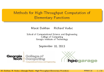 Methods for High-Throughput Computation of Elementary Functions Marat Dukhan Richard Vuduc School of Computational Science and Engineering College of Computing Georgia Institute of Technology September 10, 2013 M. Dukhan, R. Vuduc (Georgia Tech) High-Throughput Elementary Functions PPAM 10 1 / 33 Outline 1 Introduction 2 New Design Principles Avoid Table Lookups Avoid Hardware Division and Square Root Avoid Unpredictable Branches Use Pipelined Horner Scheme and Newton-Raphson Iterations 3 Performance and Accuracy Evaluation M. Dukhan, R. Vuduc (Georgia Tech) High-Throughput Elementary Functions PPAM 10 2 / 33 Vector Elementary Functions xi-5 yi-5 xi-4 yi-4 xi-3 xi-2 xi-1 xi xi+1 xi+2 xi+3 yi = log xi yi = exp xi yi = sin xi yi = tan xi yi = asin xi yi = atan xi yi = sinh xi yi = tanh xi yi = asinh xi yi = atanh xi yi-3 yi-2 yi-1 yi yi+1 yi+2 yi+3 xi+4 yi+4 xi+5 yi+5 M. Dukhan, R. Vuduc (Georgia Tech) In this research we consider the problem of computing such functions as exp, log, sin, tan on a large array of inputs and producing an array of outputs. We assume that the arrays are large enough, so that only the throughput matters for the means of performance optimization. High-Throughput Elementary Functions PPAM 10 3 / 33 Importance for Applications Elementary functions are one of the best researched objects in mathematics, and their properties are well known. Thus, they are widely used in mathematical models in dierent areas of science. When these models are applied to arrays of data vector elementary functions naturally arise. Where vector elementary functions are used? Non-parametric statistics Machine learning Information theory Markov models Random number generation M. Dukhan, R. Vuduc (Georgia Tech) High-Throughput Elementary Functions PPAM 10 4 / 33 Contributions Four design principles for portable high-throughput vector elementary functions motivated by processor microarchitecture. I I I I No table lookups No division or square root operations No branches except for special cases Use Horner Scheme and Newton-Raphson with Software Pipelining Elementary functions design using only hardware-ecient operations. Performance evaluation of the proposed elementary functions design on three architectures. M. Dukhan, R. Vuduc (Georgia Tech) High-Throughput Elementary Functions PPAM 10 5 / 33 Outline 1 Introduction 2 New Design Principles Avoid Table Lookups Avoid Hardware Division and Square Root Avoid Unpredictable Branches Use Pipelined Horner Scheme and Newton-Raphson Iterations 3 Performance and Accuracy Evaluation M. Dukhan, R. Vuduc (Georgia Tech) High-Throughput Elementary Functions PPAM 10 6 / 33 Outline 1 Introduction 2 New Design Principles Avoid Table Lookups Avoid Hardware Division and Square Root Avoid Unpredictable Branches Use Pipelined Horner Scheme and Newton-Raphson Iterations 3 Performance and Accuracy Evaluation M. Dukhan, R. Vuduc (Georgia Tech) High-Throughput Elementary Functions PPAM 10 7 / 33 History of FPU and L1D Cache Performance M. Dukhan, R. Vuduc (Georgia Tech) High-Throughput Elementary Functions PPAM 10 8 / 33 Legacy in Algorithms for Elementary Functions M. Dukhan, R. Vuduc (Georgia Tech) High-Throughput Elementary Functions PPAM 10 9 / 33 Components of Floating-Point Performance M. Dukhan, R. Vuduc (Georgia Tech) High-Throughput Elementary Functions PPAM 10 10 / 33 SIMD Table Lookup Options L1 Cache L1 Cache Table n0 n1 SIMD register n2 n3 GP registers n0 n0 n1 n1 n2 n2 n3 n3 SIMD registers x0 x1 x0 x2 x3 x0 x3 x1 x1 x2 x3 x2 There are two options to extract indices from SIMD register Use direct transfers from lanes of SIMD register to GP register Store SIMD register to memory and load individual components Both options reduce the (already low) table lookup performance. M. Dukhan, R. Vuduc (Georgia Tech) High-Throughput Elementary Functions PPAM 10 11 / 33 SIMD Table Lookup Performance The latency of simulated SIMD table lookup operation is too high to hide it with conventional hardware or software techniques. Codes which use such table lookups are likely to suer from pipeline stalls due to long dependencies. M. Dukhan, R. Vuduc (Georgia Tech) High-Throughput Elementary Functions PPAM 10 12 / 33 Outline 1 Introduction 2 New Design Principles Avoid Table Lookups Avoid Hardware Division and Square Root Avoid Unpredictable Branches Use Pipelined Horner Scheme and Newton-Raphson Iterations 3 Performance and Accuracy Evaluation M. Dukhan, R. Vuduc (Georgia Tech) High-Throughput Elementary Functions PPAM 10 13 / 33 History of DIV/SQRT Performance 1 1 Throughput of DIV/SQRT instructions from A.Fog (2013) DIV and SQRT on Modern Processors 2 2 Throughput of DIV/SQRT instructions from A.Fog (2013) Outline 1 Introduction 2 New Design Principles Avoid Table Lookups Avoid Hardware Division and Square Root Avoid Unpredictable Branches Use Pipelined Horner Scheme and Newton-Raphson Iterations 3 Performance and Accuracy Evaluation M. Dukhan, R. Vuduc (Georgia Tech) High-Throughput Elementary Functions PPAM 10 16 / 33 Branch Misprediction Cost: Cycles 3 3 Data on branch misprediction cycles from A.Fog (2013) Branch Misprediction Cost: FLOPs 4 4 Data on branch misprediction cycles from A.Fog (2013) Outline 1 Introduction 2 New Design Principles Avoid Table Lookups Avoid Hardware Division and Square Root Avoid Unpredictable Branches Use Pipelined Horner Scheme and Newton-Raphson Iterations 3 Performance and Accuracy Evaluation M. Dukhan, R. Vuduc (Georgia Tech) High-Throughput Elementary Functions PPAM 10 19 / 33 Polynomial Approximations An elementary function can be approximate by a polynomial: f (x ) ≈ Pn (x ) = n ∑ ck x k k =0 Due to recent progress in polynomial approximation algorithms approximation error can be reduced to almost zero. Figure: Error analysis for approximations of log (1 + x ) by a 21-degree polynomial √ √ on 22 − 1 ≤ x ≤ 2 − 1 M. Dukhan, R. Vuduc (Georgia Tech) High-Throughput Elementary Functions PPAM 10 20 / 33 Horner Scheme Denition 