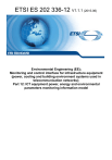ETSI ES 202 336-12 V1.1.1 (2015-06) ETSI STANDARD Environmental Engineering (EE); Monitoring and control interface for infrastructure equipment (power, cooling and building environment systems used in telecommunication networks); Part 12: ICT equipment power, energy and environmental parameters monitoring information model 2 ETSI ES 202 336-12 V1.1.1 (2015-06) Reference DES/EE-02037-12 Keywords control, energy efficiency, interface, management, network monitoring, power, system ETSI 650 Route des Lucioles F-06921 Sophia Antipolis Cedex - FRANCE Tel.: +33 4 92 94 42 00 Fax: +33 4 93 65 47 16 Siret N° 348 623 562 00017 - NAF 742 C Association à but non lucratif enregistrée à la Sous-Préfecture de Grasse (06) N° 7803/88 Important notice The present document can be downloaded from: http://www.etsi.org/standards-search The present document may be made available in electronic versions and/or in print. The content of any electronic and/or print versions of the present document shall not be modified without the prior written authorization of ETSI. In case of any existing or perceived difference in contents between such versions and/or in print, the only prevailing document is the print of the Portable Document Format (PDF) version kept on a specific network drive within ETSI Secretariat. Users of the present document should be aware that the document may be subject to revision or change of status. Information on the current status of this and other ETSI documents is available at http://portal.etsi.org/tb/status/status.asp If you find errors in the present document, please send your comment to one of the following services: https://portal.etsi.org/People/CommiteeSupportStaff.aspx Copyright Notification No part may be reproduced or utilized in any form or by any means, electronic or mechanical, including photocopying and microfilm except as authorized by written permission of ETSI. The content of the PDF version shall not be modified without the written authorization of ETSI. The copyright and the foregoing restriction extend to reproduction in all media. © European Telecommunications Standards Institute 2015. All rights reserved. DECTTM, PLUGTESTSTM, UMTSTM and the ETSI logo are Trade Marks of ETSI registered for the benefit of its Members. 3GPPTM and LTE™ are Trade Marks of ETSI registered for the benefit of its Members and of the 3GPP Organizational Partners. GSM® and the GSM logo are Trade Marks registered and owned by the GSM Association. ETSI 3 ETSI ES 202 336-12 V1.1.1 (2015-06) Contents Intellectual Property Rights ................................................................................................................................5 Foreword.............................................................................................................................................................5 Modal verbs terminology....................................................................................................................................5 1 Scope ........................................................................................................................................................6 2 References ................................................................................................................................................6 2.1 2.2 3 3.1 3.2 3.3 4 4.1 4.2 4.3 4.3.1 4.3.2 4.4 4.4.0 4.4.1 4.4.2 4.4.3 4.4.3.0 4.4.3.1 4.4.3.2 4.4.3.3 4.4.3.4 4.4.3.5 4.4.3.6 4.4.3.7 4.4.3.8 4.5 Normative references ......................................................................................................................................... 6 Informative references ........................................................................................................................................ 7 Definitions, symbols and abbreviations ...................................................................................................8 Definitions .......................................................................................................................................................... 8 Symbols ............................................................................................................................................................ 10 Abbreviations ................................................................................................................................................... 10 ICT power, energy and environmental parameters monitoring system..................................................11 General description........................................................................................................................................... 11 Complementarity to existing site power and air-conditioning measurements .................................................. 12 Different site cases ........................................................................................................................................... 13 Simple site case........................................................................................................................................... 13 Complex site case ....................................................................................................................................... 14 Measurement and monitoring description ........................................................................................................ 15 General description ..................................................................................................................................... 15 Internal measurements type 1 (Built-in) in ICT equipment) ....................................................................... 15 External measurements type 2 (external sensors) for ICT equipment ........................................................ 16 Common requirements for external (type 2) and internal (type 1) measurement ..............