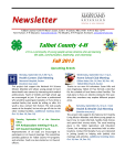 Newsletter Talbot County ● 28577 Mary’s Court, Suite 1 ● Easton, MD 21601 ● (410) 822-1244 Tom Hutson, 4-H Educator, thutson@umd.edu Pat Murphy, 4-H Program Assistant, pmurphy3@umd.edu Talbot County 4-H 4-H is a community of young people across America who are learning life skills, communication, leadership, and citizenship. Fall 2013 Upcoming Events Monday, September 16, 5:30-7 p.m. Wednesday, September 18, 1–3 p.m. Health Careers Club Meeting Home School Club Meeting Memorial Hospital, Easton (location may vary) This project club support the National 4-H Science Mission Mandate and allows young people to learn about health care careers by interacting with medical professionals. Youth of middle and high school age are encouraged to join. If you know a professional who would be a good guest speaker, or if you know a medical facility that would be willing to offer 4-H youth a tour, contact Tom Hutson. The club usually meets at the hospital, but we also go off-site to visit other medical facilities. (additional meeting dates: Oct. 21, Nov. 18, Dec. 16) Tuesday, September 17 at the Extension Office: 4-H Ambassadors meeting 5–6 p.m. 4-H Council meeting 6–7 p.m. Representatives of all clubs are encouraged to participate in 4-H Council meetings. This committee provides guidance for Talbot County 4-H programs and activities. Youth are also elected as 4-H Council officers. (Other dates: Oct. 16, Nov. 20, Dec. 18) Talbot Bible Church, Easton Thanks to our new 4-H volunteers Susan Hills and Joan Vogelsang, Talbot 4-H has formed a club that fits the schedule of local home school families. The club plans to focus on robotics during its first year; after that, members may explore different project areas. Saturday, September 21, 10 a.m.–noon Health & Wealth Club Meeting (location may vary) This project club supports the National 4-H Healthy Living Mission Mandate and allows young people to learn how to make informed, healthy food choices and spend their money wisely. The usual meeting place is the Talbot Agriculture and Education Center, but meetings are sometimes held at other locations. Contact Pat Murphy if you are interested in joining (youth) or helping with (adults) club meetings and activities. (additional meeting dates: Oct. 19, Nov. 16, Dec. 21) 2 Saturday, September 28, 10 a.m.–2 p.m. October 9–October 20 Out Here with Animals Event— 4-H Promotion 4-H Promotion and Paper Clover Fundraiser Tractor Supply Company, Easton 4-H clubs and members are invited to help us show the public what a great program 4-H is and to feature animal projects. You may do a project talk, demonstration, or visual presentation. (Your activity can be related to animals, but it doesn’t have to be.) You may also lead an educational activity that you bring or help us lead our activities. This is another great public speaking and promotion opportunity for you! If you are interested in signing up, contact Tom Hutson or Pat Murphy. Tractor Supply Company, Easton Tractor Supply is a strong supporter and community partner of Talbot 4-H. During the week of October 9-20, the Easton store will highlight 4-H and sell paper clovers for $1 each to help raise money to fund 4-H programs. All 4-H members and clubs are invited to do talks, demonstrations, visual presentations, or carry out educational activities after school or on the weekends. Please contact Tom Hutson, Pat Murphy, or 4-H Volunteer Karen Callahan if you would like to participate in this public education and public speaking opportunity. Saturday, October 5 Trappetoberfest— 4-H Promotion Trappe Every year, the town of Trappe holds a community celebration that features fun activities, food, music, etc. This is a special event that reaches many people, especially those who live in the southern part of the county. If you are interested in signing up to be a part of the 4-H promotional activities, contact Pat Murphy or Tom Hutson. October 6-12 National 4-H Week!!! Every year, the second week in October is set aside as National 4-H week. Across the country, 4-H programs are asked to help people learn about the opportunities that 4-H provides for young people. Your club members might want to make posters about 4-H and display them in public, teach students in your school about 4-H, perform a community service project that helps local communities, or think of an even better idea. Wednesday, October 9 is National Youth Science Day. On this day, all states are asked to feature 4-H science programs. The national science experiment this year deals with GPS, and we have a special treat for you: Ms. Cathy Cooper, a GIS expert, will be leading a GIS workshop (held Saturday, October 19 instead of October 9). See below for details. Saturday, October 12, 6–8 p.m. Halloween Happening! Talbot Ag. & Ed. Center, Easton It’s time again for our annual Halloween event. All Talbot 4-H members are invited. The evening will feature fun games and learning activities. Register by October 5. There may be a small cover charge to help with expenses. (Tom will be teaching at a national conference in Baltimore that day, and Pat will be counting on volunteer helpers to make the evening’s activities run smoothly.) Sunday, October 13, 11a.m.–4 p.m. Harvest Hoedown—4-H Promotion Pickering Creek Audubon Center, Easton This annual community event features a wide variety of fun activities offered by Pickering Creek and its community partners. The Harvest Hoedown is usually attended by large numbers of people. If you would like to help lead 4-H educational activities for the public, please contact the Extension Office. Friday, October 18, 9–3 p.m. Up for the Challenge Fitness and Nutrition Program: Adult and Teen Training T.C. Free Library Easton—meeting room Do you think fitness and nutrition are the keys to a good quality of life? Would you like to learn more 3 about the 4-H Up for the Challenge Program and receive training about how to teach lessons from the curriculum