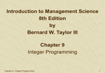Introduction to Management Science 8th Edition by Bernard W. Taylor III Chapter 9 Integer Programming Chapter 9 - Integer Programming 1 Chapter Topics Integer Programming (IP) Models Still “linear programming models” Variables must be integers, and so form a subset of the original, real-number models Integer Programming Graphical Solution Computer Solution of Integer Programming Problems With Excel and QM for Windows Chapter 9 - Integer Programming 2 Integer Programming Models Types of Models Total Integer Model: All decision variables required to have integer solution values. 0–1 Integer Model: All decision variables required to have integer values of zero or one. Also referred to as Boolean and True/False Mixed Integer Model: Some of the decision variables (but not all) required to have integer values. Chapter 9 - Integer Programming 3 A Total Integer Model (1 of 2) Machine shop obtaining new presses and lathes. Marginal profitability: each press $100/day; each lathe $150/day. Resource constraints: $40,000, 200 sq. ft. floor space. Machine purchase prices and space requirements: Required Floor Space (sq. ft.) Purchase Price Press 15 $8,000 Lathe 30 4,000 Machine Chapter 9 - Integer Programming 4 A Total Integer Model (2 of 2) Integer Programming Model: Maximize Z = $100x1 + $150x2 subject to: 8,000x1 + 4,000x2 $40,000 15x1 + 30x2 200 ft2 x1, x2 0 and integer x1 = number of presses x2 = number of lathes Chapter 9 - Integer Programming 5 A 0–1 Integer Model (1 of 2) Recreation facilities selection to maximize daily usage by residents. Resource constraints: $120,000 budget; 12 acres of land. Selection constraint: either swimming pool or tennis center (not both). Data: Recreation Facility Swimming pool Tennis Center Athletic field Gymnasium Chapter 9 - Integer Programming Expected Usage (people/day) Cost ($) Land Requirement (acres) 300 90 400 150 35,000 10,000 25,000 90,000 4 2 7 3 6 A 0–1 Integer Model (2 of 2) Integer Programming Model: Maximize Z = 300x1 + 90x2 + 400x3 + 150x4 subject to: $35,000x1 + 10,000x2 + 25,000x3 + 90,000x4 $120,000 4x1 + 2x2 + 7x3 + 3x4 12 acres x1 + x2 1 facility x1, x2, x3, x4 = 0 or 1 (either do or don’t) x1 = construction of a swimming pool x2 = construction of a tennis center x3 = construction of an athletic field x4 = construction of a gymnasium Chapter 9 - Integer Programming 7 A Mixed Integer Model (1 of 2) $250,000 available for investments providing greatest return after one year. Data: Condominium cost $50,000/unit, $9,000 profit if sold after one year. Land cost $12,000/ acre, $1,500 profit if sold after one year. Municipal bond cost $8,000/bond, $1,000 profit if sold after one year. Only 4 condominiums, 15 acres of land, and 20 municipal bonds available. Chapter 9 - Integer Programming 8 A Mixed Integer Model (2 of 2) Integer Programming Model: Maximize Z = $9,000x1 + 1,500x2 + 1,000x3 subject to: 50,000x1 + 12,000x2 + 8,000x3 $250,000 x1 4 condominiums x2 15 acres x3 20 bonds x2 0 x1, x3 0 and integer x1 = condominiums purchased x2 = acres of land purchased x3 = bonds purchased Chapter 9 - Integer Programming 9 Integer Programming Graphical Solution Rounding non-integer solution values up (down) to the nearest integer value can result in an infeasible solution A feasible solution may be found by rounding down (up) non-integer solution values, but may result in a less than optimal (sub-optimal) solution. Whether a variable is to be rounded up or down depends on where the corresponding point is with respect to the constraint boundaries. Chapter 9 - Integer Programming 10 Integer Programming Example Graphical Solution of Maximization Model Maximize Z = $100x1 + $150x2 subject to: 8,000x1 + 4,000x2 $40,000 15x1 + 30x2 200 ft2 x1, x2 0 and integer Optimal Solution: Z = $1,055.56 x1 = 2.22 presses x2 = 5.55 lathes Both of these may be found by judicious rounding, but the value of the objective function needs to be checked for each. Chapter 9 - Integer Programming Figure 9.1 Feasible Solution Space with Integer Solution Points 11 Branch and Bound Method Traditional approach to solving integer programming problems. Based on principle that total set of feasible solutions can be partitioned into smaller subsets of solutions. Smaller subsets evaluated until best solution is found. Method is a tedious and complex mathematical process. Excel and QM for Windows used in this book. See CD-ROM Module C – “Integer Programming: the Branch and Bound Method” for detailed description of method. Chapter 9 - Integer Programming 12 Computer Solution of IP Problems 0–1 Model with Excel (1 of 5) Recreational Facilities Example: Maximize Z = 300x1 + 90x2 + 400x3 + 150x4 subject to: $35,000x1 + 10,000x2 + 25,000x3 + 90,000x4 $120,000 4x1 + 2x2 + 7x3 + 3x4 12 acres x1 + x2 1 facility x1, x2, x3, x4 = 0 or 1 Chapter 9 - Integer Programming 13 Computer Solution of IP Problems 0–1 Model with Excel (2 of 5) Exhibit 9.2 Chapter 9 - Integer Programming 14 Computer Solution of IP Problems 0–1 Model with Excel (3 of 5) Instead, one could just specify $C$12:$C$15 as “binary” (= ‘0’ or ‘1’). Exhibit 9.3 Chapter 9 - Integer Programming 15 Computer Solution of IP Problems 0–1 Model with Excel (4 of 5) To constrain a range of variables to be integers, enter: Exhibit 9.4 Instead, specify the “bin” what optionyou (= ‘0’put or ‘1’), … and one notecould thatjust it doesn’t matter in thus the side additional, 0” and “≤ 1”not constraints. the avoiding right-hand field,“≥but it must be empty. Chapter 9 - Integer Programming 16 Computer Solution of IP Problems 0–1 Model with Excel (5 of 5) Exhibit 9.5 Chapter 9 - Integer Programming 17 Computer Solution of IP Problems 0–1 Model with QM for Windows (1 of 3) Recreational Facilities Example: Maximize Z = 300x1 + 90x2 + 400x3 + 150x4 subject to: $35,000x1 + 10,000x2 + 25,000x3 + 90,000x4 $120,000 4x1 + 2x2 + 7x3 + 3x4 12 acres x1 + x2 1 facility x1, x2, x3, x4 = 0 or 1 Chapter 9 - I