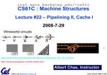 inst.eecs.berkeley.edu/~cs61c CS61C : Machine Structures Lecture #22 – Pipelining II, Cache I 2008-7-29 Wireworld circuits http://www.maa.org/editorial/mathgames/mathgames_05_24_04.html http://www.quinapalus.com/wi-index.html Albert Chae, Instructor CS61C L22 Pipelining II, Cache I (1) Chae, Summer 2008 © UCB Review: Processor Pipelining (1/2) • “Pipeline registers” are added to the datapath/controller to neatly divide the single cycle processor into “pipeline stages”. • Optimal Pipeline • Each stage is executing part of an instruction each clock cycle. • One inst. finishes during each clock cycle. • On average, execute far more quickly. • What makes this work well? • Similarities between instructions allow us to use same stages for all instructions (generally). • Each stage takes about the same amount of time as all others: little wasted time. CS61C L22 Pipelining II, Cache I (2) Chae, Summer 2008 © UCB A pipelined datapath From P&H CS61C L22 Pipelining II, Cache I (3) Chae, Summer 2008 © UCB Review: Pipeline (2/2) • Pipelining is a BIG IDEA • widely used concept • What makes it less than perfect? • Structural hazards: Conflicts for resources. Suppose we had only one cache? Need more HW resources • Control hazards: Branch instructions effect which instructions come next. Delayed branch • Data hazards: Data flow between instructions. Forwarding CS61C L22 Pipelining II, Cache I (4) Chae, Summer 2008 © UCB Review • Some fixes to hazards • Illusion of two memories • Register file convention • Forwarding • Load delay slot • All else fails, bubble/stall • Latency vs throughput • What prevents us from getting n-times speedup, where n is the number of pipeline stages? CS61C L22 Pipelining II, Cache I (5) Chae, Summer 2008 © UCB Graphical Pipeline Representation (In Reg, right half highlight read, left half write) Time (clock cycles) Reg D$ Reg I$ Reg D$ Reg I$ Reg D$ Reg I$ Reg ALU CS61C L22 Pipelining II, Cache I (6) Reg ALU I$ D$ ALU Reg ALU I$ ALU I n s Load t Add r. Store O Sub r d Or e r D$ Reg Chae, Summer 2008 © UCB Control Hazard: Branching (1/8) Time (clock cycles) ALU I n I$ D$ Reg Reg beq s I$ D$ Reg Reg t Instr 1 r. I$ D$ Reg Reg Instr 2 O I$ D$ Reg Reg Instr 3 r I$ D$ Reg Reg d Instr 4 e r Where do we do the compare for the branch? ALU ALU ALU ALU CS61C L22 Pipelining II, Cache I (7) Chae, Summer 2008 © UCB Control Hazard: Branching (2/8) • We had put branch decision-making hardware in ALU stage • therefore two more instructions after the branch will always be fetched, whether or not the branch is taken • Desired functionality of a branch • if we do not take the branch, don’t waste any time and continue executing normally • if we take the branch, don’t execute any instructions after the branch, just go to the desired label CS61C L22 Pipelining II, Cache I (8) Chae, Summer 2008 © UCB Control Hazard: Branching (3/8) • Initial Solution: Stall until decision is made • insert “no-op” instructions (those that accomplish nothing, just take time) or hold up the fetch of the next instruction (for 2 cycles). • Drawback: branches take 3 clock cycles each (assuming comparator is put in ALU stage) CS61C L22 Pipelining II, Cache I (9) Chae, Summer 2008 © UCB Control Hazard: Branching (4/8) • Optimization #1: • insert special branch comparator in Stage 2 • as soon as instruction is decoded (Opcode identifies it as a branch), immediately make a decision and set the new value of the PC • Benefit: since branch is complete in Stage 2, only one unnecessary instruction is fetched, so only one no-op is needed • Side Note: This means that branches are idle in Stages 3, 4 and 5. CS61C L22 Pipelining II, Cache I (10) Chae, Summer 2008 © UCB Control Hazard: Branching (5/8) Time (clock cycles) ALU I n I$ D$ Reg Reg beq s I$ D$ Reg Reg t Instr 1 r. I$ D$ Reg Reg Instr 2 O I$ D$ Reg Reg Instr 3 r I$ D$ Reg Reg d Instr 4 e r Branch comparator moved to Decode stage. ALU ALU ALU ALU CS61C L22 Pipelining II, Cache I (11) Chae, Summer 2008 © UCB Control Hazard: Branching (6a/8) Time (clock cycles) beq Reg I$ D$ Reg Reg ALU add I$ ALU I n s t r. • User inserting no-op instruction D$ Reg ALU bub bub bub bub bub O nop ble ble ble ble ble r D$ Reg Reg I$ d lw e r • Impact: 2 clock cycles per branch instruction slow CS61C L22 Pipelining II, Cache I (12) Chae, Summer 2008 © UCB Control Hazard: Branching (6b/8) Time (clock cycles) beq Reg I$ D$ Reg Reg ALU add I$ ALU I n s t r. • Controller inserting a single bubble D$ Reg ALU bub O lw D$ Reg Reg I$ ble r d e r • Impact: 2 clock cycles per branch instruction slow CS61C L22 Pipelining II, Cache I (13) Chae, Summer 2008 © UCB Control Hazard: Branching (7/8) • Optimization #2: Redefine branches • Old definition: if we take the branch, none of the instructions after the branch get executed by accident • New definition: whether or not we take the branch, the single instruction immediately following the branch gets executed (called the branch-delay slot) • The term “Delayed Branch” means we always execute inst after branch • This optimization is used on the MIPS CS61C L22 Pipelining II, Cache I (14) Chae, Summer 2008 © UCB Control Hazard: Branching (8/8) • Notes on Branch-Delay Slot • Worst-Case Scenario: can always put a no-op in the branch-delay slot • Better Case: can find an instruction preceding the branch which can be placed in the branch-delay slot without affecting flow of the program - re-ordering instructions is a common method of speeding up programs - compiler must be very smart in order to find instructions to do this - usually can find such an instruction at least 50% of the time - Jumps also have a delay slot… CS61C L22 Pipelining II, Cache I (15) Chae, Summer 2008 © UCB Example: Nondelayed vs. Delayed Branch Nondelayed Branch or $8, $9 ,$10 Delayed Branch add $1 ,$2,$3 add $1 ,$2,$3 sub $4, $5,$6 sub $4, $5,$6 beq $1, $4, Exit beq 