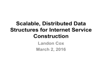 Scalable, Distributed Data Structures for Internet Service Construction Landon Cox March 2, 2016 In the year 2000 … • Portals were thought to be a good idea • Yahoo!, Lycos, AltaVista, etc. • Original content up front + searchable directory • The dot-com bubble was about to burst • Started to break around 1999 • Lots of companies washed out by 2001 • Google was really taking off • Founded in 1998 • PageRank was extremely accurate • Proved: great search is enough (and portals are dumb) • Off in the distance: Web 2.0, Facebook, AWS, “the cloud” Questions of the day 1. How do we build highly-available web services? • Support millions of users • Want high-throughput 2. How do we build highly-available peer-to-peer services? • • • • • Napster had just about been shut down (centralized) BitTorrent was around the corner Want to scale to thousands of nodes No centralized trusted administration or authority Problem: everything can fall apart (and does) • Some of the solutions to #2 can help with #1 Storage interfaces Physical storage Physical storage File hierarchy Logical schema D F D F mkdir, create Process 1 Attr1 … Val1 … Attr N ValN F open, read, write Process 2 What is the interface to a file system? SQL Query Process 1 SQL Query Process 2 What is the interface to a DBMS? Data independence • Data independence • Idea that storage issues should be hidden from programs • Programs should operate on data independently of underlying details • In what way do FSes and DBs provide data independence? • Both hide the physical layout of data • Can change layout without altering how programs operate on data • In what way do DBs provide stronger data independence? • File systems leave format of data within files up to programs • One program can alter/corrupt layout file format • Database clients cannot corrupt schema definition ACID properties • Databases also ensure ACID • What is meant by Atomicity? • Sequences of operations are submitted via transactions • All operations in transaction succeed or fail • No partial success (or failure) • What is meant by Consistency? • After transaction commits DB is in “consistent” state • Consistency is defined by data invariants • i.e., after transaction completes all invariants are true • What is the downside of ensuring Consistency? • In tension with concurrency and scalability • Particularly in distributed settings ACID properties • Databases also ensure ACID • What is meant by Isolation? • Other processes cannot view modification of in-flight transactions • Similar to atomicity • Effects of a transaction cannot be partially viewed • What is meant by Durability? • After transaction commits data will not be lost • Committed transactions survive hardware and software failures ACID properties • Databases also ensure ACID • Do file systems ensure ACID properties? • • • • • Not really Atomicity: operations can be buffered, re-ordered, flushed async Consistency: many different consistency models Isolation: hard to ensure isolation without notion of transaction Durability: need to cache undermines guarantees (can use sync) • What do file systems offer instead of ACID? • Faster performance • Greater flexibility for programs • Byte-array abstraction rather than table abstraction Needs of cluster-based storage • Want three things • Scalability (incremental addition machines) • Availability (failure/loss of machines) • Consistency (sensible answers to requests) • Traditional DBs fail to provide these features • Focus on strong consistency hinders scalability and availability • Requires a lot of coordination and complexity • For file systems, it depends • Some offer strong consistency guarantees (poor scalability) • Some offer good scalability (poor consistency) Distributed data structures (DDS) • Paper from OSDI ‘00 • Steve Gribble, Eric Brewer, Joseph Hellerstein, and David Culler • Pointed out inadequacies for traditional storage for large-scale services • Proposed a new storage interface • More structured than file systems (structure is provided by DDS) • Not as fussy as databases (no SQL) • A few operations on data structure elements Distributed data structures (DDS) • Present a new storage interface • More structured than file systems (structure is provided by DDS) • Not as fussy as databases (no SQL) • A few operations on data structure elements Storage brick DDS Get, Put Process 1 Process 2 Get, Put Key1 Val1 … … KeyN ValN Storage brick Distributed Hash Tables (DHTs) • DHT: same idea as DDS but decentralized • Same interface as a traditional hash table • put(key, value) — stores value under key • get(key) — returns all the values stored under key • Built over a distributed overlay network • Partition key space over available nodes • Route each put/get request to appropriate node Sean C. Rhea Fixing the Embarrassing Slowness of OpenDHT on PlanetLab How DHTs Work How do we ensure the put and the get find the same machine? How does this work in DNS? K V K V K V K V k1 k1,v1 K V v1 K V K V K V put(k1,v1) Sean C. Rhea K V K V OpenDHT: A Public DHT Service get(k1) Nodes form a logical ring 000 110 First question: how do new nodes figure out where they should go on the ring? Sean C. Rhea 010 100 Fixing the Embarrassing Slowness of OpenDHT on PlanetLab Step 1: Partition Key Space • Each node in DHT will store some k,v pairs • Given a key space K, e.g. [0, 2160): • Choose an identifier for each node, idi K, uniformly at random • A pair k,v is stored at the node whose identifier is closest to k • Key technique: cryptographic hashing • Node id = SHA1(MAC address) Contrast this to DDS, in • P(sha1 collision) <<< P(hardware failure) which an admin manually • Nodes can independently compute their id assigned nodes to partitions. 2160 0 Sean C. Rhea OpenDHT: A Public DH