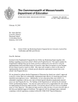 The Commonwealth of Massachusetts Department of Education 350 Main Street, Malden, Massachusetts 02148-5023 Telephone: (781) 338-3700 TTY: N.E.T. Relay 1-800-439-2370 February 10, 2005 Mr. James Bertram Executive Director Massasoit School 6 Columbian Street Braintree, MA 02184 Re: Onsite Follow-up Monitoring Report: Program Review Corrective Action Plan Verification and Mid-cycle Review Dear Mr. Bertram: Enclosed is the Department's Program Review Follow-up Monitoring Report together with findings regarding your private school’s Mid-Cycle Program Review. This report contains the Department's findings based on the onsite activities conducted in your school to verify the implementation status and effectiveness of corrective steps taken in response to your Program Review Report issued on April 24, 2002. This report also includes a report on the status of implementation for new state or federal special education requirements enacted since your school’s last Program Review. We are pleased to indicate that the Department of Education has found your school’s approved Corrective Action Plan to be substantially implemented and effective in remedying previously identified noncompliance issues. Additionally, we have determined that your school is in substantial compliance with any new state or federal special education requirements enacted since your last Program Review. The findings of the Department are included in the attached Follow-up Monitoring Report. You and your entire staff are to be congratulated for your efforts in implementing all necessary improvements. Your private school will now receive an updated status of “Full Approval.” This approval shall remain in effect for three (3) years from the date of this letter and attached approval certificate. This approval will be contingent upon continued compliance with all regulations contained within 603 CMR 28.00 “Special Education Regulations” and 603 CMR 18.00 “Program And Safety Standards For Approved Public Or Private Day And Residential Special Education School Programs.” The Department of Education may change this approval status at any point during this three-year period if circumstances arise that warrant such a change. The Department will notify you of your school’s next regularly scheduled Program Review several months before it is to occur. At this time we anticipate the Department's next routine monitoring visit to occur sometime during the school year 2007-08, unless the Department determines that there is some reason to schedule this visit earlier. Your staff's cooperation throughout these follow-up monitoring activities is appreciated. Should you require additional clarification of information included in our report, please do not hesitate to contact the Onsite Team Chairperson at 781-338-3711. Sincerely, Nina M. Marchese, M.Ed., Program Review Follow-up Chairperson Program Quality Assurance Services John D. Stager, Administrator Program Quality Assurance Services c: David P. Driscoll, Commissioner of Education Joseph Collins, Chairperson, Board of Directors Jane Beckler, Local Program Review Coordinator Encl.: Follow-up Monitoring Report MASSACHUSETTS DEPARTMENT OF EDUCATION PROGRAM REVIEW MASSASOIT SCHOOL ONSITE VERIFICATION OF CORRECTIVE ACTION PLAN IMPLEMENTATION AND/OR IDENTIFICATION OF ADDITIONAL FINDINGS REQUIRING CORRECTIVE ACTION Onsite Visit Conducted on January 12-14, 2005 Date of this Report February 10, 2005 Criterion Number and Topic Implementation Status of Requirements or Corrective Action Plan Determined to be Substantially Implemented Method(s) of Verification Comments Regarding Corrective Action Plan Implementation 1.3 Program’s Curriculum 28.09(9) Corrective Action Plan Determined to be Not Fully Implemented or Additional Issues Identified Documentation Interviews Massasoit School provides a description of the program’s curriculum and general types of staff qualifications that have been established to meet all special education and related services included in students’ Individualized Education Programs. The plan also includes opportunities for students to participate in daily recreational and leisure activities that are appropriate to the ages, interests and needs Findings Regarding Incomplete Implementation of Approved Corrective Action Plan or Identification of Additional Issues of Noncompliance Further Corrective Action Ordered by the Department of Education and Timelines for Implementation and Further Progress Reporting Criterion Number and Topic Implementation Status of Requirements or Corrective Action Plan Determined to be Substantially Implemented Method(s) of Verification Comments Regarding Corrective Action Plan Implementation of the students. 2.2 Approvals, Licenses, Certificates of Inspection 28.09 (2)(b)4-5 28.09(5) 28.09(6) 18.04(1) 102 CMR 3.06 (4)(b) Corrective Action Plan Determined to be Not Fully Implemented or Additional Issues Identified Documentation Observation Massasoit School maintains all current licenses, approvals and certificates of inspection by state and local agencies in a place available for public and employee review. The safety and PCB inspections are now available for review by employees and the public. The building occupancy inspection expired on 1/5/05; however, Massasoit has submitted their payment and is waiting for the town to complete the inspection. A copy of the building occupancy to be submitted to the Department by 3/15/05. 2 Findings Regarding Incomplete Implementation of Approved Corrective Action Plan or Identification of Additional Issues of Noncompliance Further Corrective Action Ordered by the Department of Education and Timelines for Implementation and Further Progress Reporting Criterion Number and Topic Implementation Status of Requirements or Corrective Action Plan Determined to be Substantially Implemented Method(s) of Verification Comments Regarding Corrective Action Plan Implementation 2.3 OCCS Licensure (Not Applicable to D