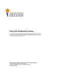 Early and Adolescent Literacy This report summarizes the activities funded by the state budget, Chapter 68 of the Acts of 2011, line item 7010-0033 for literacy and early literacy programs. The report covers activities through February 2012. Massachusetts Department of Elementary and Secondary Education 75 Pleasant Street, Malden, MA 02148-4906 Phone 781-338-3000 TTY: N.E.T. Relay 800-439-2370 www.doe.mass.edu This document was prepared by the Massachusetts Department of Elementary and Secondary Education Mitchell D. Chester, Ed.D. Commissioner Board of Elementary and Secondary Education Members Ms. Maura Banta, Chair, Melrose Dr. Vanessa Calderón-Rosado, Milton Ms. Harneen Chernow, Jamaica Plain Mr. Gerald Chertavian, Cambridge Mr. Matthew Gifford, Chair, Student Advisory Council, Malden Ms. Beverly Holmes, Springfield Dr. Jeff Howard, Reading Ms. Ruth Kaplan, Brookline Dr. Dana Mohler-Faria, Bridgewater Mr. Paul Reville, Secretary of Education, Worcester Mr. David Roach, Malden Mitchell D. Chester, Ed.D., Commissioner and Secretary to the Board The Massachusetts Department of Elementary and Secondary Education, an affirmative action employer, is committed to ensuring that all of its programs and facilities are accessible to all members of the public. We do not discriminate on the basis of age, color, disability, gender identity, national origin, race, religion, sex or sexual orientation. Inquiries regarding the Department’s compliance with Title IX and other civil rights laws may be directed to the Human Resources Director, 75 Pleasant St., Malden, MA 02148-4906. Phone: 781-338-6105. © 2010 Massachusetts Department of Elementary and Secondary Education Permission is hereby granted to copy any or all parts of this document for non-commercial educational purposes. Please credit the “Massachusetts Department of Elementary and Secondary Education.” This document printed on recycled paper Massachusetts Department of Elementary and Secondary Education 75 Pleasant Street, Malden, MA 02148-4906 Phone 781-338-3000 TTY: N.E.T. Relay 800-439-2370 www.doe.mass.edu Massachusetts Department of Elementary and Secondary Education 75 Pleasant Street, Malden, Massachusetts 02148-4906 Telephone: (781) 338-3000 TTY: N.E.T. Relay 1-800-439-2370 Mitchell D. Chester, Ed.D. Commissioner December 2012 To Members of the Legislature and Interested Parties: I am pleased to present to you the report on the Department’s initiatives in early and adolescent literacy funded by the state budget, Chapter 68 of the Acts of 2011, line item 7010-0033. The Department used these funds to provide grants to school districts to improve literacy instruction. In addition, these funds enabled the Department to develop and publish literacy resources used throughout the Commonwealth and to convene statewide and regional conferences for educators. These funds played a particularly crucial role as districts aligned their curricula to the challenging college and career readiness standards of the 2011 Massachusetts Curriculum Framework for English Language Arts and Literacy, incorporating the Common Core State Standards. I want to thank the members of the Legislature for their continued support of higher levels of literacy in the Commonwealth. Sincerely, Mitchell D. Chester, Ed.D. Commissioner of Elementary and Secondary Education Table of Contents I. Overview of Line Item 7010-0033 – Literacy and Early Literacy Programs ........... 1 II. Grant Program for Literacy Professional Development ......................................... 2 III. Statewide and Regional Professional Development Programs and Resources . 4 A. Statewide Professional Development Meetings ................................................... 5 B. Regional Professional Development Meetings..................................................... 5 C. Development of Literacy Resources .................................................................... 5 IV. Evaluation of the Literacy and Early Literacy Programs ...................................... 6 A. Findings from the FY2011 Grants ....................................................................... 6 i. Participant Feedback ........................................................................................ 6 ii. Impact on Students .......................................................................................... 7 B. FY2012 Evaluation Approach………………………………………………… .….....9 V. Conclusion ................................................................................................................ 9 Appendix – FY2012 Literacy Partnership Grant Award Details ............................... 11 I. Overview of Line Item 7010-0033 – Literacy and Early Literacy Programs The Department of Elementary and Secondary Education respectfully submits this Report to the Legislature for line item 7010-0033: For literacy and early literacy programs; provided, that these programs shall provide ongoing evaluation of the outcomes thereof; provided further, that programs receiving funding through this item shall document the outcomes of evaluations; provided further, that evaluations shall be compared to measurable goals and benchmarks that shall be developed by the department; and provided further, that programs receiving funds from this item shall provide to the department, the house and senate committees on ways and means and the joint committee on education, an annual report detailing program success in meeting measurable goals and benchmarks … $3,147,940 After joining the Department of Elementary and Secondary Education (Department) in May 2008, Commissioner Mitchell Chester undertook a significant reorganization of the Department, a key feature of which was the creation of a Center for Curriculum and Instruction. On numerous occasions, Commissioner Chester has stated that he views the Center as the hub of the Department’s efforts. Essential to the Center’s mis