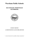 Wareham Public Schools SECONDARY PORTFOLIO HANDBOOK STUDENT EDITION A GUIDE FOR THE CLASS OF 2009 & BEYOND “…to educate all students for life’s responsibilities, challenges, and opportunities.” WAREHAM PUBLIC SCHOOLS Secondary Portfolio Handbook Table of Contents Introduction to the Portfolio Process ................................................. page 3 Student Responsibility ....................................................................... page 3 Mission Statements ............................................................................ page 4 Massachusetts Learning Standards-English Language Arts.............. page 5 Massachusetts Learning Standards-Mathematics .............................. page 7 Portfolio Requirements / Assessing the Portfolio.............................. page 10 Reflection Sheet ................................................................................. page 11 Portfolio Log Sheets .......................................................................... page 12 Final Reflection.................................................................................. page 20 Student Contract................................................................................. page 21 “…to educate all students for life’s responsibilities, challenges, and opportunities.” Page 2 WAREHAM PUBLIC SCHOOLS INTRODUCTION TO THE PORTFOLIO PROCESS The Wareham Public Schools has adopted the Standards-Based Portfolio to fulfill the requirements for Individual Student Success Plans and Educational Proficiency Plans as outlined by the Massachusetts Department of Elementary and Secondary Education under the No Child Left Behind Act. These requirements demand a documentation of students’ work aligned with the Massachusetts Curriculum Frameworks and Learning Standards, specifically standards that have not been met with proficiency. Through the portfolio system students will not only collect their completed work but will also reflect on their efforts to demonstrate proficiency on common assignments in English language arts and mathematics. As the students build their portfolio through each school year, they will be able to examine their work and their improving proficiency. Students will also include at least one assignment per semester from science and social studies classes as they demonstrate application of English language arts and mathematics skills in these other subjects. Types of Portfolio Artifacts (assignments) - 2 types Teacher-generated - these are assignments that the teacher gives the whole class as an opportunity to demonstrate proficiency in a given Learning Standard. Initially, these will be where most of the portfolio entries will come from. All of these assignments have clear connections to specific Learning Standard and the work is assessed using a related rubric. Student-initiated classroom tasks - these are assignments that you complete in class that have not been deliberately selected by the classroom teacher as portfolio entries. However, you have demonstrated proficiency related to a Learning Standard and have decided to add this assignment to your portfolio. Examples include research papers photos/video of art projects, musical performances or any work that shows student pride in it. These assignments must be validated by your classroom teacher to be submitted into your portfolio. Student Responsibility As the student, you are expected to complete the assigned portfolio task within a specified predetermined timeframe. If there are technical problems or other extenuating circumstances that prevent completion of an entry, it will be your responsibility to seek out a solution to the problem. While the school will provide the resources and support necessary for successful portfolio completion, it is the student's responsibility to fulfill all requirements. Students may also choose additional submissions to the portfolio that go beyond the requirements once the requirements are met. Each entry shall include the following: A. Student Work - An assignment that has been given by the classroom teacher. B. Student Reflection piece which gives a brief description of work, explanation of why the piece is in the portfolio, reflection of the learning process and description of how this work meets the required Learning Standards. C. Rubrics - to ensure that each entry has achieved the standard or school-wide expectations by classroom teachers “…to educate all students for life’s responsibilities, challenges, and opportunities.” Page 3 WAREHAM PUBLIC SCHOOLS Mission of Wareham Public Schools The mission of the Wareham Public Schools is to educate all students for life’s responsibilities, challenges, and opportunities. Wareham Cooperative Junior/Senior High School Mission Statement The Wareham Cooperative Junior Senior High School fosters an environment for the students’ academic and personal growth in preparation for their participation in society. Wareham High School Mission Statement Wareham High School will prepare its students for further academic and occupational opportunities, social responsibility, and commitment to community. By maintaining high academic standards through a rigorous course of study, students will be expected to apply effective effort in order to master skills and to value scholarship, citizenship, craftsmanship, and sportsmanship. Students will demonstrate that they are independent and critical thinkers who can make sound judgments and decisions as citizens, consumers, and life long learners Wareham High School Academic Expectations Wareham Students Will ACQUIRE Information in a Variety of Ways A.1 By actively and critically reading, listening, discussing, observing, and participating A.2 By questioning appropriately A.3 By researching independently A.4 By locating and retrieving information through appropriate use of technology Wareham Students Will INTERPRET Information in a Variety of Ways I.1 By organizing an