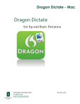 Dragon Dictate - Mac Dragon Dictate Set Up and Basic Dictation Technology Learning Center fsrc@csus.edu www.csus.edu/irt/FSRC/ June 28, 2016 2 Table of Contents Dragon Naturally Speaking ................................................................................................................................................... 1 Introduction ............................................................................................................................................................................ 3 Installation .......................................................................................................................................................................... 3 Creating a Profile................................................................................................................................................................. 3 Microphone Positioning ...................................................................................................................................................... 4 Microphone Setup .......................................................................................................................................................... 4 Voice Training.................................................................................................................................................................. 5 Using Dragon ........................................................................................................................................................................... 5 Auto Formatting .................................................................................................................................................................. 6 Voice Commands ................................................................................................................................................................ 6 Mouse Grid Command ........................................................................................................................................................ 9 Microsoft Word Command ................................................................................................................................................. 9 Cheat Sheet ........................................................................................................................................................................... 10 3 Introduction Dragon dictate for Mac 2.5 is speech recognition software, which converts speech to text. This also enables you to operate your Mac by just speaking to it. You can control your favorite applications including; Microsoft Word 2011. With Dragon Dictate you can produce reports, email, articles, books, research notes, online content, and more — quickly, easily, and accurately. Installation This software is installed on two iMac stations in AIRC 3012 in the Academic Information Resource Center. Please contact the Technology Learning Center AIRC 3012/278-6112/fsrc@csus.edu for more details. You can purchase the software for personal use1 as well. Creating a Profile Follow these steps to create a new profile. 1. Begin by opening Dragon Dictate for Mac 2.5. Enter a name for your profile in the ‘Save as’ field in the window that appears. 2. Now, select a save destination. By default your profile will be saved in ‘Documents’. You should select your U drive or whichever personal media you have with you. User Profiles that are saved to the computer will be deleted once you log off from the computer. 3. Click ‘Choose’. 4. In the next window, the profile name is visible on the left side. The profile details (microphone, spelling and accent) are on the right. 5. Click on the tab to the left of your profile name to add a picture. You can either choose an existing picture from your library or take a new picture. You can also simply drag and drop a photo. This associates a picture to your profile. 6. Now moving to the right, first select the type of microphone that is being used. It’s recommended to use a microphone that comes with DD2.5 as it is designed to provide maximum efficiency which ensures accuracy while translating speech to text. 7. Then select the type of spelling. The options available to you are; US or UK. This provides a better understanding of a person’s voice and dialect. So choose the appropriate option. 8. Then choose accent. This depends on the spelling chosen. Choose the accent that describes you and proceed by clicking ‘Continue’. 1 http://www.nuance.com/videoplayer/videoplayer.asp?h=411&n=01-installreg&w=662&p=naturallySpeaking/Dictate/InstructionalVideos/&autoPlay=false&videoPage=true 4 Microphone Positioning The position of microphone can significantly affect the recognition accuracy. Here are few points that should be kept in mind to guarantee error free speech to text conversion. 1. Do not place the microphone in front of your mouth. 2. Keep the microphone off to the side (about a thumb width away from the corner of your mouth). 3. Make sure the talk side or the dot side is facing towards you. Note: If you are using another microphone and not the one provided with DD2.5, make sure it is setup properly and refer the manual provided with it for optimal use. Note: The Technology Learning Center lab 3013 has microphones set up. They work exceptionally well with Dragon. Microphone Setup Let’s go through microphone setup. This will automatically adjust the volume to an ideal level. 1. Click on the red stop sign with a microphone icon to start the recording. 2. Begin reading the text that appears on the screen, clearly and evenly. 5 3. When microphone setup has heard enough, a portion of what you recorded will be played back. Listen for problems like too much background noise or distortion. With microphone set up completed successfully, you are ready to begin voice training. Voice Training Voice 