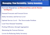 Managing Flow Variability: Safety Inventory Managing Flow Variability: Safety Inventory 1 Forecasts Depend on: (a) Historical Data and (b) Market Intelligence. Demand Forecasts and Forecast Errors Safety Inventory and Service Level Optimal Service Level – The Newsvendor Problem Lead Time Demand Variability Pooling Efficiency through Aggregation Shortening the Forecast Horizon Levers for Reducing Safety Inventory Managing Flow Variability: Safety Inventory Four Characteristics of Forecasts 2 Forecasts are usually (always) inaccurate (wrong). Because of random noise. Forecasts should be accompanied by a measure of forecast error. A measure of forecast error (standard deviation) quantifies the manager’s degree of confidence in the forecast. Aggregate forecasts are more accurate than individual forecasts. Aggregate forecasts reduce the amount of variability – relative to the aggregate mean demand. StdDev of sum of two variables is less than sum of StdDev of the two variables. Long-range forecasts are less accurate than short-range forecasts. Forecasts further into the future tends to be less accurate than those of more imminent events. As time passes, we get better information, and make better prediction. Managing Flow Variability: Safety Inventory Demand During Lead Time is Variable N(μ,σ) 3 Demand of sand during lead time has an average of 50 tons. Standard deviation of demand during lead time is 5 tons Assuming that the management is willing to accept a risk no more that 5%. Managing Flow Variability: Safety Inventory Forecast and a Measure of Forecast Error 4 Forecasts should be accompanied by a measure of forecast error Managing Flow Variability: Safety Inventory Demand During Lead Time Inventory 5 Demand during LT Lead Time Time Managing Flow Variability: Safety Inventory ROP when Demand During Lead Time is Fixed 6 LT Managing Flow Variability: Safety Inventory Demand During Lead Time is Variable 7 LT Managing Flow Variability: Safety Inventory Demand During Lead Time is Variable 8 Inventory Time Managing Flow Variability: Safety Inventory Safety Stock Quantity 9 A large demand during lead time Average demand during lead time ROP Safety stock reduces risk of stockout during lead time Safety stock LT Time Managing Flow Variability: Safety Inventory Safety Stock Quantity 10 ROP LT Time Managing Flow Variability: Safety Inventory Re-Order Point: ROP 11 Demand during lead time has Normal distribution. If we order when the inventory on hand is equal to the average demand during the lead time; then there is 50% chance that the demand during lead time is less than our inventory. However, there is also 50% chance that the demand during lead time is greater than our inventory, and we will be out of stock for a while. We usually do not like 50% probability of stock out We can accept some risk of being out of stock, but we usually like a risk of less than 50%. Managing Flow Variability: Safety Inventory Safety Stock and ROP 12 Risk of a stockout Service level Probability of no stockout ROP Average demand Quantity Safety stock 0 z z-scale Each Normal variable x is associated with a standard Normal Variable z x is Normal (Average x , Standard Deviation x) z is Normal (0,1) Managing Flow Variability: Safety Inventory z Values 13 Risk of a stockout Service level Probability of no stockout RO P Average demand Quantity Safety stock 0 z z-scale SL 0.9 0.95 0.99 z value 1.28 1.65 2.33 There is a table for z which tells us a) Given any probability of not exceeding z. What is the value of z b) Given any value for z. What is the probability of not exceeding z Managing Flow Variability: Safety Inventory μ and σ of Demand During Lead Time 14 Demand of sand during lead time has an average of 50 tons. Standard deviation of demand during lead time is 5 tons. Assuming that the management is willing to accept a risk no more that 5%. Find the re-order point. What is the service level. Service level = 1-risk of stockout = 1-0.05 = 0.95 Find the z value such that the probability of a standard normal variable being less than or equal to z is 0.95 Go to normal table, look inside the table. Find a probability close to 0.95. Read its z from the corresponding row and column. Managing Flow Variability: Safety Inventory z Value using Table 15 Given a 95% SL 95% Probability Page 319: Normal table 0.05 The table will give you z z Second digit after decimal Up to the first digit after decimal Probability Z = 1.65 1.6 Managing Flow Variability: Safety Inventory The standard Normal Distribution F(z) 16 z F(z) = Prob( N(0,1) < z) F(z) 0 z 0.0 0.1 0.2 0.3 0.4 0.5 0.6 0.7 0.8 0.9 1.0 1.1 1.2 1.3 1.4 1.5 1.6 1.7 1.8 1.9 2.0 2.1 2.2 2.3 2.4 2.5 2.6 2.7 2.8 2.9 3.0 3.1 3.2 3.3 0.00 0.5000 0.5398 0.5793 0.6179 0.6554 0.6915 0.7257 0.7580 0.7881 0.8159 0.8413 0.8643 0.8849 0.9032 0.9192 0.9332 0.9452 0.9554 0.9641 0.9713 0.9772 0.9821 0.9861 0.9893 0.9918 0.9938 0.9953 0.9965 0.9974 0.9981 0.9987 0.9990 0.9993 0.9995 0.01 0.5040 0.5438 0.5832 0.6217 0.6591 0.6950 0.7291 0.7611 0.7910 0.8186 0.8438 0.8665 0.8869 0.9049 0.9207 0.9345 0.9463 0.9564 0.9649 0.9719 0.9778 0.9826 0.9864 0.9896 0.9920 0.9940 0.9955 0.9966 0.9975 0.9982 0.9987 0.9991 0.9993 0.9995 0.02 0.5080 0.5478 0.5871 0.6255 0.6628 0.6985 0.7324 0.7642 0.7939 0.8212 0.8461 0.8686 0.8888 0.9066 0.9222 0.9357 0.9474 0.9573 0.9656 0.9726 0.9783 0.9830 0.9868 0.9898 0.9922 0.9941 0.9956 0.9967 0.9976 0.9982 0.9987 0.9991 0.9994 0.9995 0.03 0.5120 0.5517 0.5910 0.6293 0.6664 0.7019 0.7357 0.7673 0.7967 0.8238 0.8485 0.8708 0.8907 0.9082 0.9236 0.9370 0.9484 0.9582 0.9664 0.9732 0.9788 0.9834 0.9871 0.9901 0.9925 0.9943 0.9957 0.9968 0.9977 0.9983 0.9988 0.9991 0.9994 0.9996 0.04 0.5160 0.5557 0.5948 0.6331 0.6700 0.7054 0.7389 0.7704 0.7995 0.8264 0.8508 0.8729 0.8925 0.9099 0.9251 0.9382 0.9495 0.9591 0.9671 0.9738 0.9793 0.9838 0.9875 0.9904 0.9927 0.9945 0.9959 0.9969 0.9977 0.9984 0.9988 0.9992 0.9994 0.9996 0.05 0.5199 0.5596 0.5987 0.6368 0.6736 0.7088 0.7422 0.7