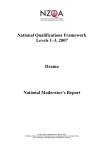 National Qualifications Framework Levels 1–3, 2007 Drama National Moderator’s Report © New Zealand Qualifications Authority, 2007 All rights reserved. No part of this publication may be reproduced by any means without prior permission of the New Zealand Qualifications Authority. National Qualifications Framework Levels 1–3 (Drama) 2007 — page 2 General Guidance for Assessors of Achievement and Unit Standards The purpose of external moderation is to provide reassurance that assessor judgments are at the national standard and are made on the basis of assessment materials that are fair and valid. All assessment materials are expected to: • give the learner the opportunity to meet the requirements of the standard • have an assessment schedule that gives evidence of appropriate learner responses and clear judgments at all levels. The Ministry of Education contracted subject experts to write assessment resources for achievement standards. These are not pre-moderated. The intention is that they are modified to suit teaching programmes and learner needs. They do not provide “rules” but suggest different ways of assessing to the nationally registered standard. General Overall Comment The moderation of internally assessed achievement standards and unit standards in Drama continues to make a significant impact on the teaching of the subject. It is important that assessors adapt the MOE/NZQA resources to suit the needs of their learners and change the context where it is applicable. Generally assessor decisions are accurate and consistent. Level 3 is a challenge for some assessors, especially when awarding Merit and Excellence. To assist with deciding which grade a learner has achieved assessors, the standard should refer to the achievement criteria and the explanatory notes of the standard. Sometimes this information is overlooked and care needs to be taken to focus on the wording of the standard, as well as using the latest version. It is also important that the assessor’s rationale for their decisions accompany the materials sent for moderation. It is essential to have visual evidence for assessment, however, the recording and editing of this evidence remains a problem for many assessors. The identification of learners on the visual evidence is another concern that needs to be addressed. Portfolio evidence is an expectation at all levels as a way to demonstrate achievement of outcomes and performance. It can be gathered in a variety of ways, according to the task and level. Such evidence is essential for making assessment decisions especially for terms such as interpret, select, reference, communicate, apply, justify, record, document. ACHIEVEMENT STANDARDS LEVEL 1 90006: Use drama techniques Evidence (written or oral) of the justification for both the choices made in the application of the techniques, and for the dramatic situation, needs to accompany visual evidence. Learners need to show they are capable of applying the specified drama techniques equally. A clear justification of choices is required. National Qualifications Framework Levels 1–3 (Drama) 2007 — page 3 90007: Use elements and conventions to devise, structure and perform a drama The process to performance needs to be documented. Learners need to be given enough guidance for the processing ie to move from the initial stimulus to the end product. “Select” implies the need for a rationale that explains choices. This needs to be given as a directive within tasks. Merely making decisions is not indicative of devising; learners need to be asking themselves how their decisions came about. 90008: Demonstrate knowledge of a drama /theatre form through a practical presentation. Evidence (oral, visual or written material) needs to accompany the practical presentation. There needs to be clear links between knowledge of the form and the features chosen. Learners need to be aware when downloading information that, without accompanying explanation, it does not evidence understanding. It is the knowledge and understanding of the form rather than the performance /presentation that is assessed. Learners need to carefully rehearse their performance, as it clarifies what they understand and helps them to articulate that understanding in their other evidence. 90009: Perform an acting role. Documentation of the production process should be ongoing and not be recorded in hindsight. The learner is required to “actively participate in the production process” to enable a judgement to be made on this criterion. In order to “communicate a role “the learner needs to record the development of the role. “appropriate” use of techniques must be able to be measured against knowledge of situation and character. 90010: Perform a technical or production role. Learners need to document the production process i.e. o provide evidence of their intentions and understanding of their work o identify the production concept, and o explain their choices as to the use of technology that will support the production concept. The explanation of how the design concept is met should be a rationale for choices not just a list of choices. LEVEL 2 90299: Apply drama techniques in an improvised group context. Learners need to document their planned use and combination of drama techniques and justification of these decisions. 90300: Apply drama techniques in a group within scripted context. The interpretation of the text and the planned use and combination of specific drama techniques needs to be recorded. Learners need to justify their decisions and submit an annotated script. EN10 needs to be observed, sufficient detail to show interpretation of scene and justification for selection of techniques is required. 90301: Structure record and perform devised drama using elements and conventions. National Qualifications Framework Levels 1–3 (Drama) 2007 — page 4 Learners need to clearly identify techniques, conventions and technologies as well as a r