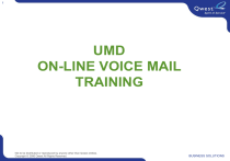 1 UMD ON-LINE VOICE MAIL TRAINING Not to be distributed or reproduced by anyone other than Qwest entities. Copyright © 2006 Qwest All Rights Reserved. BUSINESS SOLUTIONS 2 INTRODUCTION •Navigation: slide bar, stop and pause •In service Monday, August 28th •Access Number: 6666 or 218-726-6666. •To set up your mailbox early, dial 6665. •Faxing. •Help Desk 8847. Not to be distributed or reproduced by anyone other than Qwest entities. Copyright © 2006 Qwest All Rights Reserved. BUSINESS SOLUTIONS 3 Not to be distributed or reproduced by anyone other than Qwest entities. Copyright © 2006 Qwest All Rights Reserved. BUSINESS SOLUTIONS 4 STANDARD COMMANDS Standard commands: • Play is always 2. • Record is always 5. • Help is always *. Additional Message and Mailbox features: – Commands for current message begin with 7. – Commands to manage your mailbox begin with 8. Always available: • Star key * • Number key # Help Stop playback or recording Cancel a menu selection End data entry End addressing Not to be distributed or reproduced by anyone other than Qwest entities. Copyright © 2006 Qwest All Rights Reserved. BUSINESS SOLUTIONS 5 ACCESSING CALL PILOT •Mailbox number = 4 digit extension. •Password 12 + 4 digit extension. • Lift handset, press the Message key or dial extension 6666. • NOTE: EARLY SETUP DIAL 6665. • Enter your mailbox number plus # (if at your telephone press #). • Enter your password plus #. Not to be distributed or reproduced by anyone other than Qwest entities. Copyright © 2006 Qwest All Rights Reserved. BUSINESS SOLUTIONS 6 SET UP YOUR MAILBOX 3 STEPS STEP 1: ASSIGN YOUR PASSWORD • Your initial password is 12 plus your 4 digit mailbox number. • The system will automatically prompt you through the steps to change your password. • Press 84, enter your current password, plus # (12 + xxxx). • Enter your new password, plus #. • Enter your new password again, plus #. • Your password has been changed. You will be returned to the main menu. • To hang up, enter 83. NOTE: Choose a password between 6 and 16 digits in length. It may not be an easy sequence i.e. 111111, 123456 etc. Not to be distributed or reproduced by anyone other than Qwest entities. Copyright © 2006 Qwest All Rights Reserved. BUSINESS SOLUTIONS 7 ****PAUSE**** ASSIGN YOUR PASSWORD: •Lift handset, dial extension 6665. •Enter your mailbox number plus # (if at your telephone press #). •Enter your password (12 + mailbox number) plus #. •Press 84, enter your current password, plus # (12 + xxxx). •Enter your new password, plus #. •Enter your new password again, plus #. •Your password has been changed. You will be returned to the main menu. •To hang up, enter 83. Not to be distributed or reproduced by anyone other than Qwest entities. Copyright © 2006 Qwest All Rights Reserved. BUSINESS SOLUTIONS 8 RECORD YOUR FIRST AND LAST NAME STEP 2: (Personal Verification) •Enter 829 to change your recorded name. •Press 5 to record, wait for the tone; then speak your first and last name followed by #. •Your personal verification will automatically be played. • To delete your name recording, press 76 and re-record. • To return to the start of your mailbox, press 4. •To hang up, enter 83. NOTE: Always delete (76) the current name before re-recording. Not to be distributed or reproduced by anyone other than Qwest entities. Copyright © 2006 Qwest All Rights Reserved. BUSINESS SOLUTIONS 9 ****PAUSE**** RECORD YOUR FIRST & LAST NAME •Lift handset, dial extension 6665. •Enter your mailbox number plus # (if at your telephone press #). •Enter your password plus #. •Enter 829 to change your recorded name. •Press 5 to record, wait for the tone; then speak your first and last name followed by #. •Your personal verification will automatically be played. • To delete your name recording, press 76 and re-record. • To return to the start of your mailbox, press 4. •To hang up, enter 83. Not to be distributed or reproduced by anyone other than Qwest entities. Copyright © 2006 Qwest All Rights Reserved. BUSINESS SOLUTIONS 1 0 PERSONAL GREETINGS STEP 3: RECORD YOUR GREETING • Enter 82 to record your greeting. • To record your external greeting, press 1. • To record your internal greeting, press 2. • To record your temporary greeting, press 3. • Press 5 to record, wait for the tone, record your greeting, enter # to stop recording. • To verify greeting, press 2; to delete your greeting, press 76. • To return to the start of your mailbox, press 4. NOTE: NOTE: NOTE: Always delete the current recording before re-recording. You may record greetings for both external and internal callers; these greetings will be heard if your calls are routed to your voice mailbox. Internal = On Campus External = Off Campus Not to be distributed or reproduced by anyone other than Qwest entities. Copyright © 2006 Qwest All Rights Reserved. BUSINESS SOLUTIONS 1 1 ****PAUSE**** RECORD YOUR GREETING •Lift handset, dial extension 6665. •Enter your mailbox number plus # (if at your telephone press #). •Enter your password plus #. •Enter 82 to record your greeting. •To record your external greeting, press 1. •To record your internal greeting, press 2. •To record your temporary greeting, press 3. •Press 5 to record, wait for the tone, record your greeting, enter # to stop recording. •To verify greeting, press 2; to delete your greeting, press 76. •To return to the start of your mailbox, press 4. •To hang up, enter 83. Not to be distributed or reproduced by anyone other than Qwest entities. Copyright © 2006 Qwest All Rights Reserved. BUSINESS SOLUTIONS 1 2 DISTRIBUTION LISTS •From the main menu enter 85 “Call Pilot Tools”. •Enter 5 to create a distribution list. •Enter the distribution list number (1 – 99) plus #. •To compose the distribution list, enter 5. •Enter a list of addresses, separated by #; end the list with an extra #. 