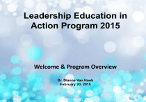 Leadership Education in Action Program 2015 Welcome & Program Overview Dr. Dianne Van Hook February 20, 2015 6/29/2016 Spring 2015 FLEX 1 6/29/2016 Spring 2015 FLEX 2 Today We Will Focus On: Introduction: What is LEAP? • What will it let you do? • What will it challenge you to do? • Why do we LEAP? • Why is LEAP important to COC? How do change and LEAP connect? • Building your ability to lead and shape change • Courageous Leadership • Leading in a “Connected” Era • Connective Leadership 6/29/2016 Spring 2015 FLEX 3 What is LEAP? 6/29/2016 Spring 2015 FLEX 4 First of all, what is LEAP? LEAP is a unique program designed to help pinpoint and develop leadership in members of our team: Leadership: • Inspires others-staff, faculty, friends, peers, supervisors • Inspires growth of the community college system • Inspires themselves • Get things done! The First LEAP: Class of 2008 6/29/2016 Spring 2015 FLEX 5 LEAP Is an opportunity to chart a new course In LEAP, we share a common focus: • Exploring potential, building capacity, creating linkages, and building a common knowledge base. We encourage you to think outside the boxes you put yourself in. We start with small steps, encouraging you to chat with strangers, join a new team, and look for chances to do different things. We ask questions, knowing that each intelligent question helps to strengthen the individual and humanize the process. Ask Questions, See the Macro View and Network! 6/29/2016 Spring 2015 FLEX 6 LEAP Is more than just another workshop: LEAP encourages you to view the world as a photographer does; to use all of your lenses, and to change your position and perspective. • From close-up to wide-angle • From aerial to macro • From the obvious to memory within the moment or relationship LEAP lets us develop our capacity as a college! 6/29/2016 Spring 2015 FLEX 7 LEAP is the time to discover YOU! Understanding that our greatest journey is our internal voyage Embracing the freedom to discover yourself. Finding your essence, the unique you. Eschewing those people who want to classify you, who want you to confirm yourself as part of a group. Discovering that you are a unique individual. Accepting that NOW is the time to live your own life! “Your time is limited so don’t waste it living someone else’s life.” ~Steve Jobs 6/29/2016 Spring 2015 FLEX 8 Envision the whole journey Start a new journey Whittle it down into “bite-size” pieces Keep reaching, keep working until the first step seems attainable Take it Then others will follow 6/29/2016 Spring 2015 FLEX 9 Give yourself some space to discover Look at the world surrounding you See how your fears (real or imaginary) limit your potential Push yourself Expand your horizons on what’s possible for you Visit new dimensions of your potential Develop new skills Exert yourself “Make the most of yourself for that is all there is of you.” ~Ralph Waldo Emerson 6/29/2016 Spring 2015 FLEX 10 LEAP lets you: • • • • • • • • • Break out of outdated thought patterns Help you get your mind “unstuck” and generate new ideas Challenge assumptions Look at problems differently Consider new ideas Seek solutions from unexpected places Express yourself Give your mind permission to create its own ideas Shift perspective to yield different ideas Experience a new way of thinking and expand your competencies! 6/29/2016 Spring 2015 FLEX 11 Why do we LEAP? 6/29/2016 Spring 2015 FLEX 12 LEAP affords you an opportunity to develop your skills and evolve into the leader you want to be, one learning block at a time. Those essential building blocks include: • Leading - Assessing your own personal leadership style. • Advocating - Case making on the departmental, local and state levels. • Envisioning - Researching, planning, and evaluating goals for your areas of responsibility and beyond. • Generating resources - “To effectively partner with others you must be knowledgeable, believe in your mission, and help others see why you are a good investment.” Making the ask both internally and externally. • Networking – “It’s all about relationships.” Building internal and external partnerships, public speaking, appropriate messaging, and creating your 90 second pitch. 6/29/2016 Spring 2015 FLEX 13 • • • • • Connections Courage Confidence Vision Inspiration • • • • • Teamwork skills Know-how Ability to get involved Savvy The moxie to bring it all to the table! You are preceded by many who have! 6/29/2016 Spring 2015 FLEX 14 6/29/2016 Spring 2015 FLEX 15 A survey was given to all LEAP participants in Spring 2014, and of those who responded: • 57% have become involved in a community organization or joined a board • 20.5% received a promotion to a higher level position at COC • 51% are pursuing additional education (professional development opportunities, mentoring, graduate education) to increase their potential of acquiring additional leadership skills or a new position • 58% have taken on new responsibilities in their current position • 54% have successfully implemented teambuilding strategies learned during LEAP • 61% have engaged in advocacy efforts (for their own department/program, a community organization, or a statewide initiative) 6/29/2016 Spring 2015 FLEX 16 Over the past seven years, we have held five LEAP 1 and two LEAP 2 sessions. Out of those sessions, we have had 34 Solution Team projects with nearly all implemented or in the process of being implemented. 6/29/2016 Spring 2015 FLEX 17 2008 • GO! & PAL Program • Synergy • Student Success Points • WeConnect • Enrollment Management • Online Student Learning Support • Learning communities/field studies 6/29/2016 Spring 2015 FLEX 2009 • Gardens of the Canyon • BIT (Behavioral Intervention Team) • Idea Incubator • Re-entry program • Project-based learning • Arts & Business Learning Communities 18 2010 • Call Center/Intelli