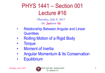 PHYS 1441 – Section 001 Lecture #16 Thursday, July 9, 2015 Dr. Jaehoon Yu • Relationship Between Angular and Linear Quantities • • • • • Rolling Motion of a Rigid Body Torque Moment of Inertia Angular Momentum & Its Conservation Equilibrium Thursday, July 9, 2015 PHYS 1441-001, Summer 2014 Dr. Jaehoon Yu 1 Announcements • Reading Assignments: CH8.9 and 9.3 • Final exam – 10:30am – 12:30pm, Monday, July 13, in this room – Comprehensive exam, covers from CH1.1 – CH9.3 plus appendices A1 – A8 – Bring your calculator but DO NOT input formula into it! • Your phones or portable computers are NOT allowed as a replacement! – You can prepare a one 8.5x11.5 sheet (front and back) of handwritten formulae and values of constants for the exam no solutions, derivations or definitions! • No additional formulae or values of constants will be provided! • Quiz 4 results – Class average: 20.6/40 • Equivalent to 51.5/100 • Previous quizzes: 74.7/100, 50.8/100 and 65.4/100 – Top score: 40/40 Thursday, July 9, 2015 PHYS 1441-001, Summer 2014 Dr. Jaehoon Yu 2 Relationship Between Angular and Linear Quantities What do we know about a rigid object that rotates about a fixed axis of rotation? Every particle (or masslet) in an object moves in a circle centered at the same axis of rotation with the same angular velocity. When a point rotates, it has both the linear and angular components in its motion. What is the linear component of the motion you see? Linear velocity along the tangential direction. The arc-length is l The direction of follows the right-hand rule. How do we related this linear component of the motion with angular component? Dl D ( rq ) Dq v So the tangential speed v is = =r = rq = Dt Dt Dt = rw What does this relationship tell you about Although every particle in the object has the same the tangential speed of the points in the angular speed, its tangential speed differs and is object and their angular speed? proportional to its distance from the axis of rotation. Thursday, July 9, 2015 The farther away PHYS 1441-001, Summer 2014the particle is from the center of Dr. rotation, Jaehoon Yu the higher the tangential speed. 3 Is the lion faster than the horse? A rotating carousel has one child sitting on the horse near the outer edge and another child on the lion halfway out from the center. (a) Which child has the greater linear speed? (b) Which child has the greater angular speed? (a) Linear speed is the distance traveled divided by the time interval. So the child sitting at the outer edge travels more distance within the given time than the child sitting closer to the center. Thus, the horse is faster than the lion. (b) Angular speed is the angle traveled divided by the time interval. The angle both the children travel in the given time interval is the same. Thus, both the horse and the lion have the same angular speed. Thursday, July 9, 2015 PHYS 1441-001, Summer 2014 Dr. Jaehoon Yu 4 How about the acceleration? How many different linear acceleration components do you see in a circular motion and what are they? Two Tangential, at, and the radial acceleration, ar. Since the tangential speed v is What does this relationship tell you? vt = r The magnitude of tangential a vtf - vt 0 rw f - rw 0 w f - w 0 = =r t = acceleration at is Dt Dt Dt Although every particle in the object has the same angular acceleration, its tangential acceleration differs proportional to its distance from the axis of rotation. v 2 ( rw )2 2 The radial or centripetal acceleration ar is ar r = r r What does The father away the particle is from the rotation axis, the more radial this tell you? acceleration it receives. In other words, it receives more centripetal force. Total linear acceleration is Thursday, July 9, 2015 a = a + a = ( ra ) + ( rw 2 t 2 r 2 PHYS 1441-001, Summer 2014 Dr. Jaehoon Yu ) 2 2 = r a2 + w4 5 = ra Ex. A Helicopter Blade A helicopter blade has an angular velocity of +6.50 rev/s and an angular acceleration of +1.30 rev/s2. For point 1 on the blade, find the magnitude of (a) the tangential speed and (b) the tangential acceleration. 6.50 rev 2 rad 40.8 rad s s 1 rev vT rv = 3.00 m 40.8rad s 122m s rev 2 rad 2 8.17 rad s 1.30 2 s 1 rev aT r 3.00 m 8.17 rad s 2 24.5 m s 2 Thursday, July 9, 2015 PHYS 1441-001, Summer 2014 Dr. Jaehoon Yu 6 Rolling Motion of a Rigid Body What is a rolling motion? A more generalized case of a motion where the rotational axis moves together with an object A rotational motion about a moving axis To simplify the discussion, let’s make a few assumptions 1. 2. Limit our discussion on very symmetric objects, such as cylinders, spheres, etc The object rolls on a flat surface Let’s consider a cylinder rolling on a flat surface, without slipping. Under what condition does this “Pure Rolling” happen? The total linear distance the CM of the cylinder moved is R s s=Rθ Thursday, July 9, 2015 Thus the linear speed of the CM is vCM s = R Ds = R R t Dt The condition for a “Pure Rolling motion” PHYS 1441-001, Summer 2014 Dr. Jaehoon Yu 7 Ex. An Accelerating Car Starting from rest, the car accelerates for 20.0 s with a constant linear acceleration of 0.800 m/s2. The radius of the tires is 0.330 m. What is the angle through which each wheel has rotated? 2 a 0.800 m s 2.42 rad s 2 0.330 m r θ α ? ω -2.42 rad/s2 ot t 1 2 1 2 ωo t 0 rad/s 20.0 s 2 2.42 rad s 20.0 s 2 2 2 484 rad Thursday, July 9, 2015 PHYS 1441-001, Summer 2014 Dr. Jaehoon Yu 8 Torque Torque is the tendency of a force to rotate an object about an axis. Torque, , is a vector quantity. F Consider an object pivoting about the point P by the force F being exerted at a distance r from P. r The line The line that extends out of the tail of the force l2 of Action vector is called the line of action. P l1 The perpendicular distance from the pivoting point F2 Moment arm P to the line of action is called the moment arm. t º Magnitude of the Force Magnitude of torque is defined as th