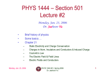 PHYS 1444 – Section 501 Lecture #2 Monday, Jan. 23, 2006 Dr. Jaehoon Yu • • • Brief history of physics Some basics … Chapter 21 – – – – – Monday, Jan. 23, 2006 Static Electricity and Charge Conservation Charges in Atom, Insulators and Conductors & Induced Charge Coulomb’s Law The Electric Field & Field Lines Electric Fields and Conductors PHYS 1444-501, Spring 2006 Dr. Jaehoon Yu 1 Announcements • Your five extra credit points for e-mail subscription is till midnight Wednesday, Jan. 25. Please take a full advantage of the opportunity. – Eleven of you have subscribed so far. Thank you!!! • Twenty of you have registered in the homework system. – I am TOTALLY impresssed!!! GOOOOOOOD Job!! – But many of you forgot to download and submit homework. Please do so to get a free full credit homework!! • Remember the quiz next Monday, Jan. 30, early in the class – Covers Appendix A and CH21 Monday, Jan. 23, 2006 PHYS 1444-501, Spring 2006 Dr. Jaehoon Yu 2 Brief History of Physics • AD 18th century: – Newton’s Classical Mechanics: A theory of mechanics based on observations and measurements • AD 19th Century: – Electricity, Magnetism, and Thermodynamics • Late AD 19th and early 20th century (Modern Physics Era) – Einstein’s theory of relativity: Generalized theory of space, time, and energy (mechanics) – Quantum Mechanics: Theory of atomic phenomena • Physics has come very far, very fast, and is still progressing, yet we’ve got a long way to go – – – – What is matter made of? How do matters get mass? How and why do matters interact with each other? How is universe created? Monday, Jan. 23, 2006 PHYS 1444-501, Spring 2006 Dr. Jaehoon Yu 3 Needs for Standards and Units • Three basic quantities for physical measurements – Length, Mass, and Time • Need a language that everyone can understand each other – Consistency is crucial for physical measurements – The same quantity measured by one must be comprehendible and reproducible by others – Practical matters contribute • A system of unit called SI (System International) established in 1960 – Length in meters (m) – Mass in kilo-grams (kg) – Time in seconds (s) Monday, Jan. 23, 2006 PHYS 1444-501, Spring 2006 Dr. Jaehoon Yu 4 SI Base Quantities and Units Quantity Length Time Mass Electric current Temperature Amount of substance Luminous Intensity Unit Meter Second Kilogram Ampere Kelvin Mole Candela Unit Abbrevation m s kg A k mol cd •There are prefixes that scales the units larger or smaller for convenience (see pg. 7) Monday, Jan. 23, 2006 PHYS 1444-501, Spring 2006 Dr. Jaehoon Yu 5 Prefixes, expressions and their meanings • • • • • • • • deca (da): 101 hecto (h): 102 kilo (k): 103 mega (M): 106 giga (G): 109 tera (T): 1012 peta (P): 1015 exa (E): 1018 Monday, Jan. 23, 2006 • • • • • • • • deci (d): 10-1 centi (c): 10-2 milli (m): 10-3 micro (m): 10-6 nano (n): 10-9 pico (p): 10-12 femto (f): 10-15 atto (a): 10-18 PHYS 1444-501, Spring 2006 Dr. Jaehoon Yu 6 How do we convert quantities from one unit to another? Unit 1 = Conversion factor X Unit 2 1 inch 1 inch 1 inch 1 ft 2.54 0.0254 2.54x10-5 30.3 cm m km cm 1 ft 1 ft 1 hr 0.303 3.03x10-4 60 M km minutes 1 hr And many 3600 More seconds Here…. Monday, Jan. 23, 2006 PHYS 1444-501, Spring 2006 Dr. Jaehoon Yu 7 Static Electricity; Electric Charge and Its Conservation • Electricity is from Greek word elecktron=amber, a petrified tree resin that attracts matter if rubbed • Static Electricity: an amber effect – An object becomes charged or “posses a net electric charge” due to rubbing – Can you give some examples? • Two types of electric charge – Like charges repel while unlike charges attract – Benjamin Franklin referred the charge on glass rod as the positive, arbitrarily. Thus the charge that attracts glass rod is negative. This convention is still used. Monday, Jan. 23, 2006 PHYS 1444-501, Spring 2006 Dr. Jaehoon Yu 8 Static Electricity; Electric Charge and Its Conservation • Franklin argued that when a certain amount of charge is produced on one body in a process, an equal amount of opposite type of charge is produced on another body. – The positive and negative are treated algebraically so that during any process the net change in the amount of produced charge is 0. • When you comb your hair with a plastic comb, the comb acquires a negative charge and the hair an equal amount of positive charge. • This is the law of conservation of electric charge. – The net amount of electric charge produced in any process is ZERO!! • If one object or one region of space acquires a positive charge, then an equal amount of negative charge will be found in neighboring areas or objects. • No violations have ever been observed. • This conservation law is as firmly established as that of energy or momentum. Monday, Jan. 23, 2006 PHYS 1444-501, Spring 2006 Dr. Jaehoon Yu 9 Electric Charge in the Atom • It has been understood through the past century that an atom consists of – A positively charged heavy core What is the name? • This core is nucleus and consists of neutrons and protons. – Many negatively charged light particles surround the core What is the name of these light particles? • These are called electrons • How many of these? As many as the number of protons!! • So what is the net electrical charge of an atom? – Zero!!! Electrically neutral!!! • Can you explain what happens when a comb is rubbed on a towel? – Electrons from towel get transferred to the comb, making the comb negatively charged while leaving positive ions on the towel. – These charges eventually get neutralized primarily by water molecules in the air. Monday, Jan. 23, 2006 PHYS 1444-501, Spring 2006 Dr. Jaehoon Yu 10 Insulators and Conductors • Let’s imagine two metal balls of which one is charged • What will happen if they are connected by – A metallic object? • Some 