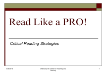 Read Like a PRO! Critical Reading Strategies 6/30/2016 Offered by the Center for Teaching and Learning 1 What is PRO? Prepare to read (pre-reading) Read Actively Organize to Learn 6/30/2016 Offered by the Center for Teaching and Learning 2 Part 1: Pre-reading Strategies Concentrate Preview Use Prior Knowledge Ask pre-reading questions and make predictions Choose a reading strategy 6/30/2016 Offered by the Center for Teaching and Learning 3 Concentrate When is the best time during the day for you to read and study? Where is the best place for you to read and study? 6/30/2016 Offered by the Center for Teaching and Learning 4 Preview Title Author information What does each word in the title mean? What does the phrase mean as a whole? Who is the author ? When did s/he write the piece? Headings, Notes, Pictures, or Side Panels 6/30/2016 Offered by the Center for Teaching and Learning 5 Use Prior Knowledge How do you relate to the piece you’ve previewed? Are there any similarities between you and the author or any of the characters? Have you read or heard any of the information elsewhere before? 6/30/2016 Offered by the Center for Teaching and Learning 6 Ask Questions/Predict What do you want to learn? What can you predict the author will discuss? 6/30/2016 Offered by the Center for Teaching and Learning 7 Choose a Reading Strategy What is the purpose in reading this text? What is the level of difficulty? How will I actively read the text? 6/30/2016 Offered by the Center for Teaching and Learning 8 Part 2: Reading Actively Reading Actively means… annotating and making connections between the material and what you already know or have experienced 6/30/2016 Offered by the Center for Teaching and Learning 9 Becoming an Active Reader Devote time to fully focus on comprehending the text Apply strategies that will swiftly engage you with a text and keep your concentration 6/30/2016 Offered by the Center for Teaching and Learning 10 Preparing to Become an Active Reader Be aware of the environmental factors that enhance and hurt concentration Be realistic about how long reading certain texts will take and set aside time for that reading Plan to keep a Reading Log for every class with required reading 6/30/2016 Offered by the Center for Teaching and Learning 11 Strategies for Reading Actively Keep a Reading Log Orient yourself to the text Create a Discussion Web 6/30/2016 Offered by the Center for Teaching and Learning 12 What Are You Looking For? Note the subject matter and author’s purpose Recognize the organization of the text, structure and genre Determine the context of the text Find the connections to the course Decide your purpose and goal 6/30/2016 Offered by the Center for Teaching and Learning 13 Remaining Active Interact with the author as you read Try to figure out the author’s stance Monitor your comprehension and act when your concentration flags 6/30/2016 Offered by the Center for Teaching and Learning 14 Dealing with Demanding Texts Identify the major problem and resolution Research the subject matter Look up unknown words Ask your instructor, peers, family, and friends for help 6/30/2016 Offered by the Center for Teaching and Learning 15 Part 3: Organizing to Learn Apply Post-Reading tips Create a Semantic Map Form a Discussion Group Mark Your Text Outline Chart 6/30/2016 Offered by the Center for Teaching and Learning 16 Apply Post-Reading Tips Decide if you achieved your goals for reading Discuss the accuracy of your predictions Summarize major ideas Research additional information Distinguish between relevant and irrelevant ideas Paraphrase relevant details Reflect and personalize the text 6/30/2016 Offered by the Center for Teaching and Learning 17 Create a Semantic Map (SM) Helps the reader to identify important ideas Shows how the ideas fit together Uses comprehension/concentration skills and evolves in a note taking form Represents visually the content of your reading 6/30/2016 Offered by the Center for Teaching and Learning 18 Three Components of SM Core question or concept Strands Supports 6/30/2016 Offered by the Center for Teaching and Learning 19 SM - Spider Map Example 6/30/2016 Offered by the Center for Teaching and Learning 20 SM – Fishbone Map Example 6/30/2016 Offered by the Center for Teaching and Learning 21 Form a Discussion Group Brings out new ideas you’d previously not considered Takes existing ideas or concepts about the reading and expands upon them Allows your interpretations to be challenged and will fill in some of your “blind spots” regarding what you just read 6/30/2016 Offered by the Center for Teaching and Learning 22 Mark Your Text Read first and then mark selectively Box transitions and number important ideas Circle specialized vocabulary Jot down main ideas in the margin Write questions as you read Make brief summaries at the end of each section 6/30/2016 Offered by the Center for Teaching and Learning 23 Outline What You Read Place major/general points to the left Indent each more specific point to the right 6/30/2016 Offered by the Center for Teaching and Learning 24 Chart What You Read Organize categories into columns Record information into the appropriate category 6/30/2016 Tracks conversations and dialogues Reduces amount of writing Provides easy review Offered by the Center for Teaching and Learning 25 Practice THEME FOR ENGLISH B - By Langston Hughes The instructor said, Go home and write a page tonight. And let that page come out of you--Then, it will be true. I wonder if it's that simple? I am twenty-two, colored, born in Winston-Salem. 6/30/2016 Offered by the Center for Teaching and Learning 26 Cont… I went to school there, then Durham, then here to this college on the hill above Harlem. I am the only colored student in my class. The steps from the hill lead down into Harlem through a park, then I cross St. Nicholas, Eighth Avenue, Seventh, and I come to the Y, the Harlem Branch Y, where I take the elevator up to my room,
