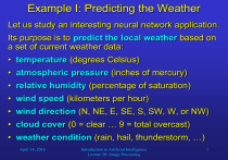 Example I: Predicting the Weather Let us study an interesting neural network application. Its purpose is to predict the local weather based on a set of current weather data: • temperature (degrees Celsius) • atmospheric pressure (inches of mercury) • relative humidity (percentage of saturation) • wind speed (kilometers per hour) • wind direction (N, NE, E, SE, S, SW, W, or NW) • cloud cover (0 = clear … 9 = total overcast) • weather condition (rain, hail, thunderstorm, …) April 14, 2016 Introduction to Artificial Intelligence Lecture 20: Image Processing 1 Example I: Predicting the Weather We assume that we have access to the same data from several surrounding weather stations. There are eight such stations that surround our position in the following way: 100 km April 14, 2016 Introduction to Artificial Intelligence Lecture 20: Image Processing 2 Example I: Predicting the Weather How should we format the input patterns? We need to represent the current weather conditions by an input vector whose elements range in magnitude between zero and one. When we inspect the raw data, we find that there are two types of data that we have to account for: • Scaled, continuously variable values • n-ary representations of category values April 14, 2016 Introduction to Artificial Intelligence Lecture 20: Image Processing 3 Example I: Predicting the Weather The following data can be scaled: • temperature (-10… 40 degrees Celsius) • atmospheric pressure (26… 34 inches of mercury) • relative humidity (0… 100 percent) • wind speed (0… 250 km/h) • cloud cover (0… 9) We can just scale each of these values so that its lower limit is mapped to some and its upper value is mapped to (1 - ). These numbers will be the components of the input vector. April 14, 2016 Introduction to Artificial Intelligence Lecture 20: Image Processing 4 Example I: Predicting the Weather Usually, wind speeds vary between 0 and 40 km/h. By scaling wind speed between 0 and 250 km/h, we can account for all possible wind speeds, but usually only make use of a small fraction of the scale. Therefore, only the most extreme wind speeds will exert a substantial effect on the weather prediction. Consequently, we will use two scaled input values: • wind speed ranging from 0 to 40 km/h • wind speed ranging from 40 to 250 km/h April 14, 2016 Introduction to Artificial Intelligence Lecture 20: Image Processing 5 Example I: Predicting the Weather How about the non-scalable weather data? • Wind direction is represented by an eightcomponent vector, where only one element (or possibly two adjacent ones) is active, indicating one out of eight wind directions. • The subjective weather condition is represented by a nine-component vector with at least one, and possibly more, active elements. With this scheme, we can encode the current conditions at a given weather station with 23 vector components: • one for each of the four scaled parameters • two for wind speed • eight for wind direction • nine for the subjective weather condition April 14, 2016 Introduction to Artificial Intelligence Lecture 20: Image Processing 6 Example I: Predicting the Weather Since the input does not only include our station, but also the eight surrounding ones, the input layer of the network looks like this: … our station … … north … northwest The network has 207 input neurons, which accept 207-component input vectors. April 14, 2016 Introduction to Artificial Intelligence Lecture 20: Image Processing 7 Example I: Predicting the Weather What should the output patterns look like? We want the network to produce a set of indicators that we can interpret as a prediction of the weather in 24 hours from now. In analogy to the weather forecast on the evening news, we decide to demand the following four indicators: • a temperature prediction • a prediction of the chance of precipitation occurring • an indication of the expected cloud cover • a storm indicator (extreme conditions warning) April 14, 2016 Introduction to Artificial Intelligence Lecture 20: Image Processing 8 Example I: Predicting the Weather Each of these four indicators can be represented by one scaled output value: • temperature (-10… 40 degrees Celsius) • chance of precipitation (0%… 100%) • cloud cover (0… 9) • storm warning: two possibilities: – 0: no storm warning; 1: storm warning – probability of serious storm (0%… 100%) Of course, the actual network outputs range from to (1 - ), and after their computation, if necessary, they are scaled to match the ranges specified above. April 14, 2016 Introduction to Artificial Intelligence Lecture 20: Image Processing 9 Example I: Predicting the Weather We decide (or experimentally determine) to use a hidden layer with 42 sigmoidal neurons. In summary, our network has • 207 input neurons • 42 hidden neurons • 4 output neurons Because of the small output vectors, 42 hidden units may suffice for this application. April 14, 2016 Introduction to Artificial Intelligence Lecture 20: Image Processing 10 Example I: Predicting the Weather The next thing we need to do is collecting the training exemplars. First we have to specify what our network is supposed to do: In production mode, the network is fed with the current weather conditions, and its output will be interpreted as the weather forecast for tomorrow. Therefore, in training mode, we have to present the network with exemplars that associate known past weather conditions at a time t with the conditions at t – 24 hrs. So we have to collect a set of historical exemplars with known correct output for every input. April 14, 2016 Introduction to Artificial Intelligence Lecture 20: Image Processing 11 Example I: Predicting the Weather Obviously, if such data is unavailable, we have to start collecting them. The selection of exemplars that we need depends, among other factors, on the amount of changes in weather at our location. For examp