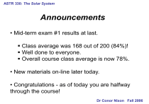 ASTR 330: The Solar System Announcements • Mid-term exam #1 results at last. Class average was 168 out of 200 (84%)! Well done to everyone. Overall course class average is now 78%. • New materials on-line later today. • Congratulations - as of today you are halfway through the course! Dr Conor Nixon Fall 2006 ASTR 330: The Solar System Lecture 15: Venus Picture: from The Nine Planets, Bill Arnett Dr Conor Nixon Fall 2006 ASTR 330: The Solar System Twin Planets? • Venus and Earth are very nearly the same size and density. Diameter (km) Venus Earth 12,104 12,756 • Venus’s shorter orbital period is in line with its smaller orbit about the Sun. Density (g/cm 3 ) 5.5 5.3 Semi-major axis (AU) 0.72 1.00 • However, Venus’s rotation period on its axis is 243 Earth days: longer than its year of 225 Earth days! Orbital Period (days) 224.70 365.26 Rotation Period (days) 243r 1 Albedo 0.75 0.3 • Also, Venus rotates in a retrograde direction, opposite to its orbital motion. • We will encounter many other differences: temperature, volcanism, atmospheric composition. Dr Conor Nixon Fall 2006 ASTR 330: The Solar System Albedo and Atmosphere • Venus is perpetually shrouded in a thick blanket of white clouds, obscuring the surface, and confounding early efforts to determine its rate of rotation. • The clouds reflect 75% of incident solar radiation, much more than the Earth’s 30% or the Moon’s 11% albedo. • The temperature of the cloud tops was measured in the 1930s to be 230 K, similar to the stratosphere of the Earth. • These were assumed to be water clouds, like the Earth. • Carbon dioxide was the only gas detected until the 1960s, and it seemed plausible that a lot of nitrogen was also present but undetected. Dr Conor Nixon Fall 2006 ASTR 330: The Solar System Taking The Temperature • Venus is closer to the Sun, but its clouds also reflect more than twice as much radiation as those of the Earth. Heat-balance calculations indicated that Venus should be at about 280 K. • However, radio astronomers in 1958 found that Venus was radiating radio waves as strongly as a much hotter body: 600 K ! Many astronomers thought there must be some other explanation, until… • In 1962 Mariner 2 flew by Venus and confirmed that the radiation really did come from the surface. (Mariner 1 failed shortly after launch). Figure credit: NASA/OSS Dr Conor Nixon Fall 2006 ASTR 330: The Solar System Surprising Radar Data • At about the same time as the Mariner 2 mission, radar astronomers had succeeded in bouncing waves off the surface to measure the rotation rate: which was found to an extremely slow backward motion. • Venus takes 243 days to rotate (‘backwards’) on its axis, but only 225 days to orbit the Sun. This results in a solar day (sunrise to sunrise) of 117 days, but note the Sun rises in the west and sets in the east! • The radar data also showed how extended the atmosphere was: with a surface pressure at least 50 times that of the Earth. Dr Conor Nixon Fall 2006 ASTR 330: The Solar System Touchdown on the surface • A series of Soviet robot probes were sent to Venus with the intention of landing on the surface, to settle once and for all what the conditions were like. • Venera 4 (1967) was the first to enter the atmosphere, but was either crushed or melted 23 km above the surface, at T=500 K and p=20 bars. • Venera 7 (1970, right) was the first spacecraft to successfully return data from the surface another planet. • As was by then expected, the surface temperature was found to be 750 K, and the pressure 90 bars, the same as under 900 meters of ocean! Figure credit: USSR, from NASA NSSDC Dr Conor Nixon Fall 2006 ASTR 330: The Solar System Why is Venus so hot? • We now know that Venus is the hottest planet in the solar system, despite being further from the Sun than Mercury. Any ideas why? • The answer is the greenhouse effect, which we just discussed in the context of the Earth. However, clearly the size of the effect is much larger for Venus. • Although the cloud tops of Venus are around 230 K, the temperature increases rapidly toward the surface. Remember that the troposphere (lower atmosphere) has a temperature gradient maintained by convection. • The cause of the greenhouse effect, worked out by Carl Sagan and James Pollack, was the massive atmosphere, which is mainly CO2, a very effective greenhouse gas. Dr Conor Nixon Fall 2006 ASTR 330: The Solar System Venus Greenhouse Effect • Scientists at first could not believe that any sunlight could reach the ground through Venus’s massive atmosphere. • In fact, the greenhouse gases are transparent in the visible, and even the clouds only reflect 75% of sunlight, so plenty still reaches the surface. • The huge blanketing effect causes Venus’s surface temperatures to be almost constant across the planet. Figure credit: Greg Holmes, Embry-Riddle Univ. Dr Conor Nixon Fall 2006 ASTR 330: The Solar System Greenhouse warming on various planets • Different planets have differing amounts of natural greenhouse warming: Venus is the most extreme example, followed by the Earth. • Mercury has no atmosphere, and hence no greenhouse effect. • For the outer planets, we will see that there is a different reason why the temperature may be higher than expected. • Figure credit: Univ. Michigan, Global Change Could the Earth become like Venus if humanity releases enough CO2? Dr Conor Nixon Fall 2006 ASTR 330: The Solar System Atmospheric Composition • Apart from CO2, the next most abundant gas is N2. • All other gases are trace constituents (<1%). ‘ppm’ means ‘parts per million’ in the atmosphere. • Scientists were surprised at first not to find more N2 and O2, but especially the low amounts of H2O were perplexing. The answer concerns differential escape of hydrogen- see Chap. 12). Table after Morrison and Owen Gas Formula Abundance Main Constituents Carbon Dioxide CO2 Nitrogen N2 Trace Constitue