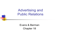 Advertising and Public Relations Evans & Berman Chapter 18 Chapter Objectives To examine the scope, importance, and characteristics of advertising To study the elements in an advertising plan To examine the scope, importance, and characteristics of public relations To study the elements in a public relations plan Copyright Atomic Dog Publishing, 2002 Types of Promotion Public Relations Advertising Promotion Mix Sales Promotion Personal Selling Copyright Atomic Dog Publishing, 2002 Advertising Advertising is paid, nonpersonal communication regarding goods, services, organizations, people, places, and ideas that is transmitted through various media by business firms, government and other nonprofit organizations, and individuals who are identified in the advertising message as the sponsor. The message is generally controlled by the sponsor. Copyright Atomic Dog Publishing, 2002 Public Relations Public relations includes any communication to foster a favorable image for goods, services, organizations, people, places, and ideas among their publics—such as consumers, investors, government, channel members, employees, and the general public. It may be nonpersonal, personal, paid or nonpaid, and sponsor controlled or not controlled. Publicity is the form of public relations that entails nonpersonal communication passed on via various media but not paid for an identified sponsor. Wording and placement of publicity messages are generally media controlled. Copyright Atomic Dog Publishing, 2002 Developing an Advertising Plan 2. Assigning Responsibility 3. Establishing Budget 1. Setting Objectives 9. Evaluating Success or Failure Feedback 4. Developing Themes 5. Selecting Media 8. Considering Cooperative Efforts 7. Timing Advertisements 6. Creating Advertisements Copyright Atomic Dog Publishing, 2002 Advertising Plan: Setting Objectives 1. Setting Objectives An organization’s advertising goals can be divided into demand or image types, with imageoriented ads being part of public relations. Demand-Oriented Ads Image-Oriented Ads • Inform • Develop image • Persuade • Maintain image • Remind • Generate primary demand • Generate selective demand Copyright Atomic Dog Publishing, 2002 Advertising Plan: Assigning Responsibility 2. Assigning Responsibility 1. Setting Objectives In assigning responsibility, a firm can rely on internal personnel doing marketing functions, use an inhouse ad department, or hire an outside ad agency. Benefits of Ad Agency Benefits of In-House Ad Dept. • Full knowledge of product/firm • Complete confidentiality • Control of costs and budgets • Provides ad-related services • Market and consumer research • Product planning • Public relations Copyright Atomic Dog Publishing, 2002 Advertising Plan: Budgeting 1. Setting Objectives 2. Assigning Responsibility 3. Establishing Budget Budget types The firm establishes a budget after considering various requirements such as types of ads, medium, frequency, and campaign goals. • All-you-can-afford • Incremental • Competitive parity • Percentage-of-sales • Objective-and-task Copyright Atomic Dog Publishing, 2002 Advertising Plan: Developing Themes 2. Assigning Responsibility 1. Setting Objectives 3. Establishing Budget 4. Developing Themes The advertising theme is the overall appeal of the ad campaign. A good or service appeal centers on the item and its attributes; a consumer appeal describes a product’s benefits rather than features; and institutional ads project an image. Copyright Atomic Dog Publishing, 2002 Advertising Plan: Selecting Media 1. Setting Objectives 2. Assigning Responsibility 3. Establishing Budget Media selections include • Newspapers 4. Developing Themes 5. Selecting Media • TV/Radio • Direct Mail • Magazines • Internet • Outdoor Copyright Atomic Dog Publishing, 2002 Advertising Plan: Creating Ads 1. Setting Objectives 2. Assigning Responsibility 3. Establishing Budget Key Decisions 4. Developing Themes 5. Selecting Media • Determine message, content, and devise ads • Outline promotion schedule • Specify medium for ads 6. Creating Advertisements • Determine message type and frequency Copyright Atomic Dog Publishing, 2002 Advertising Plan: Timing 1. Setting Objectives 2. Assigning Responsibility 3. Establishing Budget Timing includes how often and when ads run. 7. Timing Advertisements 4. Developing Themes 5. Selecting Media 6. Creating Advertisements Copyright Atomic Dog Publishing, 2002 Advertising Plan: Cooperative Efforts 1. Setting Objectives 2. Assigning Responsibility 3. Establishing Budget Cooperative ads can provide prestige and shared costs, and increase revenues. 8. Considering Cooperative Efforts 7. Timing Advertisements 4. Developing Themes 5. Selecting Media 6. Creating Advertisements Copyright Atomic Dog Publishing, 2002 Advertising Plan: Evaluation 1. Setting Objectives 9. Evaluating Success or Failure Feedback 2. Assigning Responsibility 3. Establishing Budget 4. Developing Themes Evaluating success or failure includes measuring the goals achieved. Carefully established campaign goals are more easily evaluated and assessed. 8. Considering Cooperative Efforts 7. Timing Advertisements 5. Selecting Media 6. Creating Advertisements Copyright Atomic Dog Publishing, 2002 Types of Media Newspapers TV/Radio Direct Mail Magazines Outdoor Internet Media advantages and disadvantages must be weighed carefully—and consider the goals of the campaign, the item advertised, the audience sought, and the cost per viewer. What are the long-term goals? Copyright Atomic Dog Publishing, 2002 Media Considerations (1) Selecting media is just one part of reaching long-term campaign goals. Considerations include costs, reach, waste, message permanence, persuasive impact, narrowcasting, frequency, clutter, lead time, and media innovations. Advertising media costs are outlays for media time or space and are related to ad length or size, and media attributes. Reach refer