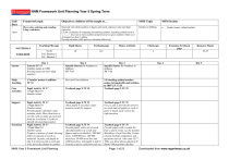 NHM Framework Unit Planning Year 5 Spring Term Unit/ Days Framework topic Objectives: children will be taught to… NHM Topic NHM Section 1 Place value, ordering and rounding Using a calculator Read and write whole numbers in figures and words, and know what each digit represents. Use the vocabulary of comparing and ordering numbers, including symbols such as <, >, , , =. Give one or more numbers lying between two given numbers. Order a set of integers less than 1 million. Develop calculator skills and use a calculator effectively. Numbers to Millions 3 days Teaching File page Pupil Sheets Textbook page 55-59 N.G. Shortcut 1 N.L. Shortcut 1 10 8-9 Home Activities Check-ups MATERIALS TOOLBOX Day 2 Specific Starter for Numbers to millions TF 7-11 Day 3 Specific Starter for Numbers to millions TF 7-11 Main Teaching 1 Number names to millions TF 56 Revision/Consolidation Core Activities Pupil Activity TF 57 1 Pupil Sheet 10 Number names Textbook page 8 TF 59 2 Extending ordinal number names to hundredth and notation to 100th TF 57-58 Textbook page 9 TF 59 Support Pupil Activity TF 57 1 Pupil Sheet 10 Number names Provide pupils with place value notation cards. Show them how to use the cards to make up each sum from the word form. Use this to identify the matching number. Pupil Activity TF 57 1 Pupil Sheet 10 Number names Prepare a mixture of cards showing either an amount in words or numerals. In pairs, ask pupils to take it in turns to pick a card and write down the amount in another Textbook page 8 TF 59 Allow pupils to use place value notation cards for support. Textbook page 9 TF 59 For q 2 and 3, provide the answers on cards and ask pupils to work in pairs to match each card to the right question. Textbook page 8 TF 59 Provide pupils with a set of cards showing numbers in words and figures and a set labelled 1 000 000 more, 1 000 000 less, 100 000 more/less, 10 000 more/less and 1000 more/less. Ask pupils to take it in turns to pick a card from each set Textbook page 9 TF 59 Provide pupils with a results list from a sports event, e.g. the London Marathon, a local Fun Run, County schools football competition. Ask questions such as ‘who came 53rd?’, ‘Who was three places ahead of D. Smith? What position did they Extension NHM Year 5 Framework Unit Planning Extension Textbook page Resource Sheets 3 Day 1 Tune-in TF 55 Number names to 1000 Revising names for four-digit numbers Starter Number names, ordinal numbers Page 1 of 21 55-57 Day 4 Downloaded from www.myprimary.co.uk Day 5 NHM Framework Unit Planning Year 5 Spring Term form, i.e. words if it appears in numerals and vice versa. Plenary Discuss children’s work. and record the original number and the resulting number after the operation has been applied. Follow-up for Textbook page 8 TF 59 come?’ Follow-up for Textbook page 9 TF 59 Check-up 3 Additional notes Extra Resources Review NHM Year 5 Framework Unit Planning Page 2 of 21 Downloaded from www.myprimary.co.uk NHM Framework Unit Planning Year 5 Spring Term Unit/ Days Framework topic 2 5 days Understanding x and Mental calculation strategies (x and ) Objectives: children will be taught to… NHM Topic NHM Section Understand the effect of and relationships between the four operations, and the principles (not the names) of the arithmetic laws as they apply to multiplication. Begin to use brackets. Derive quickly or continue to derive quickly: division facts corresponding to tables up to 10 × 10; doubles of all whole numbers 1 to 100 (e.g. 78 × 2); doubles of multiples of 10 to 1000 (e.g. 670 × 2); doubles of multiples of 100 to 10000 (e.g. 6500 × 2); and the corresponding halves. Use doubling or halving, starting from known facts. For example: double/halve any two-digit number by doubling/halving the tens first; double one number and halve the other; to multiply by 25, multiply by 100 then divide by 4; find the ×16 table facts by doubling the ×8 table; find sixths by halving thirds. Use the relationship between multiplication and division. Use known facts and place value to multiply and divide mentally. Choose and use appropriate number operations to solve problems, and appropriate ways of calculating: mental, mental with jottings, written methods, calculator. Explain methods and reasoning, orally and in writing. Develop calculator skills and use a calculator effectively. Check with the inverse operation when using a calculator. Check with an equivalent calculation. Multiplication Using doubles Division Halving; linking multiplication and division Teaching File page Pupil Sheets Textbook page 20-21 42-43 Home Activities Check-ups MATERIALS TOOLBOX 144-149 M.F. Shortcut 1 Starter Day 1 Tune-in TF 144-145 Revising doubles Day 2 Specific Starter for Multiplication TF 19-22 Day 3 Specific Starter for Multiplication TF 19-22 Main Teaching 1 Doubling a number ending in 5 TF 145 2 Halving an even number TF 146 Revision/Consolidation Core Activities Pupil Activity TF 145 1 Pupil Sheet 20 By doubling and halving Pupil Activity TF 146 2 Pupil Sheet 21 By halving an even number, then doubling Support Pupil Activity TF 145 1 Pupil Sheet 20 By doubling and halving Work with the pupils as a group and discuss how each question will Pupil Activity TF 146 2 Pupil Sheet 21 By halving an even number, then doubling Work with the pupils as a group NHM Year 5 Framework Unit Planning Extension Textbook page Resource Sheets Day 4 Specific Starter for Multiplication Day 5 Specific Starter for Multiplication TF 19-22 TF 19-22 3 Multiplying by 16 TF 147 4 Multiplying by 50, 25 TF 147-148 Textbook page 42 TF 146 Ask pupils to make a bingo card with stations in the 16 times table on it. Provide a suitable caller card asking questions such as ‘3 x 16’. Textbook page 43 TF 148 Textbook page 42 TF 146 Before pupils attempt the questions independently, go through them as a group and discuss and record the strategies they could use to gain an Provide pupils with bingo cards showing the first 6 stati