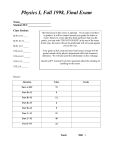 Physics I, Fall 1998, Final Exam Name________________________ Student ID # __________________ Class Section: M/W 8-10 ____ M/W 10-12 _____ M/W 12-2 _____ T/Th 8-10 _______ T/Th 10-12 ______ T/Th 12-2 ______ The final exam in this course is optional. If you take it and have us grade it, it will be counted toward your grade for better or worse. However, if you take this final and know that you did poorly, you can write "DO NOT GRADE" at the top of the exam. In this case, the exam will not be graded and will not count against you in any way. Your grade on this exam and your final course average will be posted outside of the physics department office late tomorrow afternoon. We will also post this information on the web page. Good Luck!!! And ask if you have questions about the meaning of anything on this exam. T/Th 2-4______ Receive Question Value Part A-MC 72 Part B- #1 9 Part B- #2 12 Part B- #3 6 Part B- #4 9 Part C- #1 21 Part C- #2 49 Part C-#3 22 Grade Total /200 = Part A- 4 points each -Total of 72 points ______ 1. A charged particle moves to the right in a uniform magnetic field which points toward the bottom of the page. B v The particle is deflected out of the page. What set of conditions could account for this? a) The particle is an electron b) The particle is a proton c) The particle is an electron and there is also an electric field in the region d) The particle is a proton and there is also an eletric field in the region e) None of the above ______ 2. A man and a woman are standing still in a room. Which of the following pairs of forces are "reaction" forces in the sense of Newton’s third law? a) The normal force of the floor on the man and the normal force of the floor on the woman. b) The gravitational force exerted by the man on the woman and the gravitational force exerted by the woman on the man. c) The gravitational force exerted by the earth on the man and the normal force exerted by the floor on the man. d) None of the above ______3. The mass of a hypothetical planet is 100 times that of the earth, but its radius is equal to that of the earth. The weight of an object on the surface of this planet is : a) The same as the object’s weight on the surface of the earth b) Larger than the object’s weight on the surface of earth by a factor of 100 c) Smaller than the object’s weight on the surface of the earth by a factor of 100 d) None of the above _____4. Which of the following statements is correct? a) Magnetic field lines cross at points where the magnetic field is zero. b) Magnetic field lines are larger where the magnetic field is stronger. c) Magnetic field lines go from the south pole of a magnet to the north pole of a magnet. d) All of the above statements are incorrect. ________5. A rifle of mass M is initially at rest but free to recoil. It fires a bullet of mass m and velocity V (relative to the ground). After firing, the velocity of the rifle (relative to the ground) is: A) mV/M B) -V C) -mV D) -MV/m E) -mV/M _________6. The three thin hoops shown below all have the same outer radius, and are each free to rotate about a fixed axis through its center. Assume the hoops are connected to the rotation axis by light spokes. The first hoop has mass M, the second hoop has mass 2M and the third hoop has mass 3M. With the objects staring form rest, identical forces are simultaneously applied to the rims, as sown. Rank the objects according to their angular velocities after a given time t, least to greatest. M F Hoop A 3M 2M F Hoop B F Hoop C A) A,B,C B) B,A, C C) B, C,A D) C,A,B E) C,B,A _____7. A student's life was saved in an automobile accident because an airbag expanded in front of his head. If the car had not be equipped with an airbag, the windshield would have stopped the motion of his head in a much shorter time. Compared to the windshield, the airbag: A) does more work B) causes a much smaller change in kinetic energy C) exerts a much smaller force D) exerts a much smaller impulse E) causes a much smaller change in momentum ______8. A man sits in the back of a canoe which is moving forward through still water (no friction or other external forces) at 3 m/s. He walks at 0.5 m/s to the front of the canoe. While he walks, the speed of the canoe: A) is increased B) is decreased C) stays the same ___ 9. An object is shot from the back of a truck moving at a constant velocity of 30 mph on a straight horizontal road. The gun is aimed upward, perpendicular to the bed of the truck. Air resistance can be ignored. The object falls: A. in front of the truck D. depends on the initial speed of the object B. behind the truck E. depends on the value of g C. on the truck ___ 10. A car accelerates from rest on a straight road. A short time later, the car decelerates to a stop, and then returns to its original position in a similar manner. Which of the following five graphs best describes the motion? ___ 11. A child pulls a wooden box along a rough horizontal floor at constant speed by means of a force P as shown. Which of the following must be true: A. P = f and N = W; D. P > f and N < W; B. P = f and N > W; E. none of these C. P > f and N = W; ___ 12. If a satellite moves above the earth's atmosphere in a circular orbit at constant speed, then: A. its acceleration and velocity are in the same direction B. the net force on the satellite is zero C. its velocity is constant D. it will fall back to earth when its fuel is used up E. its acceleration is toward the earth ___ 13. Which one of the following five graphs represents the motion of an object whose speed is increasing? ___ 14. An object is thrown vertically upward into the air. Which of the following five graphs represents the velocity (v) of the object as a function of the time (t)? Neglect air resistance. ___ 15. A bullet shot horizontally from a gun: A. is brought to rest by air resistance alone B. travels in a straight line C. strikes the ground much later than one dropped vertically from the same point at the same in