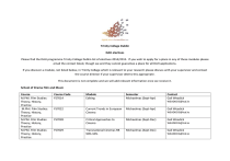 Trinity College Dublin DAH electives Please find the DAH programme Trinity College Dublin list of electives 2014/2015. If you wish to apply for a place in any of these modules please email the contact listed, though we and they cannot guarantee a place for all DAH applications. If you discover a module, not listed below, in Trinity College which is relevant to your research please discuss with your supervisor and contact the course director if your supervisor deems this appropriate. This document is not complete and we will add relevant information once we receive it. School of Drama Film and Music Course M.Phil. Film Studies: Theory, History, Practice M.Phil. Film Studies: Theory, History, Practice M.Phil. Film Studies: Theory, History, Practice M.Phil. Film Studies: Theory, History, Practice Course Code FS7014 Module Editing Semester Michaelmas (Sept-Apr) Contact Gail Weadick WEADICKG@tcd.ie FS7022 FS7028 FS7029 Current Trends in European Cinema Michaelmas (Sept-Apr) Critical Approaches to Cinema Michaelmas (Sept-Dec) Transnational Cinemas RB 90% 10% Michaelmas (Sept-Dec) Gail Weadick WEADICKG@tcd.ie Gail Weadick WEADICKG@tcd.ie Gail Weadick WEADICKG@tcd.ie M.Phil. Film Studies: Theory, History, Practice M.Phil. Film Studies: Theory, History, Practice M.Phil. Film Studies: Theory, History, Practice M.Phil. Film Studies: Theory, History, Practice FS7015 Creative Documentary Hilary (Jan-Apr) Gail Weadick WEADICKG@tcd.ie FS7020 Screenwriting Hilary (Jan-Apr) Gail Weadick WEADICKG@tcd.ie FS7024 Film Melodrama Hilary (Jan-Apr) Gail Weadick WEADICKG@tcd.ie FS7026 Cinema and Ireland Hilary (Jan-Apr) Gail Weadick WEADICKG@tcd.ie School of English Course M.Phil Popular Literature MPhil in Digital Humanities and Culture MPhil in Digital Humanities and Culture MPhil in Digital Humanities and Culture Course Code TRT22 Module Cybercultures/Popular Culture Web Technologies Semester Michaelmas(Sept-Dec) TRU78 From Metadata to Linked Data Hilary (Jan-April) Owen Conlan Owen.Conlan@cs.tcd.ie TRU78 Digital Scholarly Editing Hilary (Jan-April) Susan Schreibman susan.schreibman@gmail.com TRU78 Michaelmas(Sept-Dec) Contact Dr. Bernice Murphy murphb12@tcd.ie Owen Conlan Owen.Conlan@cs.tcd.ie Department of Electronic and Electrical Engineering Course Course Code Module ECTS Semester Contact M.Phil in Music & Media Technologies M.Phil in Music & Media Technologies M.Phil in Music & Media Technologies M.Phil in Music & Media Technologies M.Phil in Music & Media Technologies M.Phil in Music & Media Technologies M.Phil in Music & Media Technologies M.Phil in Music & Media Technologies M.Phil in Music & Media Technologies M.Phil in Music & Media Technologies M.Phil in Music TBC-all Psychoacoustics 1 5 Michaelmas (SeptDec) Dermot Furlong dfurlong@tcd.ie Programming & DSP 1 5 Michaelmas (SeptDec) Dermot Furlong dfurlong@tcd.ie Digital Audio Technologies 5 Michaelmas (SeptDec) Dermot Furlong dfurlong@tcd.ie Sound Design & Synthesis 5 Michaelmas (SeptDec) Dermot Furlong dfurlong@tcd.ie Media Technologies 5 Michaelmas (SeptDec) Dermot Furlong dfurlong@tcd.ie Sound Engineering 5 Michaelmas (SeptDec) Dermot Furlong dfurlong@tcd.ie Visual Music 5 Michaelmas (SeptDec) Dermot Furlong dfurlong@tcd.ie Music Theory & Aural Training 1 5 Michaelmas (SeptDec) Dermot Furlong dfurlong@tcd.ie Electronic Music Composition 1 5 Michaelmas (SeptDec) Dermot Furlong dfurlong@tcd.ie Contemporary Composition 1 5 Michaelmas (SeptDec) Dermot Furlong dfurlong@tcd.ie Psychoacoustics 2 5 Hilary (Jan – Apr) Dermot Furlong dfurlong@tcd.ie & Media Technologies M.Phil in Music & Media Technologies M.Phil in Music & Media Technologies M.Phil in Music & Media Technologies M.Phil in Music & Media Technologies M.Phil in Music & Media Technologies M.Phil in Music & Media Technologies M.Phil in Music & Media Technologies M.Phil in Music & Media Technologies M.Phil in Music & Media Technologies M.Phil in Music & Media Research Methods & Entrepreneurial Skills 5 Hilary (Jan – Apr) Dermot Furlong dfurlong@tcd.ie Music Theory & Aural Training 2 5 Hilary (Jan – Apr) Dermot Furlong dfurlong@tcd.ie Sound Design & Synthesis 2 5 Hilary (Jan – Apr) Dermot Furlong dfurlong@tcd.ie Electronic Music Composition 2 5 Hilary (Jan – Apr) Dermot Furlong dfurlong@tcd.ie Contemporary Composition 2 5 Hilary (Jan – Apr) Dermot Furlong dfurlong@tcd.ie Instrumentation 5 Hilary (Jan – Apr) Dermot Furlong dfurlong@tcd.ie Spatial Audio 5 Hilary (Jan – Apr) Dermot Furlong dfurlong@tcd.ie Programming & DSP 2 5 Hilary (Jan – Apr) Dermot Furlong dfurlong@tcd.ie Interactive Design & MAX MSP 5 Hilary (Jan – Apr) Dermot Furlong dfurlong@tcd.ie Web Authoring 5 Hilary (Jan – Apr) Dermot Furlong dfurlong@tcd.ie Technologies M.Phil in Music & Media Technologies M.Phil in Music & Media Technologies Sound Engineering 2 5 Hilary (Jan – Apr) Dermot Furlong dfurlong@tcd.ie Visual Music 2 5 Hilary (Jan – Apr) Dermot Furlong dfurlong@tcd.ie School of Histories and Humanities To enroll, please contact the Director of Postgraduate Teaching and Learning, Dr Martine Cuypers, cuypersm@tcd.ie Course Course Code Module Classics ECTS Semester Contact 10 MT Tue 12-1, 3071; Wed 9-10, 4053; Thu 3-4, B6002; Fri 12-1, B6002 HT Wed 12-1, 4053; Fri 2-3, 4053 HT Tue 1-2, 5052; Fri 12-1, 3081 MHT Mon 11-12, 5040; Tue 5-6, 5040; Thu 1-2, 3069; Fri 12, 4012 MHT Tue 6-8, B6002 MT 12-2, B6002 Prof. Anna Chahoud, Dr Adam Marshall HH7002 Elementary Latin Classics HH7003 Reading Classical Latin 5 Classics HH7004 Reading Late Latin 5 Classics Classics 20 CL7027 Elementary Greek CL7050 Modern Greek CL7021 Curiosity and Crisis in the Late Fifth Century: Receptions of the Sophists Classics 10 10 Prof. Anna Chahoud, Dr Adam Marshall Prof. Anna Chahoud, Dr Adam Marshall Dr Ashley Clements, Dr Bridget Martin Dr Christine Morris, Greek lecturer Dr Ashley Clements Classics CL7023 Classics CL7030 Classics Classics CL7036 CL7038 Classics and European Identity Gender and Genre in Augustan Poetry Visualising t