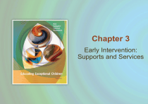 Chapter 3 Early Intervention: Supports and Services Early Intervention • Intelligence and skills are not fixed at birth. The environment surrounding children has a profound effect on their development • The purpose of early intervention is to provide necessary supports and services to optimize the child's development as early as possible. • Early intervention refers to a range of services provided to children, parents, and families during pregnancy, infancy, and/or early childhood. Copyright © Cengage Learning. All rights reserved. 3|2 Historical Overview • • • • 1900s: The belief that a person’s abilities were fixed at birth and could not be changed resulted in many children with disabilities being placed in institutions 1930s, the belief that nothing could be done to improve outcomes for children with disabilities was dramatically challenged when Drs. Harold Skeels and Harold Dye performed a research study (Noonan & McCormick, 2006). They found that children who were placed in foster homes or who were adopted fared much better than did a comparable group of children who remained in an orphanage (Skeels & Dye, 1939). The fostered-adopted group achieved normal intelligence, whereas many of the institutionalized children were classified as mentally retarded. Samuel Kirk (1950) demonstrated that preschool experience could increase the rate of mental development & the social skills of children who were classified as mentally retarded. Provisions of PL 94-157 to children with disabilities from birth to age 5. Copyright © Cengage Learning. All rights reserved. 3|3 1972: Abecedarian Study • One of the longest running studies of the importance of early intervention and continues through today. The study examined the impact of quality early child care on children from economically disadvantaged families and found modest gains of IQ points, and reading and math scores. The study also found that the experimental group was more than twice as likely to enroll in a four-year college or university. http://www.youtube.com/watch?v=8YyZ8FkF sK4 Copyright © Cengage Learning. All rights reserved. 3|4 Historical Overview In 1986, PL 99-457 was passed and extended the provisions of PL 94-157 to children with disabilities from birth to age 5. Copyright © Cengage Learning. All rights reserved. 3|5 Early Intervention Legislation • • • • Services for young children with disabilities are now referred to in IDEA 2004, Parts B and C. Part C serves children from birth to 2 and encourages states to develop comprehensive, coordinated, multidisciplinary early intervention systems. Part C also stipulates that early interventions should be provided, to the maximum extent possible, in natural environments, or settings that are typical for children who do not have disabilities (Noonan & McCormick, 2006). Children age 3 through 5 with disabilities are addressed in Part B of IDEA, which provides funds for states to ensure that all preschoolage children with disabilities receive special education and related services. Although the current literature defines early childhood intervention programs as covering from birth to 8 years of age, most programs actually divide themselves into infancy (birth to age 2), early childhood (ages 3 to 5), and early school age (ages 5 to 8). During this time period, the most influential factor in the ecology of the child is the family. Copyright © Cengage Learning. All rights reserved. 3|6 Importance of Early Intervention • Critical developmental time • Foundation for all future learning • Strengthens the parent’s capacity to meet their child’s needs Copyright © Cengage Learning. All rights reserved. 3|7 Prenatal and Neonatal Identification • • • • • • Genetic counseling : Detects potential genetic disorders. Counselor may suggest tests to determine whether a disability may exist. Prenatal testing: Alpha-fetoprotein test: a blood test taken at 16 weeks to identify the risk of having a child with a neural tube defect; sonography, the use of ultrasound, at 3 and 5 months, to view the child for potential microcephaly and neural tube defects; amniocentesis, a test in which fluid is withdrawn from the placenta at 4 to 17 weeks to determine the presence of a number of disabilities, such as Tay-Sachs disease and Down syndrome. chorionic villus biopsy, a procedure in which tissue is removed from the uterus of the pregnant woman during the first trimester. This test can be used to determine if there is evidence of potential disabilities. Because there is a high risk of miscarriage following this test, some physicians will not perform it. Copyright © Cengage Learning. All rights reserved. 3|8 How do we identify children who are in need of early intervention? • The Apgar test, developed in 1952, is still used to determine the health of a newborn infant. It measures the heart rate, respiratory effort, muscle tone, and general physical state, including skin color. Scores of 0, 1, or 2 are given in each of the five areas being measured. A below-average Apgar score (5 or less) at one and five minutes after birth is used to determine the possibility of debilitating conditions, the need for additional testing, and the need for medical intervention. http://www.youtube.com/watch?v=PkX286L5a_0 Copyright © Cengage Learning. All rights reserved. 3|9 How do we identify children who are in need of early intervention? • • • Blood and urine tests: taken within the first few minutes following birth to determine if there is a known curable disorder that should be treated immediately. One symptom associated with mental retardation is deficiency of the thyroid gland, which can lead to cretinism: A congenital condition due to thyroid hormone deficiency during fetal development and marked in childhood by dwarfed stature, mental retardation, dystrophy of the bones, and a low basal metabolism. Also called congenital myxedema, cretinoid dysplasia. The newborn behavio