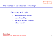 Roland Kersting kerstr@rpi.edu The Science of Information Technology Computing with Light • the processing of signals • properties of light • building a photonic computer • future trends ? Department of Physics, Applied Physics, and Astronomy 1 Roland Kersting kerstr@rpi.edu voltage voltage Signals in IT (1) (10) (5) (0) (7) (9) (0) time binary system: 01100101 Department of Physics, Applied Physics, and Astronomy time not applicable 2 Roland Kersting kerstr@rpi.edu Making a Byte out of Bits channel 1 channel 2 understanding: computing problems can be separated into processing of single bits. channel 3 channel 4 channel 5 channel 6 tools are: • transport • comparison • storage channel 7 channel 8 11000010 = 194 Department of Physics, Applied Physics, and Astronomy 3 Roland Kersting kerstr@rpi.edu Signal Processing in IT transport of bits: 0 1 0 1 1 0 input switching: 0 1 0 1 1 0 distance, connector output 0 1 0 1 1 0 0 1 0 1 1 0 input 1 0 1 0 1 1 0 logic operation switch output input 2 Department of Physics, Applied Physics, and Astronomy 4 Roland Kersting kerstr@rpi.edu What is a Bit ? Fourier transform 1.0 Amplitude (arb. units) 0.8 Signal (arb. units) one bit in frequency-domain 0.05 one bit in time-domain 0.6 0.4 0.2 0.04 0.03 0.02 0.01 0.0 0.0 0.2 0.4 0.6 0.8 1.0 Time (arb. units) Department of Physics, Applied Physics, and Astronomy 0.00 0 50 100 150 Frequency (arb. units) 5 Roland Kersting kerstr@rpi.edu The cut-off frequency 1.2 cut-off frequency 1.0 0.04 Signal (arb. units) Amplitude (arb. units) 0.05 0.03 0.02 cut-off frequency 0.01 0.8 0.6 0.4 0.2 0.0 -0.2 0.00 0 20 40 60 80 100 120 140 Frequency (arb. units) Department of Physics, Applied Physics, and Astronomy 0.2 0.4 0.6 0.8 Time (arb. units) 6 Roland Kersting kerstr@rpi.edu Electronics transport of bits: metal wire cut-off= R / L switching: Gate Source p-type S ilicon Wafer cut-off = R*C Drain Oxide n-type Department of Physics, Applied Physics, and Astronomy n-type 7 Roland Kersting kerstr@rpi.edu Cut-off frequency vs. clock frequency 0.05 1.2 cut-off frequency clock 0.04 Signal (arb. units) Amplitude (arb. units) 1.0 0.03 0.02 cut-off frequency 0.8 clock 0.6 clock 0.4 0.2 0.01 0.0 0.00 0 20 40 60 80 100 120 140 Frequency (arb. units) Department of Physics, Applied Physics, and Astronomy -0.2 0.2 0.4 0.6 0.8 Time (arb. units) 8 Roland Kersting kerstr@rpi.edu Clock Frequency (Hz) Clock Frequency of Computers 10 13 10 12 10 11 10 10 physical limit 10 9 10 8 10 7 10 6 technological limit PCs after Malone (1995) 1970 1980 1990 2000 2010 2020 2030 Year Department of Physics, Applied Physics, and Astronomy 9 Roland Kersting kerstr@rpi.edu The heat problem Department of Physics, Applied Physics, and Astronomy 10 Roland Kersting kerstr@rpi.edu Clock Frequency (Hz) Clock Frequency of Computers 10 13 10 12 10 11 10 10 physical limit 10 9 10 8 10 7 10 6 technological limit PCs after Malone (1995) 1970 1980 1990 2000 2010 2020 2030 Year Department of Physics, Applied Physics, and Astronomy 11 Roland Kersting kerstr@rpi.edu Photonics Idea: substitute electrical currents with light metal wire ons r t c ele glass fiber cut-off= R / L cut-off = ? ( 30*108 Hz ) ( 30*1012 Hz ) Department of Physics, Applied Physics, and Astronomy 12 Roland Kersting kerstr@rpi.edu Let’s build a photonic computer information modulator bit stream semiconductor laser modulator photonic switch (AND) bit stream modulator bit stream information clock output to detector Department of Physics, Applied Physics, and Astronomy 13 Roland Kersting kerstr@rpi.edu Semiconductor laser Department of Physics, Applied Physics, and Astronomy 14 Roland Kersting kerstr@rpi.edu Output of a laser rapidly oscillating electromagnetic field 1.0 = 800 nm 0.8 1 fs = 10 s = 0.000000000000001 s –15 0.6 Field (arb. units) 0.4 0.2 0.0 -0.2 -0.4 -0.6 -0.8 -1.0 0 2 4 6 8 Time (fs) Department of Physics, Applied Physics, and Astronomy 15 Roland Kersting kerstr@rpi.edu Desired: short pulses and pulse trains 1.0 3 0.8 2 Signal (arb. units) Field (arb. units) 0.6 1 0 0.4 0.2 0.0 -0.2 -0.4 -0.6 = 800 nm = 30 fs -0.8 -1.0 -1 0 20 40 60 80 100 120 Time (fs) Department of Physics, Applied Physics, and Astronomy 0 50 100 150 200 250 Time (fs) 16 Roland Kersting kerstr@rpi.edu Let’s build a photonic computer information modulator bit stream semiconductor laser modulator (AND) bit stream photonic switch modulator bit stream information clock output to detector Department of Physics, Applied Physics, and Astronomy 17 Roland Kersting kerstr@rpi.edu Opto-electronic modulation Search: Interface between optical & electrical pulses Electro-optic modulators • example liquid crystals: • get dark when electrical bias is applied • very slow • Pockels-effect: • index of refraction depends on applied voltage • very fast Department of Physics, Applied Physics, and Astronomy 18 Roland Kersting kerstr@rpi.edu Using a Mach-Zehnder interferometer t lithium tantalate Department of Physics, Applied Physics, and Astronomy 19 Roland Kersting kerstr@rpi.edu Constructive & destructive interference Field (arb. units) Field (arb. units) branch 1 branch 2 constructive interference 0 2 destructive interference 4 6 8 Time (fs) Department of Physics, Applied Physics, and Astronomy 0 2 4 6 8 Time (fs) 20 Roland Kersting kerstr@rpi.edu Integration of intensity modulators material: lithiumniobate Department of Physics, Applied Physics, and Astronomy 21 Roland Kersting kerstr@rpi.edu Let’s build a photonic computer information semiconductor laser modulator bit stream modulator bit stream photonic switch (AND) modulator bit stream information clock output to detector Department of Physics, Applied Physics, and Astronomy 22 Roland Kersting kerstr@rpi.edu All-optical switching the problem: light doesn’t interact with light Department of Physics, Applied Physics, and Astronomy 23 Roland Kersting kerstr@rpi.edu Absorption saturation idea: use matter (electrons) to mediate the light-light interaction atom