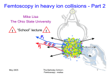 Femtoscopy in heavy ion collisions - Part 2 Mike Lisa The Ohio State University ! “School” lecture May 2005 ! The Berkeley School Femtoscopy - malisa 1 2 Outline Lecture I - basics and sanity check • Motivation (brief) • Formalism (brief reminder) – accessible geometric substructure • Some experimental details • 2 decades* of data systematics – system size: AB, |b|, Npart... – system shape: (P,b) Lecture II - dynamics (insanity check?) • data systematics [cnt’d] – boost-invariance?: Y – transverse dynamics: kT, mT – new substructure: m1≠m2 • Interpretations (& puzzles) – Messages from data itself – Model comparisons – Prelim. comparison: pp, dA • Summary * in time and in sNN May 2005 The Berkeley School - Femtoscopy - malisa Motivation Formalism Experiment Trends Models 3 HBT( s ;p T , y, b , bˆ ,m1,m 2 ,Asys ) Strongly-interacting 6Li released from an asymmetric trap O’Hara, et al, Science 298 2179 (2002) What can we learn? ? in-planeextended transverse FO shape + collective velocity evolution time estimate check independent of RL(pT) out-of-plane-extended May 2005 Teaney, TheLauret, Berkeley & School Shuryak- nucl-th/0110037 Femtoscopy - malisa Motivation Formalism Experiment Trends Models Blast wave : the truth, or something like it F. Retière , QM04 RY QuickTime™ and a TIFF (LZW) decompressor Spectra are needed to see this picture. RX v2 F. Retière & MAL PRC70 044907 (2004) • generalized anisotropic BW in ubiquitous use • consistent picture capturing essence of data • homo. region “whole source” with realistic flow gradients May 2005 QuickTime™ and a HBT TIFF (LZW) decompressor are needed to see this picture. The Berkeley School - Femtoscopy - malisa 4 Motivation Formalism Experiment Extracting FO shape/size Trends out Models side • 2nd - order oscillations in radii (n>2 negligible) • characterize each kT bin with 7 numbers: 2 R pT , cosn R ,n pT 2 R p , sin n T 2 o, s, l os R2os,0 = 0 by symmetry [Heinz, Hummel, MAL, Wiedemann PRC66, 044903] out-side in no-flow scenario... R 2y R 2x R 2y R 2x 2 R s2, 2 R s2,0 2 2 R os ,2 R s2,0 2 R o2, 2 R s2,0 U. Wiedemann PR C57 266 (1998) MAL, U. Heinz, U. Wiedemann PL B489 287 (2000) May 2005 F. Retière &The MAL Berkeley PRC70School 044907 -(2004) Femtoscopy - malisa long 5 Motivation Formalism Experiment Trends Models Extracting FO shape/size • 2nd - order oscillations in radii (n>2 negligible) • characterize each kT bin with 7 numbers: 2 R pT , cosn R ,n pT 2 R p , sin n T 2 o, s, l os R2os,0 = 0 by symmetry [Heinz, Hummel, MAL, Wiedemann PRC66, 044903] /2 in no-flow scenario... R 2y R 2x R 2y R 2x 2 R s2, 2 R s2,0 2 2 R os ,2 R s2,0 2 R o2, 2 R s2,0 U. Wiedemann PR C57 266 (1998) MAL, U. Heinz, U. Wiedemann PL B489 287 (2000) continues to be good approximation even with flow! (~30%) May 2005 F. Retière &The MAL Berkeley PRC70School 044907 -(2004) Femtoscopy - malisa 6 Motivation Formalism Experiment Trends Models Extracting FO shape/size • 2nd - order oscillations in radii (n>2 negligible) • characterize each kT bin with 7 numbers: 2 R pT , cosn R ,n pT 2 R p , sin n T 2 o, s, l os R2os,0 = 0 by symmetry [Heinz, Hummel, MAL, Wiedemann PRC66, 044903] QuickTime™ and a TIFF (LZW) decompressor are needed to see this picture. in no-flow scenario... R 2y R 2x R 2y R 2x 2 R s2, 2 R s2,0 2 2 R os ,2 R s2,0 2 R o2, 2 R s2,0 U. Wiedemann PR C57 266 (1998) MAL, U. Heinz, U. Wiedemann PL B489 287 (2000) continues to be good approximation even with flow! (~30%) May 2005 F. Retière &The MAL Berkeley PRC70School 044907 -(2004) Femtoscopy - malisa 7 Motivation Formalism Experiment Trends Models Measured final source shape STAR, PRL93 012301 (2004) central collisions mid-central collisions peripheral collisions Expected evolution: May 2005 The Berkeley School - Femtoscopy - malisa 8 Motivation Formalism Experiment Trends Models Evolution of size and shape R s;p ,y, b ,AB, ,m ,m bˆ T 1 2 @RHIC STAR PRC71 044906 (2005) STAR PRL93 012301 (2004) Rfinal/Rinitial 2.5 QuickTime™ and a TIFF (LZW) decompressor are needed to see this picture. 2 1.5 1 0 100 200 300 ~ x2 size increase Npart 400 ~ 1/2 shape reduction Initial size/shape estimated by Glauber calculation May 2005 The Berkeley School - Femtoscopy - malisa 9 10 Evolution ahead Detour May 2005 The Berkeley School - Femtoscopy - malisa Motivation Formalism Experiment Trends Models asHBT systematics (1/100 * sNN) R • = 0-2 (not 0-) first-order plane used s;p ,y, b ,AB, ,m ,m T bˆ 1 2 Au+Au sNN = 2.3 GeV; b5 fm • similar oscillations in purely transverse radii • out-long & side-long? • new symmetry! E895, PLB496 1 (2000) May 2005 The Berkeley School - Femtoscopy - malisa 11 Motivation Formalism Experiment Trends out-side-long versus x-y-z side •Source in b-fixed system: (x,y,z) •Space/time entangled in pair system (xO,xS,xL) y˜ y˜ y˜ cos2 y˜ sin 2 R 2o 12 y˜ 2 x˜ 2 cos2 R 2s R 2os 1 2 1 2 2 2 x˜ 2 x˜ 2 Models y 12 K out x 1 2 2 x˜ 2 2 ˜t 2 1 2 2 x˜ 2 b R 2l z˜ 2 L2 ˜t 2 R 2ol x˜ z˜ cos R 2sl x˜ z˜ sin May 2005 (several terms vanish @ pT = y = 0) U. Wiedemann, PRC 57, 266 (1998) MAL, U. Heinz, U. Wiedemann PLB 489, 287 (2000) The Berkeley School - Femtoscopy - malisa 13 First-order information in HBT() y 2nd-harmonic oscillations from elliptical transverse shape ~ x2 ~y 2 b y˜ y˜ y˜ cos2 y˜ sin 2 R 2o 12 y˜ 2 x˜ 2 cos2 R 2s R 2 os 1 2 1 2 2 2 x˜ 2 x˜ 2 x -harmonic oscillations: 1spatial tilt angle q 1 2 2 x˜ 2 2 ˜t 2 1 2 2 x˜ 2 st S y R 2l z˜ 2 L2 ˜t 2 x R 2ol x˜ z˜ cos qs R 2sl x˜ z˜ sin z (Beam) May 2005 Coordinate space! The Berkeley School - Femtoscopy - malisa 14 Data: - correlation functions Au(4 AGeV)Au, b4-8 fm 2D projections C(q) 1D projections, =45° out side long lines: projections of 3D Gaussian fit q i q j R ij2 C(q, ) 1 e • 6 components to radius tensor: i, j = o,s,l E895, PLB 496 1 (2000) May 2005 The Berkeley School - Femtoscopy - malisa Cross-term radii Rol, Ros, Rsl quant