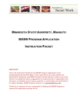 MINNESOTA STATE UNIVERSITY, MANKATO BSSW PROGRAM APPLICATION INSTRUCTION PACKET IMPORTANT: This is the Instruction Packet for the BSSW Program Application to the Undergraduate Social Work Major. These instructions are being ‘piloted’ for Spring 2015. Applicants and BSSW Program Faculty Advisors, please note areas that are not explained clearly, suggestions for improvements in organization and structure, or problems such as typos, grammar, or punctuation and send them to Dr. Debra Gohagan, BSSW Program Director, at d.gohagan@mnsu.edu Thank you in advance for your cooperation in helping the BSSW Program to improve the application process for all. Dear BSSW Program Applicant: Thank you for your interest in the Bachelor of Science in Social Work (BSSW) Program. Applying to this major is a serious professional decision; one to which we know you have given much thought and effort. Acceptance to the social work program represents a major step in your life. It is also a statement of the BSSW faculty’s belief in your academic readiness for the advanced curriculum as well as our trust that you are ready to commit to the highest level of professional and ethical practice standards as a student and as a graduate of MSU, Mankato’s Department of Social Work’s BSSW Program. The application to the major is very detailed. It is designed to assist you to demonstrate to the social work faculty that you have met an established set of rigorous expectations and training and that you are well-prepared to continue your development as a generalist social work practitioner It is in your best interest to begin the process well in advance of the application deadline. Successful applicants to the social work program have demonstrated through their academic and pre-professional accomplishments their commitment to the profession of social work. Graduates of Minnesota State University, Mankato’s Department of Social Work make significant and lasting contributions to the quality of life for the citizens and communities they serve. We look forward to your future as a generalist social work practitioner. Sincerely, Department of Social Work Faculty Minnesota State University Mankato is committed to providing equal education and employment opportunities to all persons and does not discriminate on the basis of race, religion, color, veteran’s status, national origin, sex, sexual orientation, age, marital status, physical and mental disability, creed, status due to receipt of public assistance, or any other group against which discrimination is prohibited by Title VII of the Civil Rights Act of 1964, Title IX of the Education Amendments of 1972, Minnesota Statute Chapter 363, and other applicable state or federal laws, or State University System policy . 2 BSSWProgram. ApplicationInstructions. Jan2015. Dear BSSW Program Student Applicant: Read this BSSW Program Application Instruction Packet carefully before you begin to complete the BSSW Program application. It contains detailed information about each form with tips and instructions for all items. THE BSSW PROGRAM APPLICATION INSTRUCTIONS The BSSW Program Instruction Packet (which you are reading) has instructions for the following application components: 1. The BSSW Academic & Professional Behaviors Statement of Responsibilities & Contract Form which must be signed and dated and accompany the application. 2. Social Work Essays 3. The BSSW Program Application which also contains the Cover Letter and checklist form re: documents attached Form Request for Exceptions, Notice of Academic & Behavior Concerns, and Supporting Letter Form 4. How to Calculate Social Work GPAs Worksheets. (will be inserted when available). BSSW ACADEMIC & PROFESSIONAL BEHAVIORS STATEMENT OF RESPONSIBILITIES & CONTRACT FORM Students who want to be generalist social work practitioners must be fully informed of the commitment they are making to the legal, professional, and client community and must be prepared to accept the responsibility and the consequences of this commitment. Read the BSSW Academic and Professional Behaviors Statement of Responsibilities document CAREFULLY and THOUGHTFULLY. Follow and read ALL links to student handbooks and professional codes of ethics that are in this document. BSSW Program faculty take our academic and professional responsibilities very seriously and we expect the same from our students. This document MUST BE signed, dated, and submitted with your application to the BSSW Program. If this document is not submitted with your application or is submitted but not signed, your application to the BSSW Program will NOT be considered. 3 BSSWProgram. ApplicationInstructions. Jan2015. BSSW APPLICATION ESSAYS The BSSW Program application requires that applicants write three (3) essays. These ESSAYS provide applicants the opportunity to demonstrate their academic readiness, their professional development, and their understanding of the social work profession and generalist social work practice. Undergraduate students who become generalist social work practitioners must be able to communicate clearly, orally and in written form, their professional worldview and understanding of the knowledge, values, and skills of the profession. Successful student applicants to the BSSW Program will identify and assess their strengths and challenges as a learner and, in the future, as a generalist social work practitioner. Students will define generalist social work practice and possess a beginning knowledge of the theories, perspectives, and models that are the foundation of generalist social work practice. Students will discuss personal and pre-professional development in relationship to the social work professional value base, ethics, practice behaviors and attitudes. Finally, students will demonstrate that they value the role of diversity in our society, understand the role that privilege plays in their lives, and commit to advocacy and social justice. Program Evaluation of th