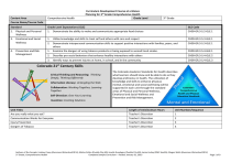 Content Area Comprehensive Health Curriculum Development Course at a Glance Planning for 3rd Grade Comprehensive Health Grade Level 3rd Grade Course Name/Course Code Standard Grade Level Expectations (GLE) GLE Code 2. Physical and Personal Wellness 1. Demonstrate the ability to make and communicate appropriate food choices CH09-GR.3-S.2-GLE.1 3. Emotional and Social Wellness 1. Utilize knowledge and skills to treat self and others with care and respect CH09-GR.3-S.3-GLE.1 2. Demonstrate interpersonal communication skills to support positive interactions with families, peers, and others CH09-GR.3-S.3-GLE.1 Prevention and Risk Management 1. Examine the dangers of using tobacco products or being exposed to second hand smoke. CH09-GR.3-S.4-GLE.1 2. Describe pro-social behaviors that enhance healthy interactions with others CH09-GR.3-S.4-GLE.2 3. Identify ways to prevent injuries at home, in school, and in the community CH09-GR.3-S.4-GLE.3 4. Colorado 21st Century Skills Critical Thinking and Reasoning: Thinking Deeply, Thinking Differently Invention Information Literacy: Untangling the Web Collaboration: Working Together, Learning Together Self-Direction: Own Your Learning The Colorado Academic Standards for Health describes what learners should know and be able to do as they develop proficiency in health. The utilization of knowledge and skills to enhance physical, mental, emotional and social well-being will be Colorado’s supported in each unit through the standard Comprehensive areas of Physical and Personal Wellness, Health and Physical Emotional and Social Wellness and Education Standards Prevention and Risk Management. Invention: Creating Solutions Mental and Emotional Unit Titles Length of Unit/Contact Hours Unit Number/Sequence Are you really what you eat? Teacher’s Discretion 1 Communication Works for Everyone Teacher’s Discretion 2 Injury Prevention Teacher’s Discretion 3 Dangers of Tobacco Teacher’s Discretion 4 Authors of the Sample: Lindsey Casey (Gunnison Watershed RE1J); Melisa Cellan (Pueblo City 60); Janelle Guadagno (Pueblo City 60); Jamie Hurley (RMC Health); Megan Wells (Gunnison Watershed RE1J) 3rd Grade, Comprehensive Health Complete Sample Curriculum – Posted: January 31, 2013 Page 1 of 9 Curriculum Development Overview Unit Planning for 3rd Grade Comprehensive Health Unit Title Are you really what you eat? Focusing Lens(es) Balance Inquiry Questions (EngagingDebatable): Length of Unit Standards and Grade Level Expectations Addressed in this Unit Teacher’s Discretion CH09-GR.3-S.2-GLE.1 How can you balance a friendship if you disagree about food choices? (CH09-GR.3-S.2-GLE.1-EO.e;IQ.4) How can the things you see on television or in magazines influence your feelings and choices about food? (CH09-GR.3-S.2-GLE 1EO.e;IQ.5;N.1) What would happen if we only ate our favorite foods? (CH09-GR.3-S.2-GLE 1-EO.d;N.2) What does the saying you are what you eat mean? Is it true? (CH09-GR.3-S.2-GLE 1-EO.c;N.2) Unit Strands Physical and Personal Wellness Concepts Communication, Decision-making, Health, Influences, Nutrition, Moderation, Refusal Skills, Components, Balance Generalizations My students will Understand that… Guiding Questions Factual Conceptual Food intake and a balance of physical activity support overall health. (CH09-GR.3-S.2-GLE.1-EO.c;RA.1) How does a person know when to stop eating? (CH09GR.3-S.2-GLE.1-EO.d;IQ.1;RA.1) How does a person know if I am balancing food intake and physical activity? (CH09-GR.3-S.2-GLE.1EO.d;IQ.1;RA.1;N.2) How do I determine how much food to put on my plate? (CH09-GR.3-S.2-GLE.1-RA.1) Various (positive and negative) influences impact a person’s ability to make responsible decisions regarding healthy food choices. (CH09-GR.3-S.2-GLE.1-EO.e;IQ.5;RA 1;N.1,2) What are positive and negative influences? (CH09-GR.3S.2-GLE.1-EO.e;IQ.5;N.1) What are factors that influence what one eats? (CH09GR.3-S.2-GLE.1-EO.e;IQ.5;N.1) Have factors that influence eating changed over time and place? (CH09-GR.3-S.2-GLE.1-EO.e;IQ.5;,N.1) How does culture and geography influence what we eat? (CH09-GR.3-S.2-GLE.1-EO.e;IQ.5;N.1) Accurate dietary information guides healthy meal planning. (CH09-GR.3-S.2-GLE.1-EO.b;RA.1) What are the food groups? (CH09-GR.3-S.2-GLE.1-EO.b) What are the key components to a healthy meal? (CH09-GR.3-S.2-GLE.1-EO.b) How do you identify healthy foods? (CH09-GR.3-S.2GLE.1-EO.a,b;N.2) What can I do if I don’t shop for food at home? (CH09GR.3-S.2-GLE.1-EO.b;N.2) Do other countries have different food groups? (CH09GR.3-S.2-GLE.1-EO.b) If nutritional information is listed on a food package does it mean it is true? (CH09-GR.3-S.2-GLE.1EO.e;IQ.5;N.1) Authors of the Sample: Lindsey Casey (Gunnison Watershed RE1J); Melisa Cellan (Pueblo City 60); Janelle Guadagno (Pueblo City 60); Jamie Hurley (RMC Health); Megan Wells (Gunnison Watershed RE1J) 3rd Grade, Comprehensive Health Complete Sample Curriculum – Posted: January 31, 2013 Page 2 of 9 Curriculum Development Overview Unit Planning for 3rd Grade Comprehensive Health The identification of healthy foods provides an essential first step to eating healthy, developing effective communication skills, and making good decisions (CH09GR.3-S.2-GLE.1-EO.a,b,c, d;IQ.1,2,3,4,;RA 1;N.1,2) What is a good model for decision-making? (CH09-GR.3-S.2-GLE.1-EO.d-RA.1-N.2) How does a person effectively communicate the desire to make healthy food choices? (CH09-GR.3-S.2GLE.1-EO.d;IQ.2;N.2) Why do I need someone to model healthy eating in order to make nutritional decisions? (CH09-GR.3-S.2-GLE.1EO.e-N.2) What does communication have to do with what I eat? (CH09-GR.3-S.2-GLE.1-EO.d;IQ.2;N.2) Critical Content: Key Skills: My students will Know… My students will be able to (Do)… Nutritious food types (CH09-GR.3-S.2-GLE.1-EO.a,b;IQ.1,2;N.2) Identification of healthy vs. unhealthy food choices (CH09-GR.3-S.2-GLE.1EO.a,b;IQ.1,2,;N.2) Identification of proper food portions (CH09-GR.3-S.2-GLE.1EO.c;IQ.1,3,