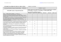 St. Cloud State University 8710.5400 Special Education: Developmental Disabilities 8710.5400 TEACHERS OF SPECIAL EDUCATION Professional Education Program Evaluation Report FORM I-C MATRIX (PEPER II) 8710.5400 Teachers of Special Education MATRIX Form I-C Identify coding used to indicate placement or assignment of standards here: (example: K=knowledge, A= assessed) / K = knowledge, U = understanding,, Skills Insert COURSE NUMBER & ID below SPED 200 SPED 2_503 SPED 2_504 Subp. 3. Subject matter standard. A candidate for licensure as a teacher of special education: developmental disabilities must complete a preparation program under subpart 2, item C, that must include the candidate's demonstration of the knowledge and skills in items A to E. A. A teacher of special education: developmental disabilities understands the central concepts, tools of inquiry, and history and context of developmental disabilities as a foundation on which to base practice. The teacher must understand: (1) historical and philosophical foundations, legal bases, and contemporary issues pertaining to services to and the education of children and youth with a broad range of cognitive impairments and deficits in adaptive behavior (2) the etiology, characteristics, and classifications of developmental disabilities (3) current educational definitions, identification criteria and labeling issues, and entrance and exit criteria for services pertaining to students with developmental disabilities; (4) general developmental, academic, social, and functional characteristics of individuals with developmental disabilities as they relate to levels of support needed; (5) research-based theories of behavior problems exhibited by individuals with developmental disabilities; (6) social-emotional aspects of developmental disabilities, including adaptive behavior, social competence, social isolation, and learned helplessness and the impact on family and community relationships; (7) impact of multiple disabilities on learning and behavior; and (8) medical aspects and terminology of cognitive impairments, disabilities, and their implications for learning. K SPED 338 SPED 339 SPED 4_505 K K K K K K U St. Cloud State University 8710.5400 Special Education: Developmental Disabilities SPED 200 B. A teacher of special education: developmental disabilities understands referral, assessment, planning, and placement procedures specific to teaching students with developmental disabilities. The teacher must understand: (1) referral and intervention procedures; (2) use, limitations, ethical concerns, administration, and interpretation of formal and informal assessments for students with developmental disabilities and how to effectively communicate the results to the students, families, teachers, and other professionals; (3) factors that may influence the over- and under-representation of culturally or linguistically diverse students in programs for students with developmental disabilities; (4) how to adapt and modify existing assessment tools and methods to accommodate the unique abilities and needs of students with developmental disabilities; (5) how to interview, gather, and maintain information from parents, families, teachers, and other professionals for the purpose of assessment and planning, developing, implementing, and evaluating individual education programs; (6) how to assess and accommodate for architectural barriers in the educational setting; (7) how to use and maintain orthotic, prosthetic, assistive, and adaptive equipment effectively; (8) uses and sources of appropriate materials, equipment, and adaptive, augmentative, and assistive technologies to meet the needs of children and youth with developmental disabilities; (9) how to manage student support needs including the medical complications and implications of tube feeding, catheterization, seizure management, and CPR; (10) various educational models and setting options and the selection of appropriate options based on the needs of the student; and (11) how to design individual plans that integrate assessment results, family priorities, resources, and concerns and that incorporate, when appropriate, nonacademic and academic goals and the appropriate use of adaptive augmentative, and assistive technologies. C. A teacher of special education: developmental disabilities understands how to use individual education program plans to design and implement developmentally appropriate instruction for students with developmental disabilities. The teacher must understand how to: SPED 2_503 SPED 2_504 SPED 338 SPED 339 SPED 4_505 K St. Cloud State University 8710.5400 Special Education: Developmental Disabilities SPED 200 (1) apply research-supported instructional strategies and practices, including functional developmental disabilities skills approach, communitybased instruction, task analysis, multisensory, and concrete or manipulative techniques; (2) select, adapt, and implement developmentally appropriate classroom management strategies for students with developmental disabilities; (3) establish classroom environments to meet the physical, cognitive, cultural, and communication needs of children and youth with developmental disabilities; (4) design, adapt, modify, implement, and evaluate instructional programs, processes, and materials to enhance student participation in domestic and family, school, recreation or leisure, community, and work life; (5) use instructional strategies, adaptive technologies, and sources of specialized materials for students with developmental disabilities; (6) assist students in using and maintaining alternative and augmentative communication systems (7) implement recommended mobility techniques; (8) stimulate language development, teach basic academic and literacy skills, and integrate art, music, and body movement into the instruction; (9) manage student self-care, health, and safety needs; (10) construct instructional sequences to teach transition skills based 