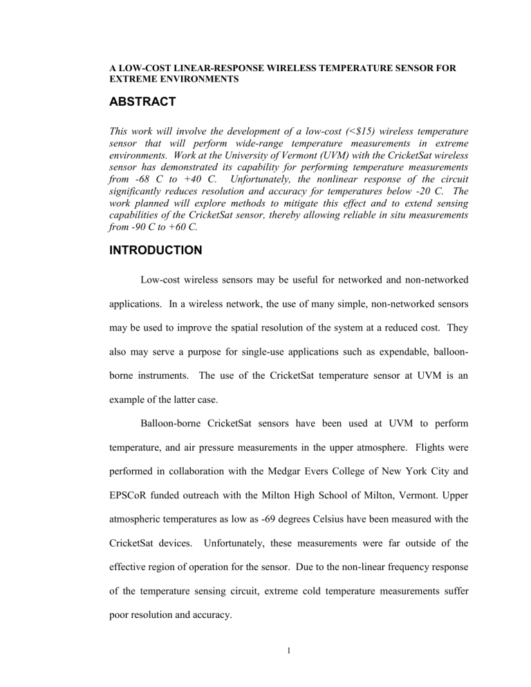 This work will involve the development of a low-cost (<$15) wireless temperature sensor that will perform wide-range temperature measurements in extreme environments. Work at the University of Vermont (UVM) with the CricketSat wireless sensor has demonstrated its capability for performing temperature measurements from -68 C to +40 C. Unfortunately, the nonlinear response of the circuit significantly reduces resolution and accuracy for temperatures below -20 C. The work planned will explore methods to mitigate this effect and to extend sensing capabilities of the CricketSat sensor, thereby allowing reliable in situ measurements from -90 C to +60 C.