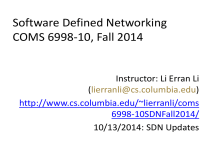 Software Defined Networking COMS 6998-10, Fall 2014 Instructor: Li Erran Li (lierranli@cs.columbia.edu) http://www.cs.columbia.edu/~lierranli/coms 6998-10SDNFall2014/ 10/13/2014: SDN Updates Midterm Date • Two options – Oct 27 – Nov 10 • A quick show of hands • Result: midterm on Nov 10 10/13/14 Software Defined Networking (COMS 6998-10) 2 Outline • Announcement: project proposal due Oct 23 • Review of Previous Lecture – Verification of network properties – Verification of controller correctness – Verification of software data plane • SDN Updates – Per Switch Consistent and Minimal Updates – Network-wide Updates • Consistent Updates • Congestion-Free Updates • Network Partition 10/13/14 Software Defined Networking (COMS 6998-10) 3 Review of Previous Lecture (Cont’d) • NetPlumber graph: – Creates a dependency graph of all forwarding rules in the network and uses it to verify policy – Nodes: forwarding rules in the network – Directed Edges: next hop dependency of rules and intra table dependency 10/13/14 Switch 1 Switch 2 R1 R 2 Software Defined Networking (COMS 6998-10) 4 Review of Previous Lecture (Cont’d) 0 1 X X 1 001 1 0XX S S Where is the missing edge? Example NetPlumber graph 10/13/14 Software Defined Networking (COMS 6998-10) Source: P. Kazemian, Stanford 5 Review of Previous Lecture (Cont’d) 0 1 X X 1 001 1 0XX S S Example NetPlumber graph 10/13/14 Software Defined Networking (COMS 6998-10) Source: P. Kazemian, Stanford 6 Review of Previous Lecture (Cont’d) The System Frenetic DSL Domain-specific language • predicates and policies • monitoring • mac learning • network address translation implemented using Frenetic implemented using OX Ox OCaml embedding • predicates and policies • queries OCaml OpenFlow Platform • similar to Nox, Pox, Floodlight, etc. 10/13/14 Software Defined Networking (COMS 6998-10) Source: Nate Foster, Cornell 7 Review of Previous Lecture (Cont’d) Certified NetKAT Controller • Each level of abstraction formalized in Coq • Machine-checked proofs that the transformations between levels preserve semantics • Code extracted to OCaml and deployed with real switch hardware 10/13/14 NetKAT Compiler Optimizer Flow tables Run-time system OpenFlow messages Software Defined Networking (COMS 6998-10) Source: Nate Foster, Cornell 8 Review of Previous Lecture (Cont’d) Verification of software dataplane • Proof of bounded execution property – no more than X instructions per packet • Proof of crash-freedom property – No packet will cause the pipeline to abort • Need to handle – Pipelines – Loops (may exceed time constraint) – Data structures (can crash) 10/13/14 Software Defined Networking (COMS 6998-10) 9 intrusion detection application acceleration IP forwarding m elements do not share mutable state verification time ∼ 2 n m 10 intrusion detection application acceleration ... assert(src != dst); IP forwarding ... do not share mutable state verification time ∼ m 2 n 11 Review of Previous Lecture (Cont’d) Pipeline decomposition • Rule: pipeline structure - distinct packet-processing elements - do not share mutable state • Effect: compose at the element level - can reduce #paths from ∼ 2 n m - to ∼ m 2 n 12 IP options 13 option #1 option #2 ... option #m m options verification time ∼ n m 14 option #1 option #2 ... option #m m options little state sharing across iterations ... verification time ∼ m n 15 Review of Previous Lecture (Cont’d) Loop decomposition • Rule: “mini-pipeline” structure - little state shared across iterations - made explicit by the programmer • Effect: compose at the iteration level - can reduce #paths from ∼ n m - to ∼ m n 16 Review of Previous Lecture (Cont’d) Verified data structures • Use pre-allocated arrays - no dynamic memory (de)allocation - hash table, longest prefix match • Trade-off memory for “verifiability” - at least as fast (array lookups) - but larger memory footprint (pre-allocation) 17 Outline • Announcement: project proposal due Oct 23 • Review of Previous Lecture – Verification of network properties – Verification of controller correctness – Verification of software data plane • SDN Updates – Per Switch Consistent and Minimal Updates – Network-wide Updates • Consistent Updates • Congestion-Free Updates • Network Partition 10/13/14 Software Defined Networking (COMS 6998-10) 18 Updates Happen Network Updates •Maintenance •Failures •ACL Updates Desired Invariants •No black-holes •No loops •No security violations 19 10/13/14 Software Defined Networking (COMS 6998-10) 19 Distributed Programming: non-atomic table updates Priority Predicate Update one Switch Action ⊆ Priority Predicate Action 10 SSH Drop ⊆ Priority Predicate Action 5 dst_ip = H1 Fwd 1 Priority Predicate Action 10 SSH Drop 5 dst_ip = H1 Fwd 1 update re-ordering Priority Predicate Action 5 dst_ip = H1 Fwd 1 5 dst_ip = H2 Fwd 2 10/13/14 ⊆ Priority Predicate Action 10 SSH Drop 5 dst_ip = H1 Fwd 1 5 dst_ip = H2 Fwd 2 Software Defined Networking (COMS 6998-10) Source: Nate Foster, Cornell 20 Update one Switch (Cont’d) • Solution: insert barrier messages to enforce partial ordering of rule updates • Question: what is the algorithm? 10/13/14 Software Defined Networking (COMS 6998-10) 21 Minimal Number of Updates • Minimum dependency can be inferred from rule patterns Pattern Priority A <1, 2, *> 5 B <*, 2, 3> 4 C <1, *, 4> 4 D <1, *, 3> 3 E <*, *, 4> 3 F <*, *, 3> 2 Old 10/13/14 A B D F A C E B D F G C E Software Defined Networking (COMS 6998-10) Pattern Priority A <1, 2, *> 5 B <*, 2, 3> 4 G <*, 2, 4> 3 C <1, *, 4> 2 D <1, *, 3> 3 E <*, *, 4> 1 F <*, *, 3> 2 New 22 Minimal Number of Updates (Cont’d) • With minimum dependency graph, one can always generate minimum-size flowtable update if priority value is continuous A Pattern Priority A <1, 2, *> 5 B <*, 2, 3> 4 C <1, *, 4> 4 D <1, *, 3> 3 E <*, *, 4> 3 F <