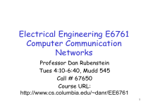 Electrical Engineering E6761 Computer Communication Networks Professor Dan Rubenstein Tues 4:10-6:40, Mudd 545 Call # 67650 Course URL: http://www.cs.columbia.edu/~danr/EE6761 1 Today Course Overview / Structure / Handouts Intro Socket Programming 2 Overview Bookmark the course web-page! http://www.cs.columbia.edu/~danr/EE6761 Syllabus Office hours: Mon 3-4? TA Mid-term date & time Survey HW #0 – due tomorrow - not graded! PA #1 3 Introduction (Reading: Kurose-Ross Chap 1) goal: get context, overview, “feel” of networking more depth, detail later in course approach: descriptive use Internet as example Overview: what’s the Internet what’s a protocol? network edge network core access net, physical media performance: loss, delay protocol layers, service models backbones, NAPs, ISPs history ATM network 4 What’s the Internet: “nuts and bolts” view millions of connected computing devices: hosts, end-systems pc’s workstations, servers PDA’s, phones, toasters router server mobile local ISP running network apps communication links workstation regional ISP fiber, copper, radio, satellite routers: forward packets (chunks) of data thru network company network 5 What’s the Internet: “nuts and bolts” view protocols: control sending, receiving of msgs e.g., TCP, IP, HTTP, FTP, PPP Internet: “network of networks” router server mobile local ISP loosely hierarchical public Internet versus private intranet Internet standards RFC: Request for comments IETF: Internet Engineering Task Force see class web-page for pointers to URLs workstation regional ISP company network 6 What’s the Internet: a service view communication infrastructure enables distributed applications: WWW, email, games, ecommerce, database, voting, more? communication services provided: connectionless connection-oriented 7 What’s a network protocol? all communication activity in Internet governed by protocols protocols define format, order of msgs sent and received among network entities, and actions taken on msg transmission, receipt … specific msgs sent … specific actions taken when msgs received, or other events 8 What’s a protocol? a human protocol and a computer network protocol: Hi TCP connection req. Hi TCP connection reply. Got the time? Get http://gaia.cs.umass.edu/index.htm 2:00 <file> time 9 A closer look at network structure: network edge: applications and hosts network core: routers network of networks access networks residential institutional mobile physical media wire (digital / analog) wireless (radio / cellular) 10 The network edge: end systems (hosts): run application programs e.g., WWW, email at “edge of network” client/server model client host requests, receives service from server e.g., WWW client (browser)/ server; email client/server peer-peer model: host interaction symmetric e.g.: teleconferencing 11 Network edge: connection-oriented service Goal: data transfer between end sys. handshaking: setup (prepare for) data transfer ahead of time set up “state” in two communicating hosts TCP - Transmission Control Protocol Internet’s de-facto connection-oriented service TCP service [RFC 793] reliable, in-order byte- stream data transfer dealing with loss: acknowledgements and retransmissions flow control: sender won’t overwhelm receiver congestion control: senders “slow down sending rate” when network congestion detected 12 Network edge: connectionless service Goal: data transfer between end systems same as before! UDP - User Datagram Protocol [RFC 768]: Internet’s connectionless service unreliable data transfer no flow control no congestion control App’s using TCP: HTTP (WWW), FTP (file transfer), Telnet (remote login), SMTP (email) App’s using UDP: streaming media, teleconferencing, Internet telephony 13 The Network Core mesh of interconnected routers the fundamental question: how is data transferred through net? circuit switching: dedicated circuit per call: telephone net packet-switching: data sent thru net in discrete “chunks” 14 Network Core: Circuit Switching End-end resources reserved for “call” link bandwidth, switch capacity dedicated resources: no sharing circuit-like (guaranteed) performance call setup required 15 Network Core: Circuit Switching network resources (e.g., bandwidth) divided into “pieces” pieces allocated to calls resource piece idle if not used by owning call (no sharing) dividing link bandwidth into “pieces” frequency division time division code division 16 Network Core: Packet Switching each end-end data stream divided into packets user A, B packets share network resources each packet uses full link bandwidth resources used as needed, Bandwidth division into “pieces” Dedicated allocation Resource reservation resource contention: aggregate resource demand can exceed amount available congestion: packets queue, wait for link use store and forward: packets move one hop at a time transmit over link wait turn at next link 17 Network Core: Packet Switching 10 Mbs Ethernet A B statistical multiplexing C 1.5 Mbs queue of packets waiting for output link D 45 Mbs E 18 Packet switching versus circuit switching Packet switching allows more users to use network! 1 Mbit link each user: 100Kbps when “active” active 10% of time circuit-switching: 10 users N users 1 Mbps link packet switching: with 35 users, probability > 10 active less that .004 19 Packet switching versus circuit switching Is packet switching a “slam dunk winner?” Great for bursty data resource sharing no call setup Excessive congestion: packet delay and loss protocols needed for reliable data transfer, congestion control Q: How to provide circuit-like behavior? bandwidth guarantees needed for audio/video apps still an unsolved problem (chapter 6 of KuroseRoss) 20 Packet-switched networks: routing Goal: move packets among routers from source to destination we’ll study several path selection algorithms (chapter 4) datagram network: destination address determ